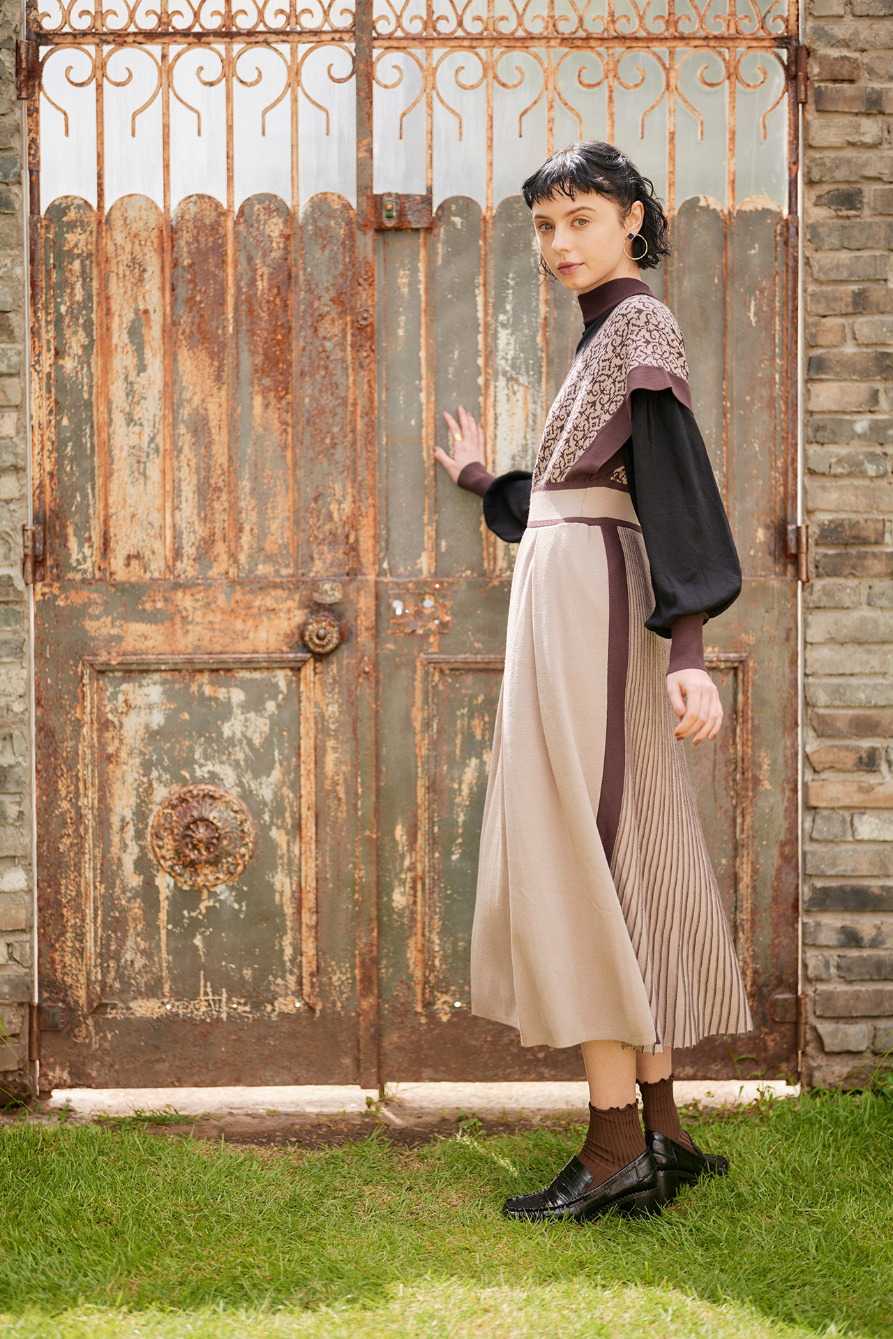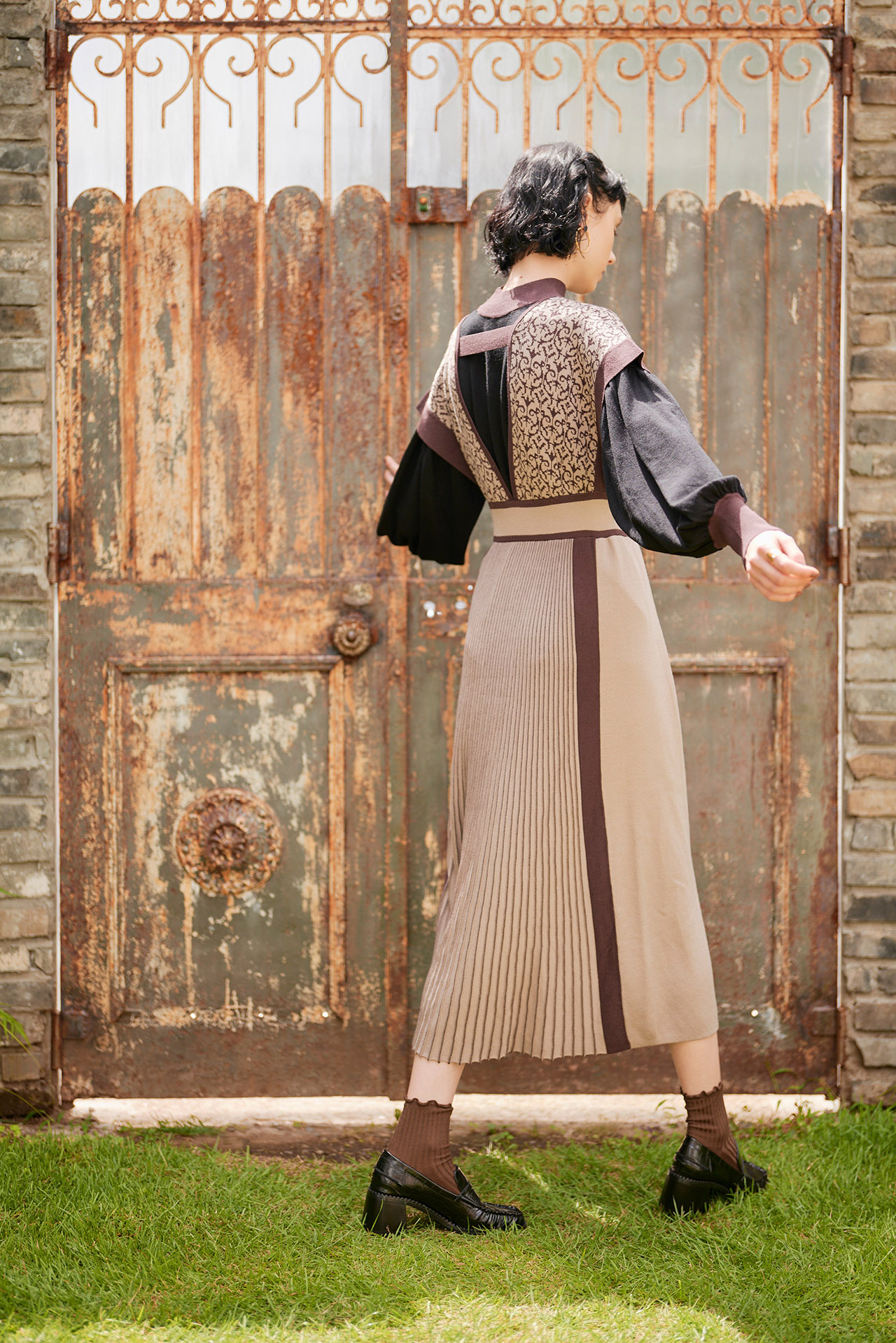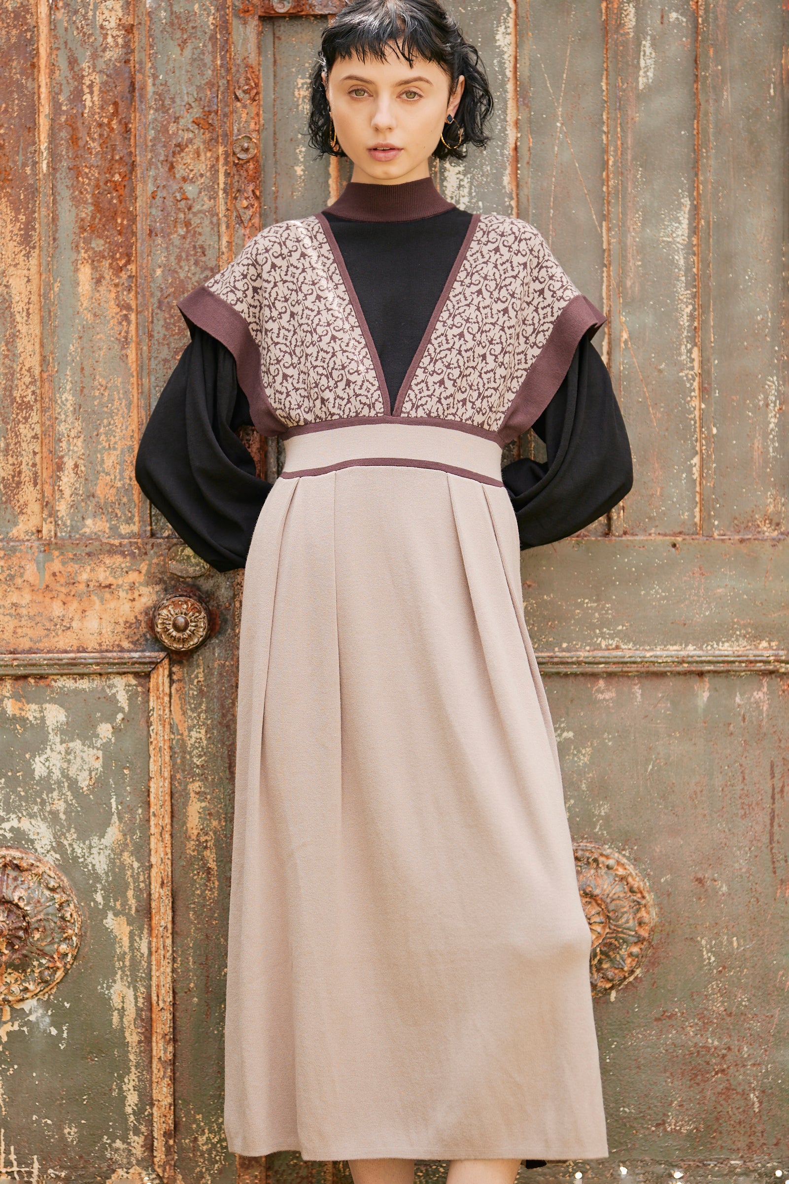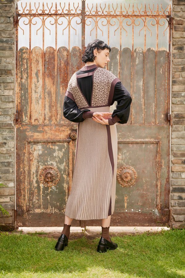 様々な手法のニットをミックスしたワンピースと、