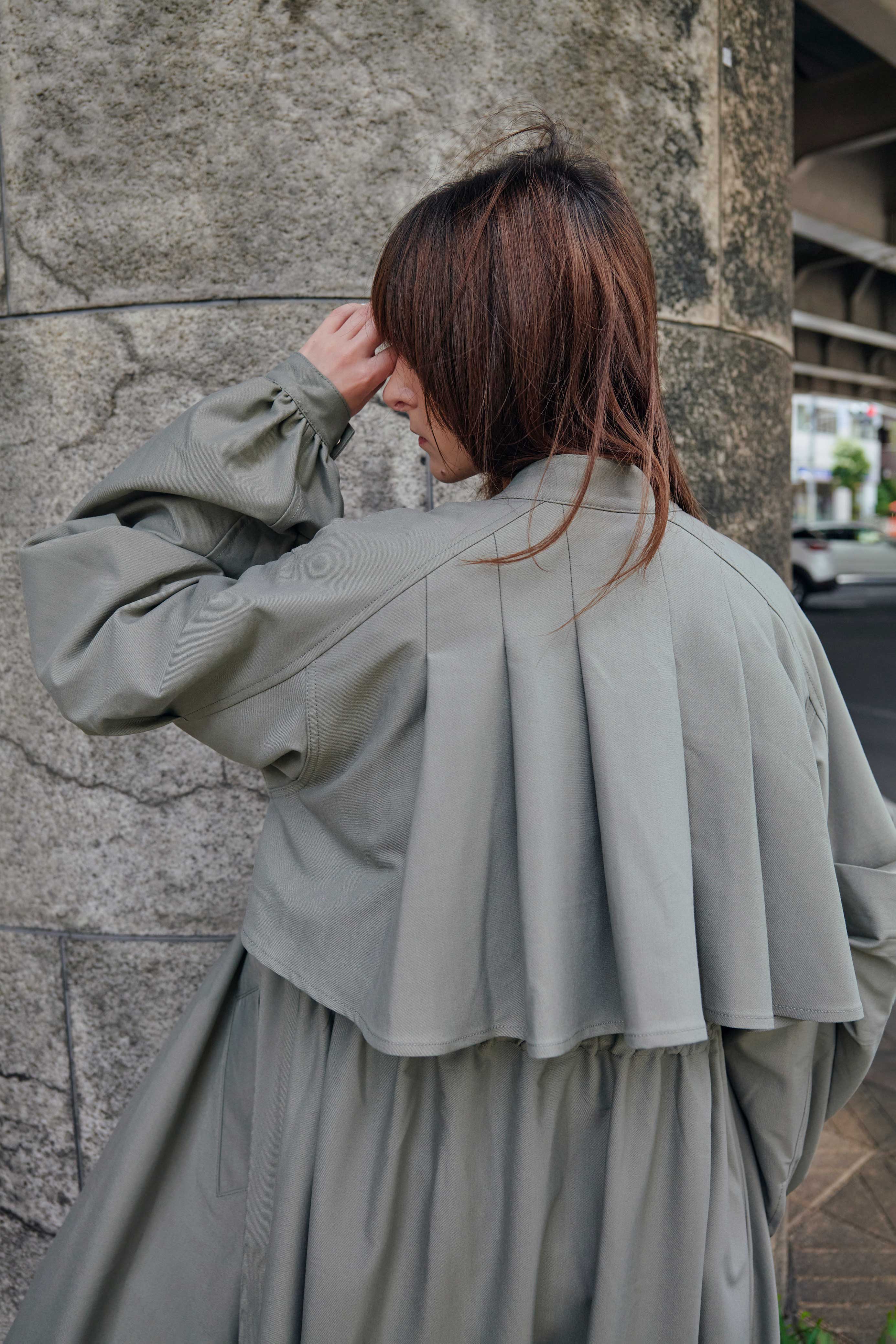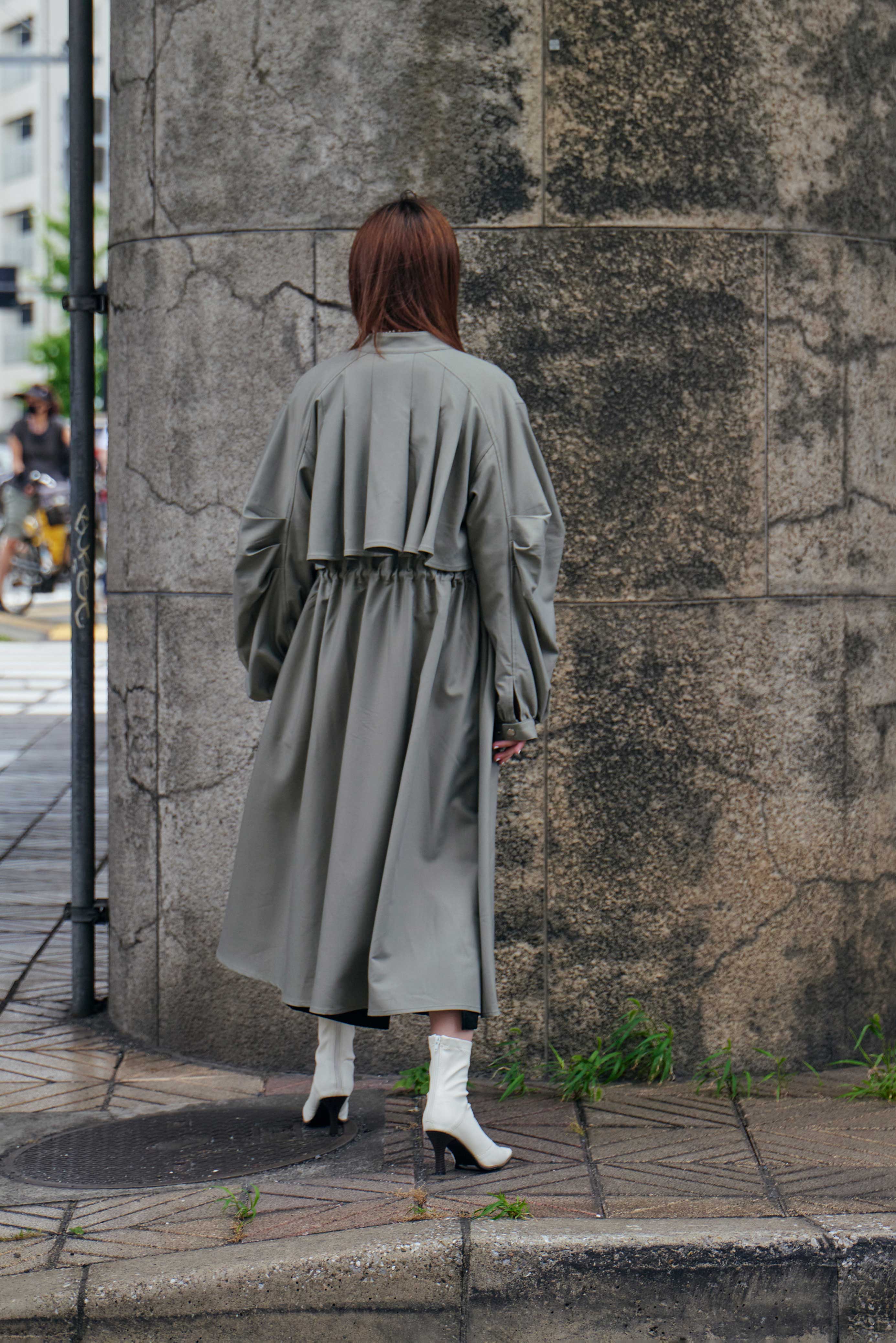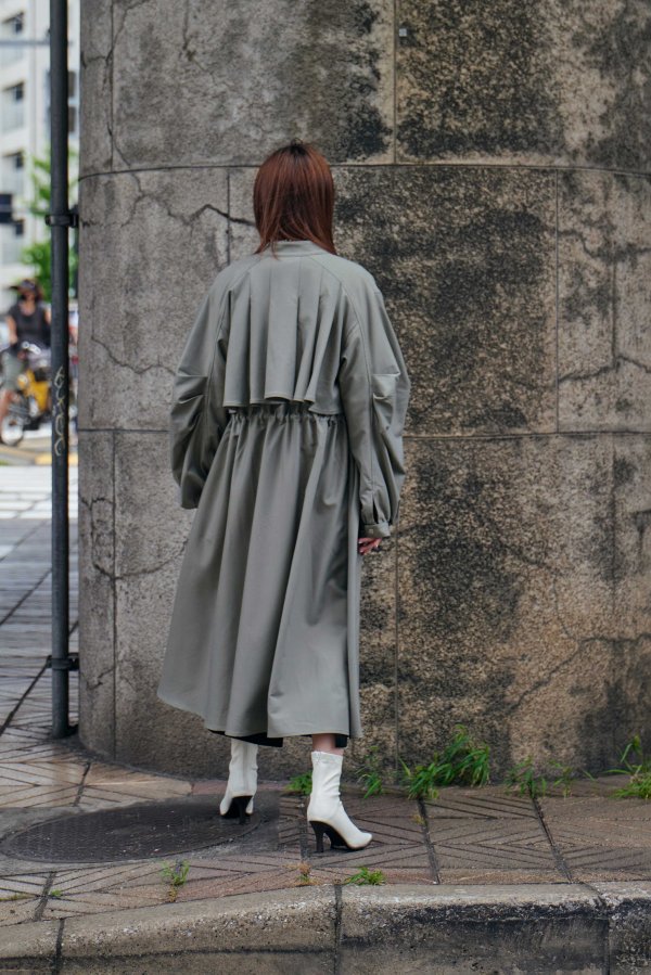 バックのストームシールドにはたっぷりとフレア感の出るプリーツを仕込んで後ろ姿も抜かりなく。