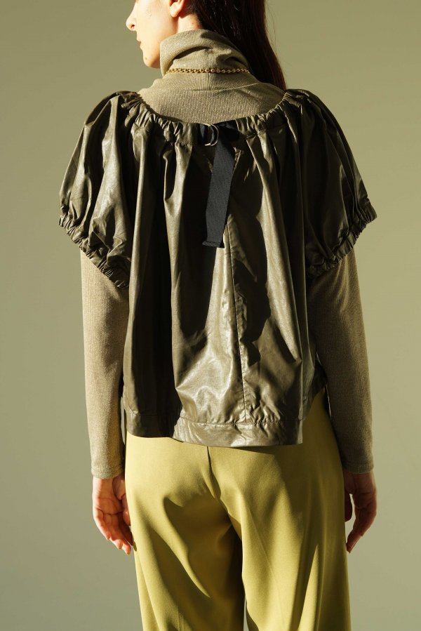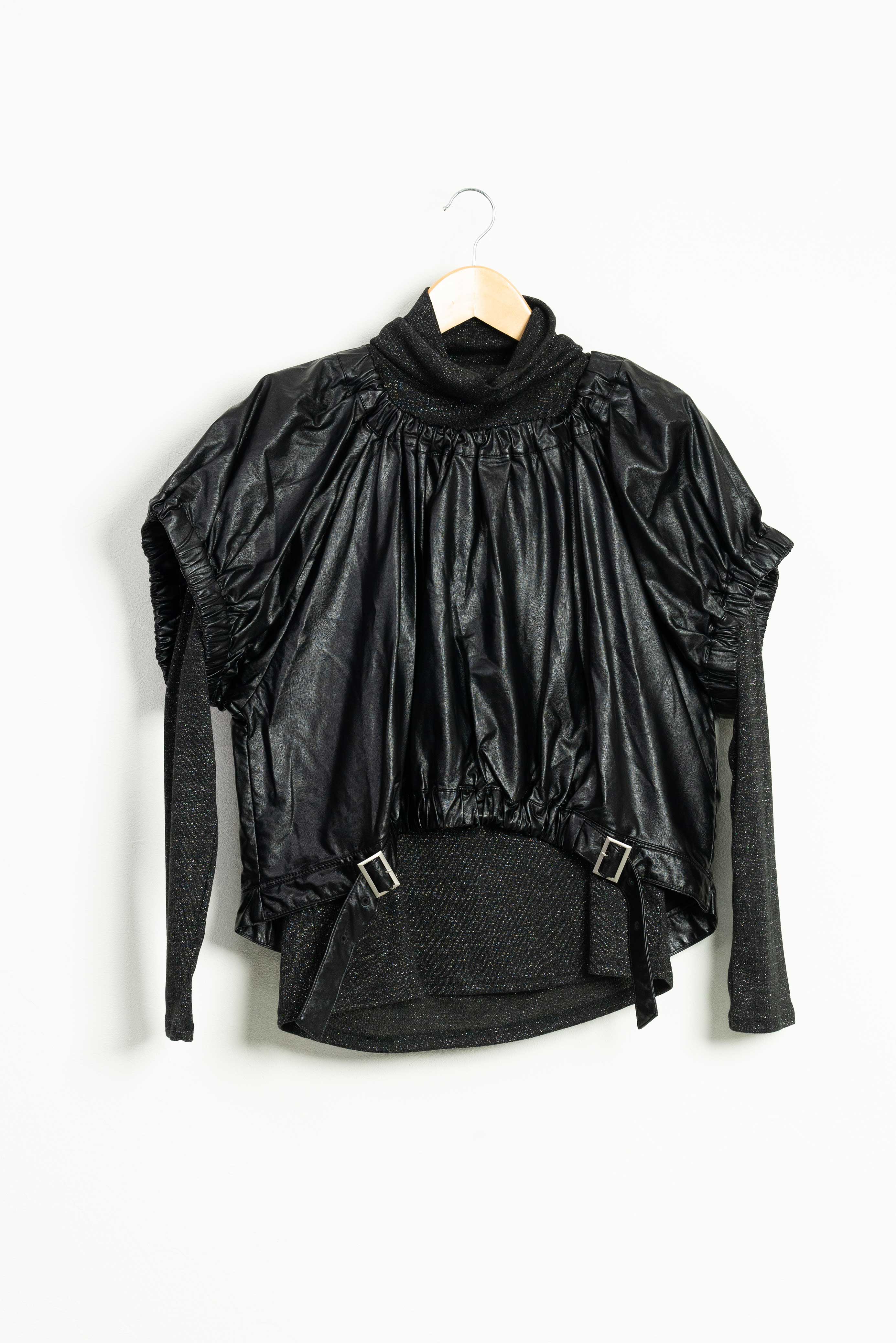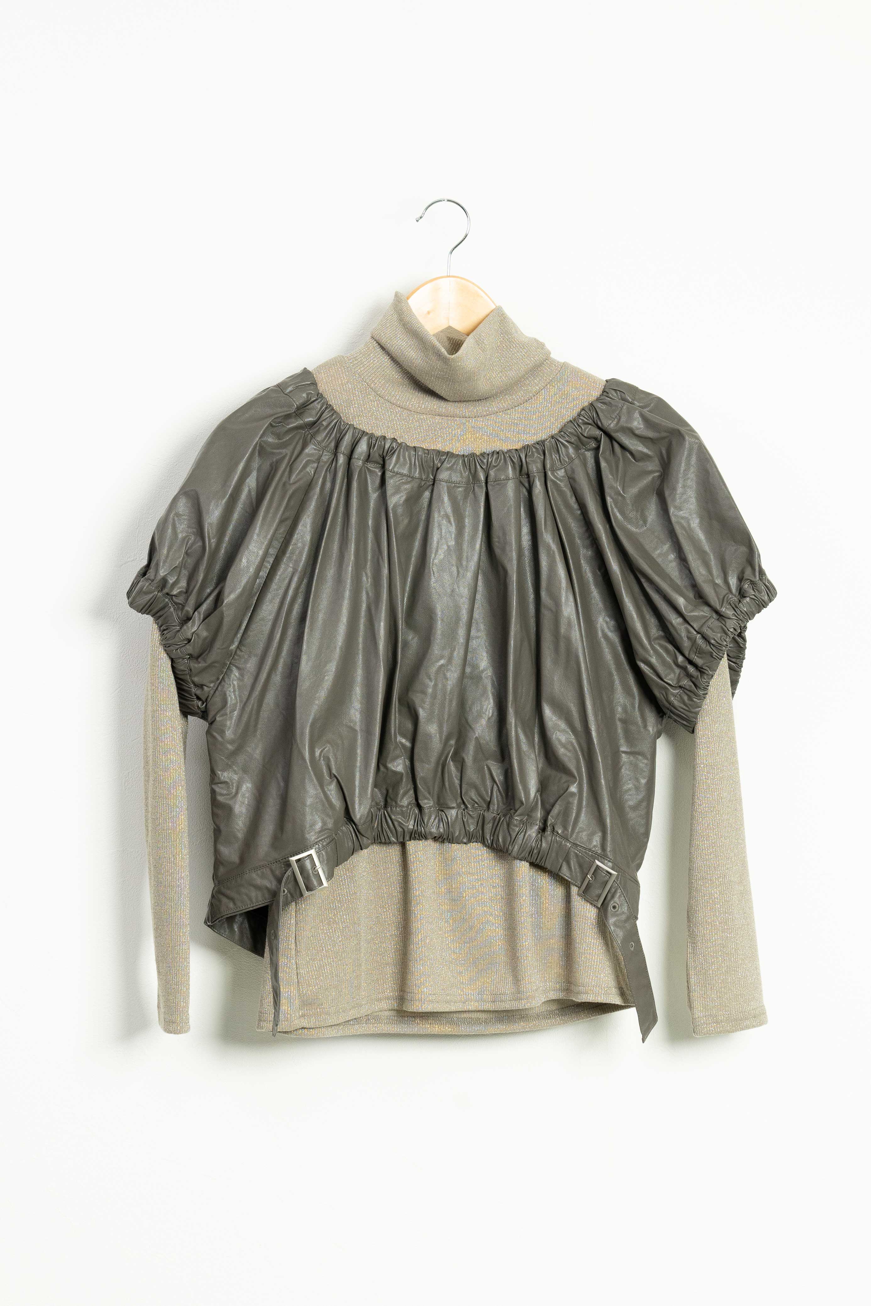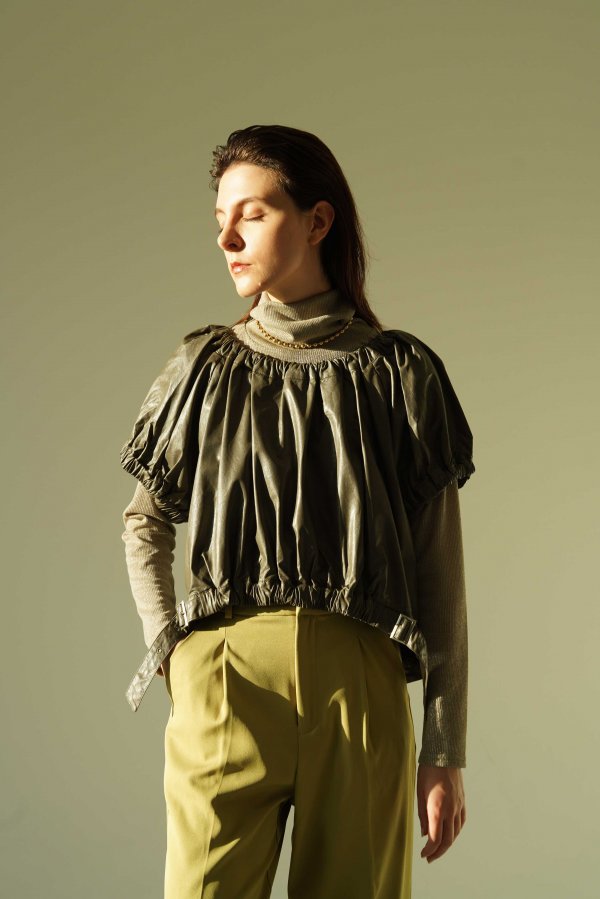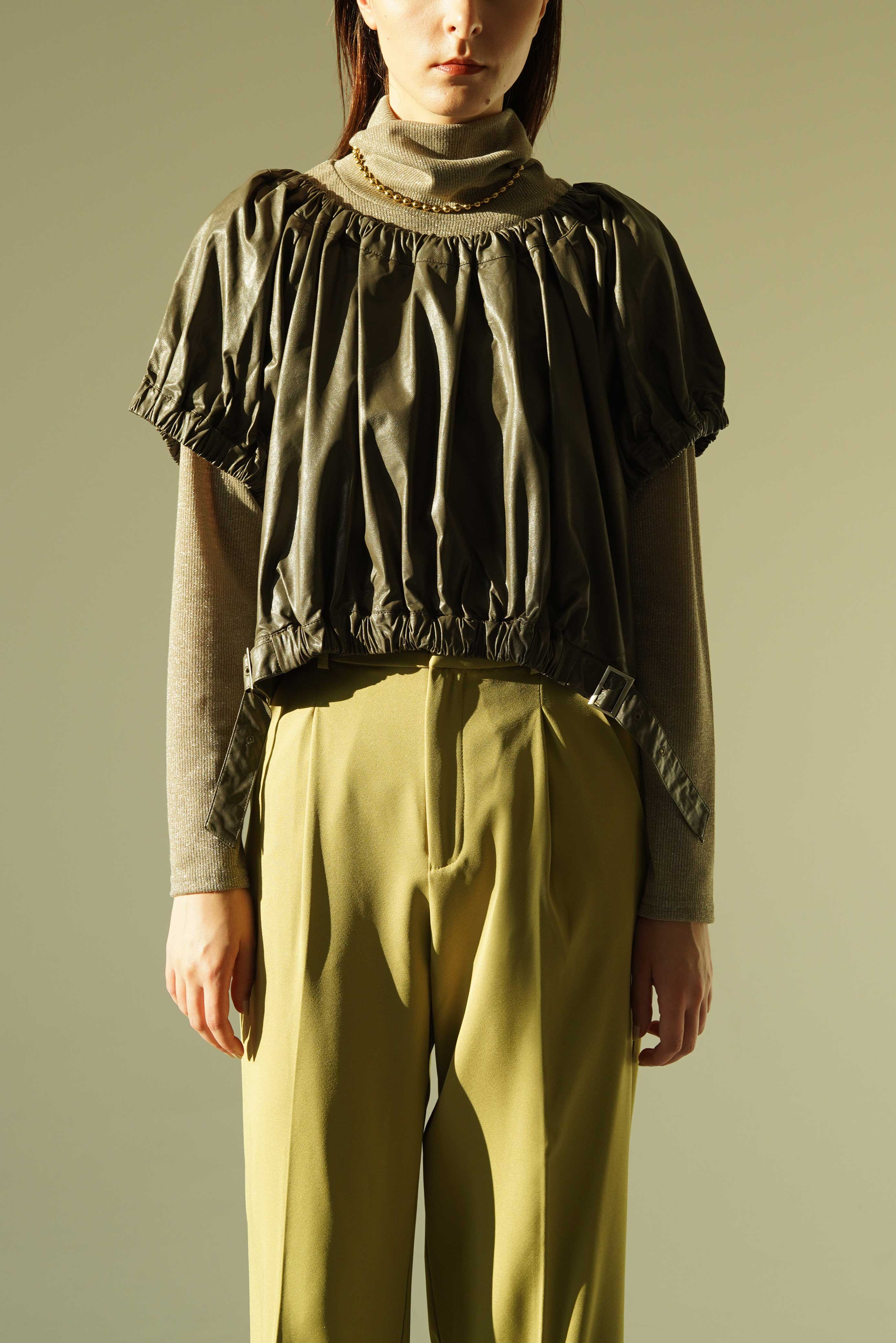 ギャザーで寄せたフェイクレザーの質感がユニークなインナーセットトップス。