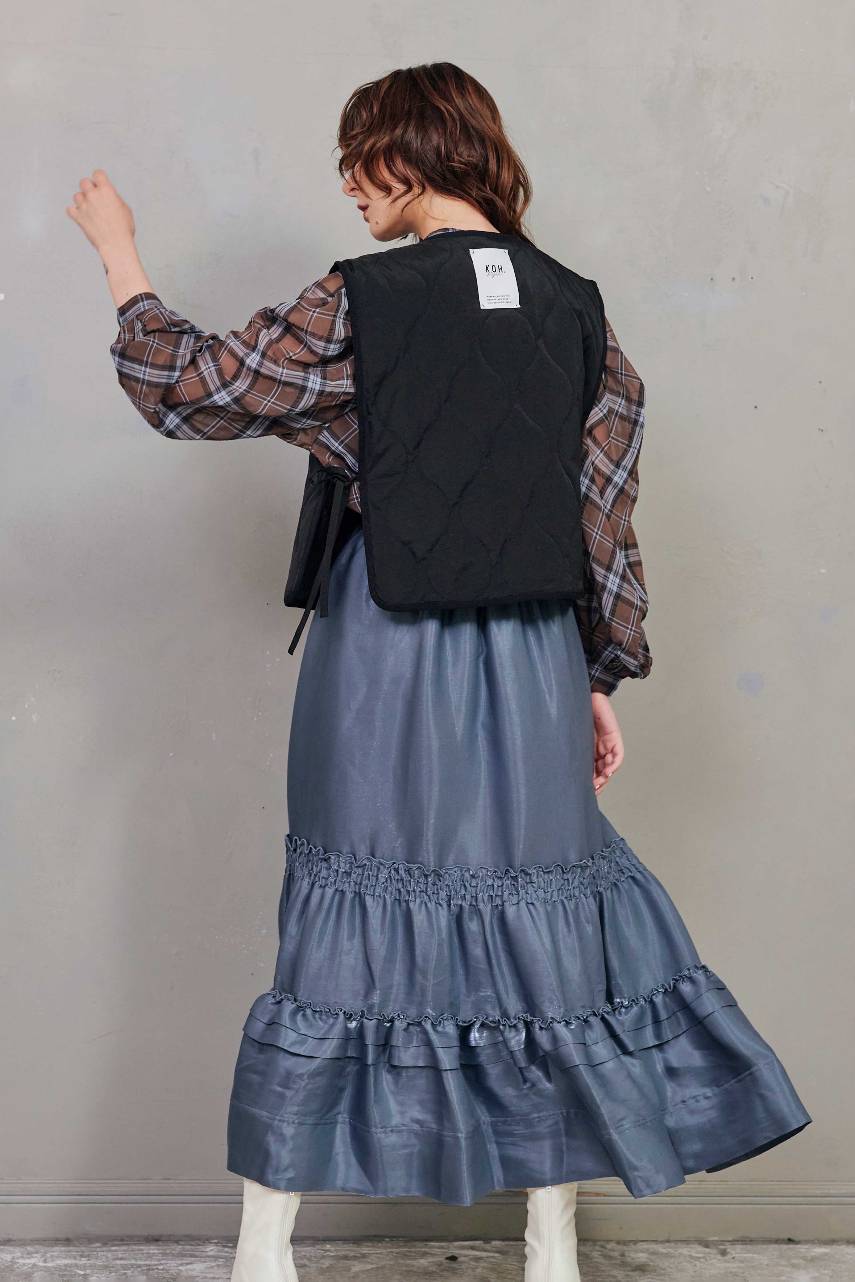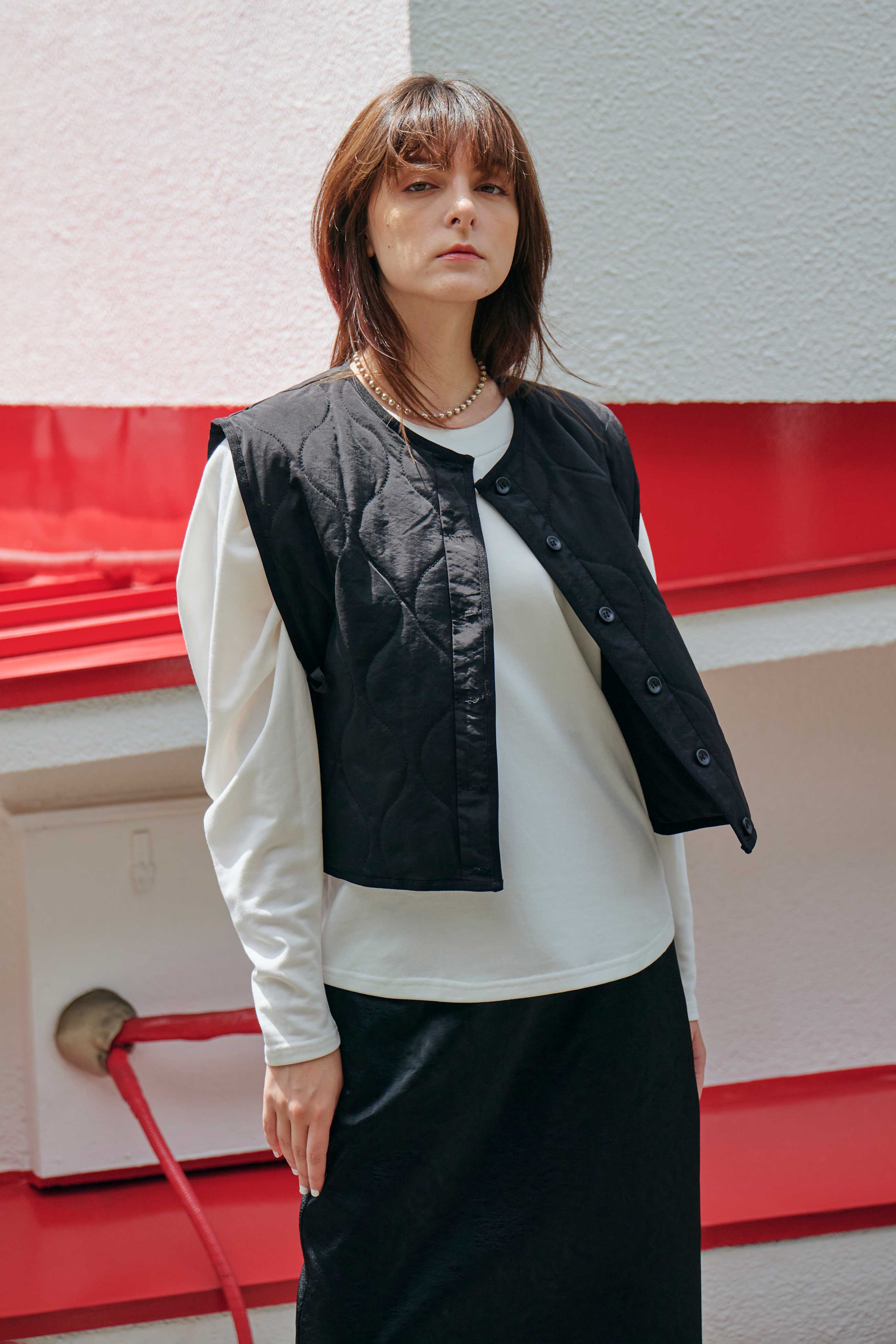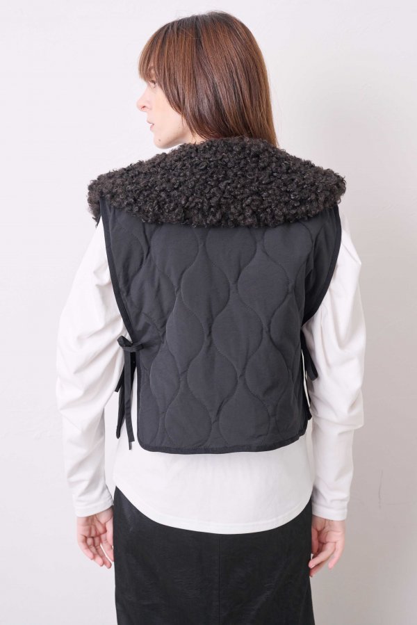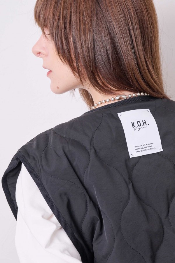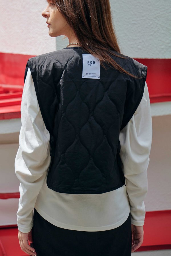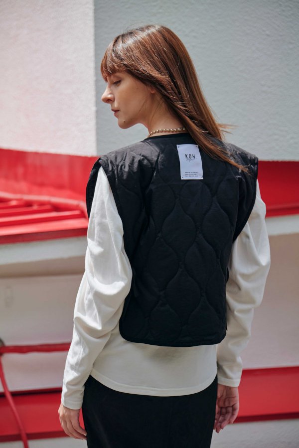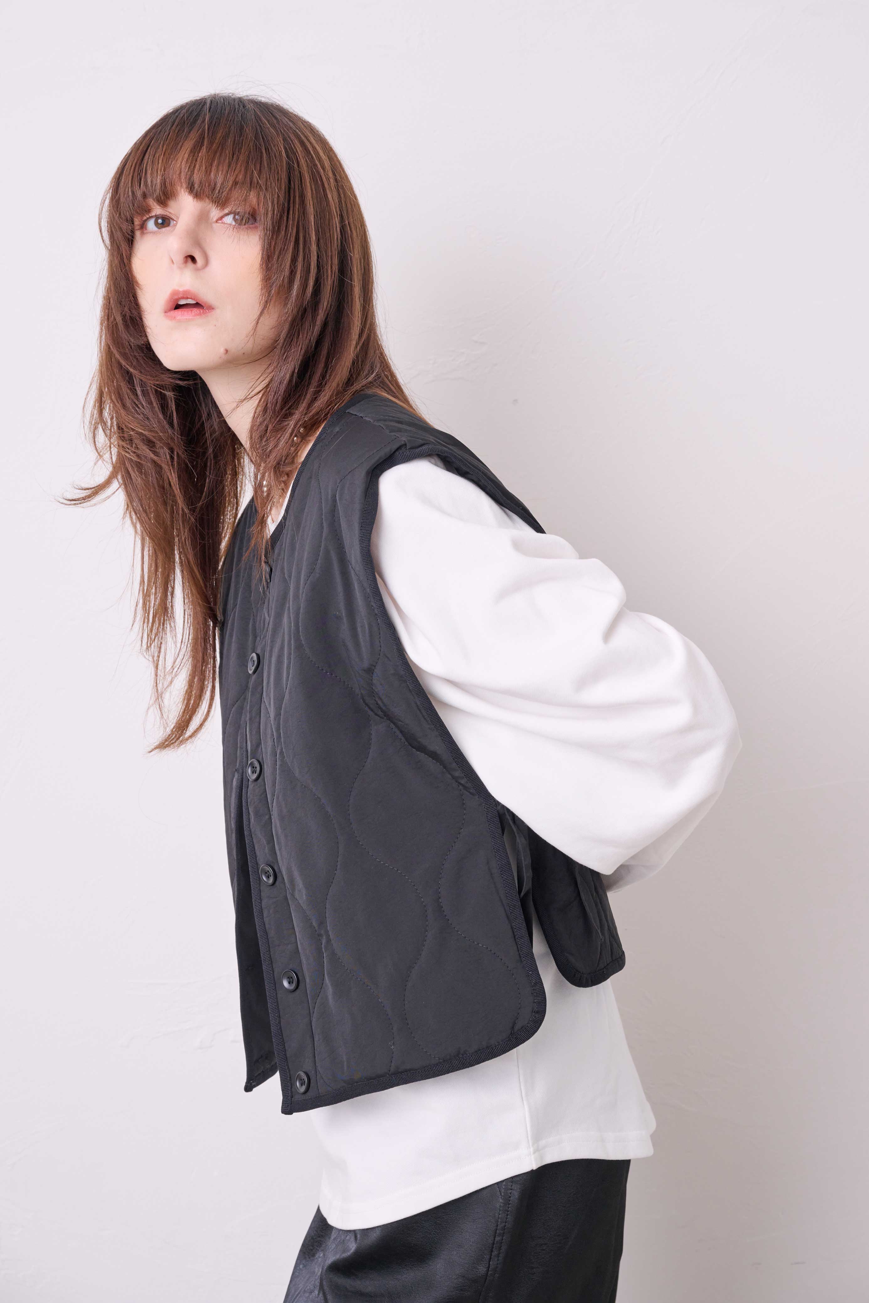 単品としてだけでなくインナーとしてジャケットの中に仕込んだり、襟を外してシンプルベストとして羽織たり、さまざまな着方を楽しめる、中綿キルティングが心地よい万能ベスト。