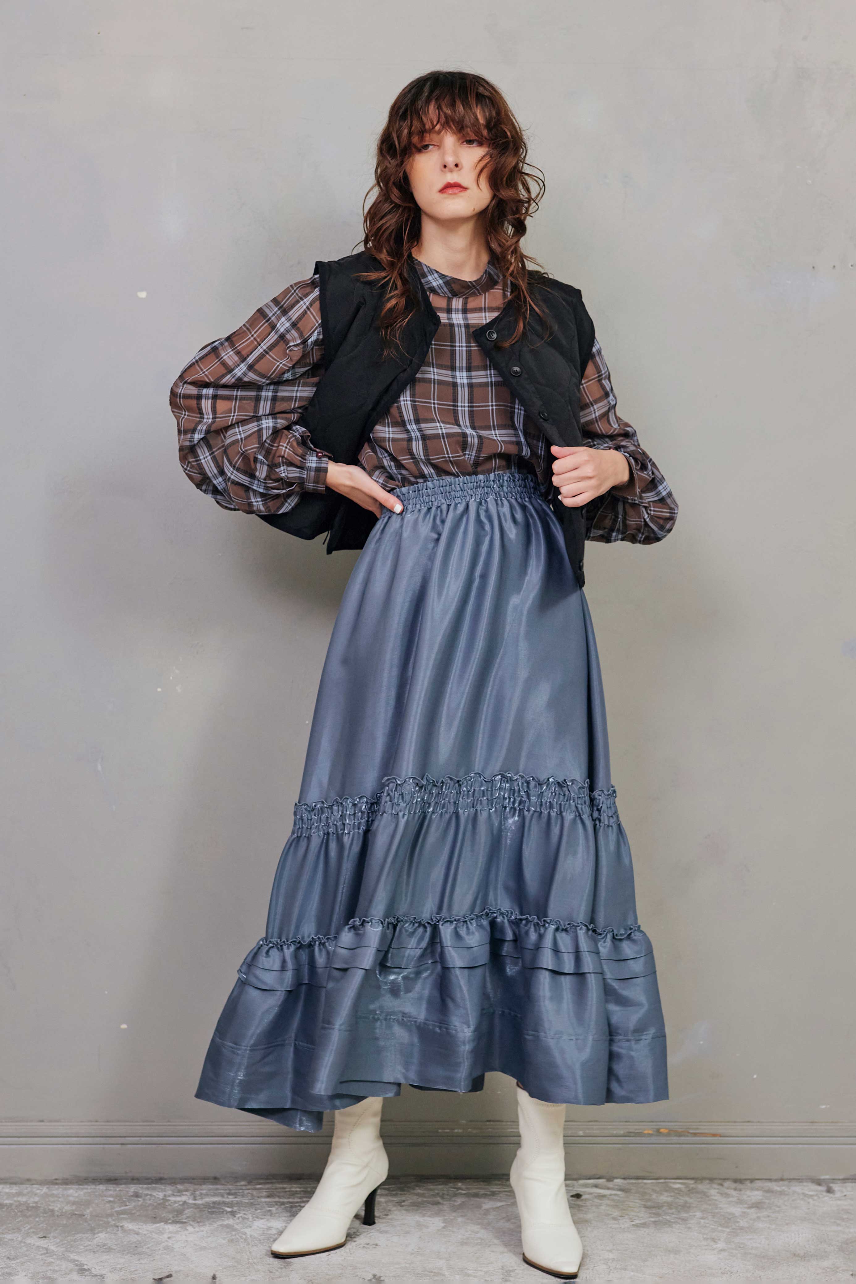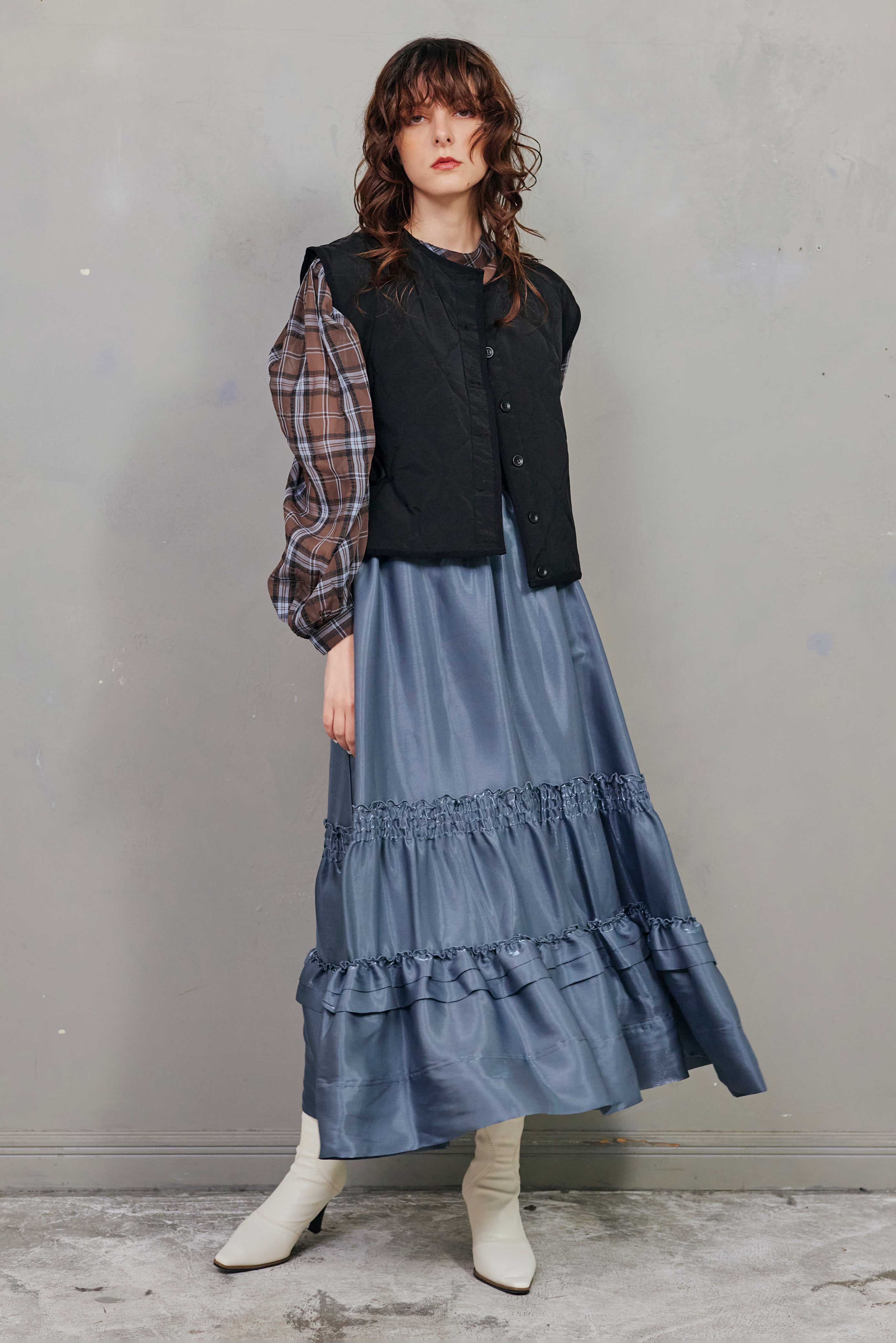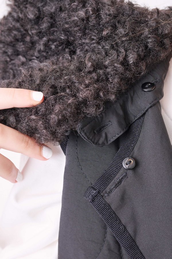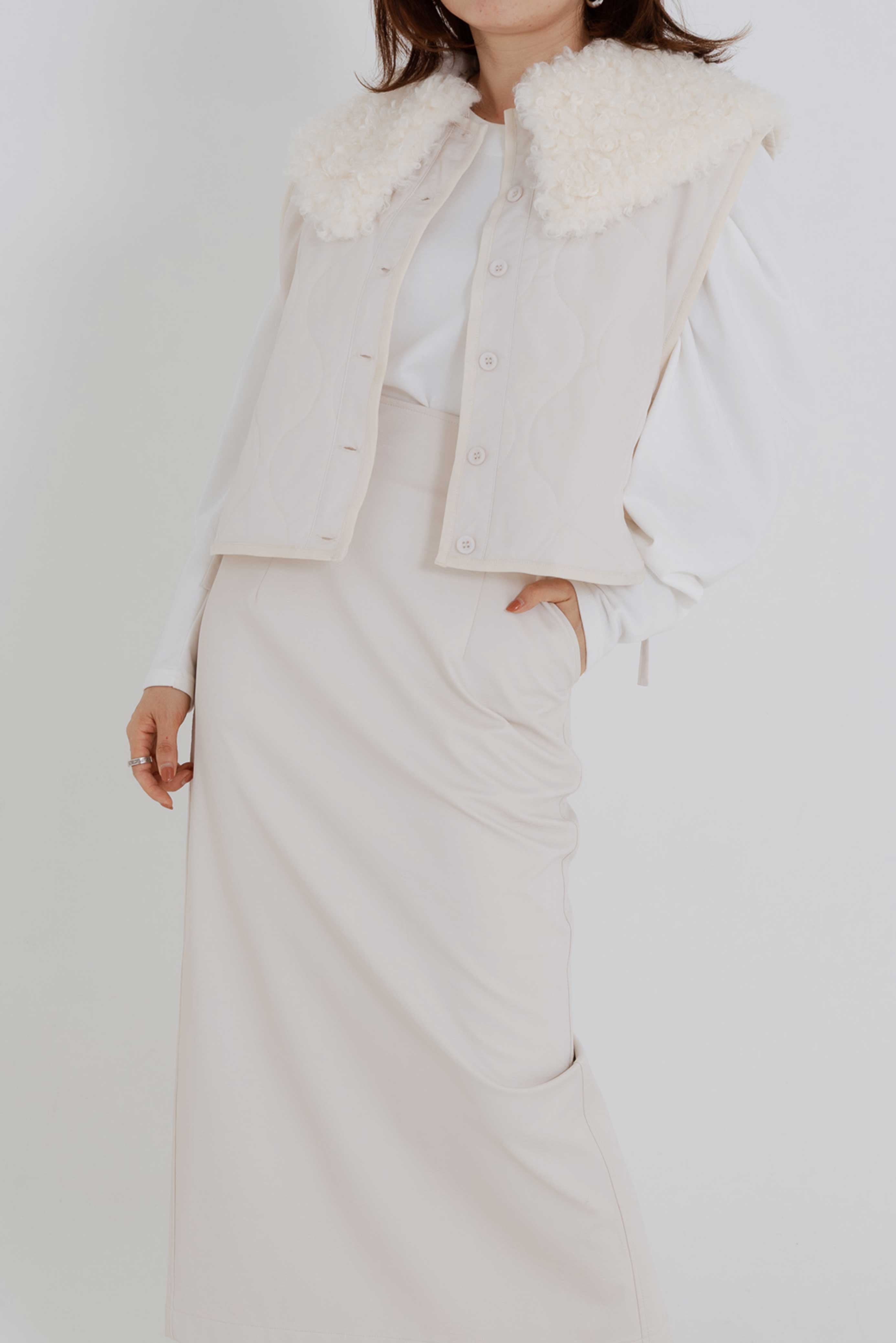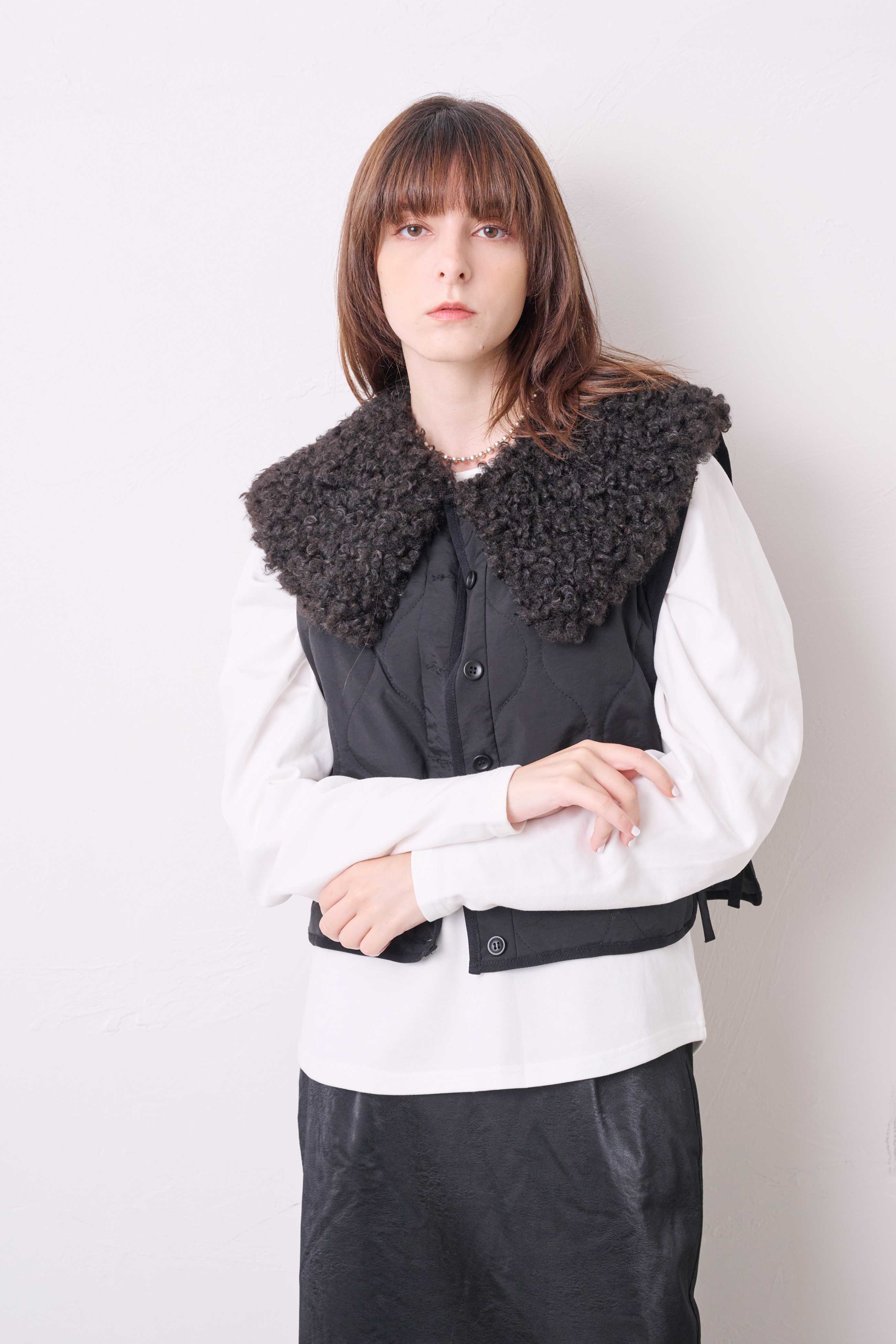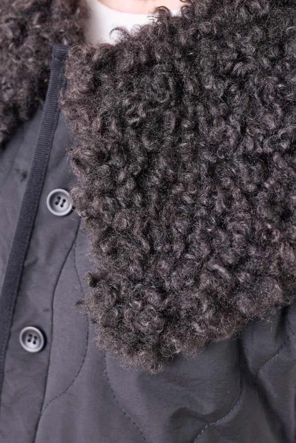 可愛らしさもあるディテールながら、素材感に偏光の光沢があるので、大人らしいスタイリングにもなじみがよく、もちろん襟を取り外しても着用できるので、自由なアレンジが楽しめる普段のスタイリングにさっと羽織るだけで鮮度の高いコーデの完成。