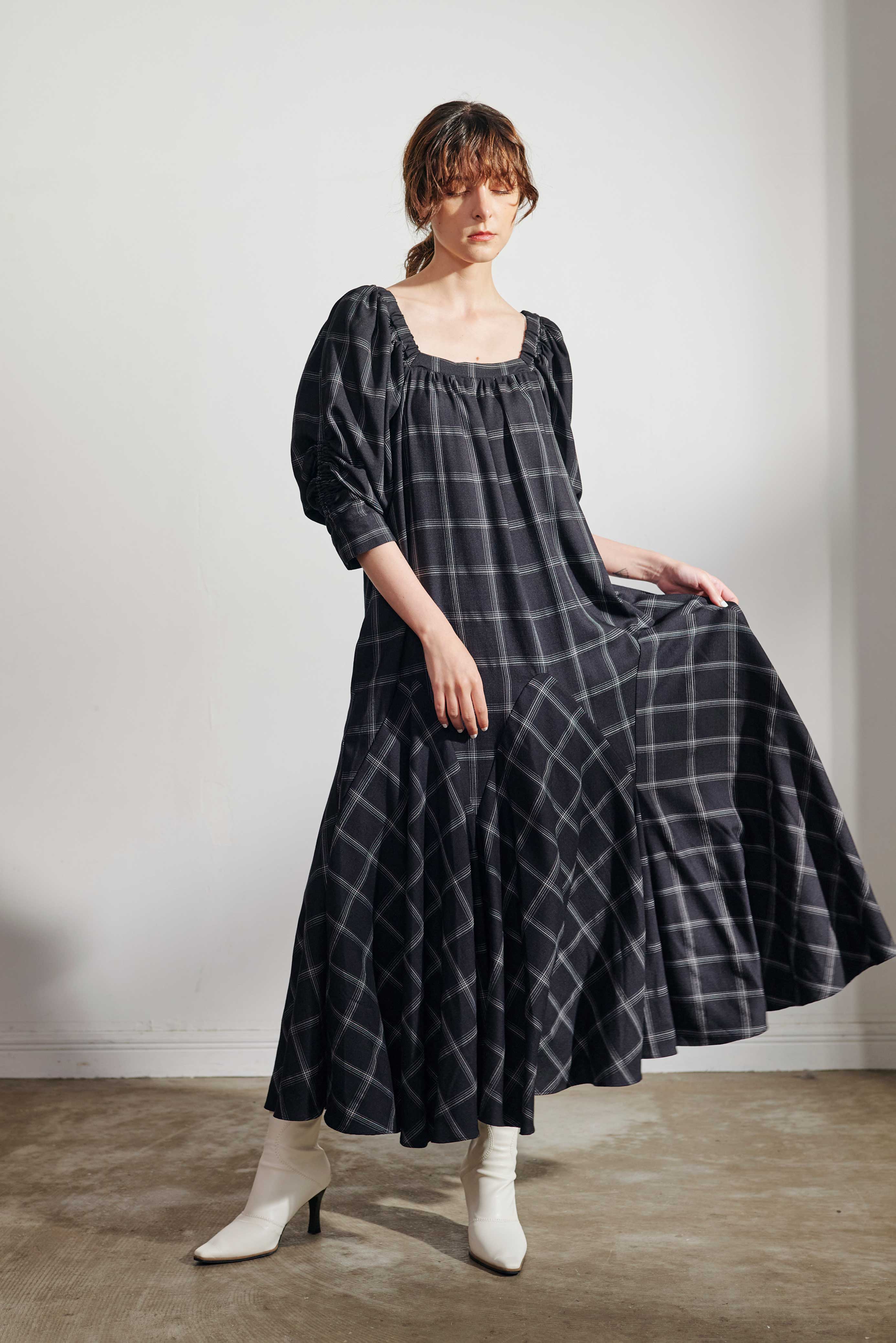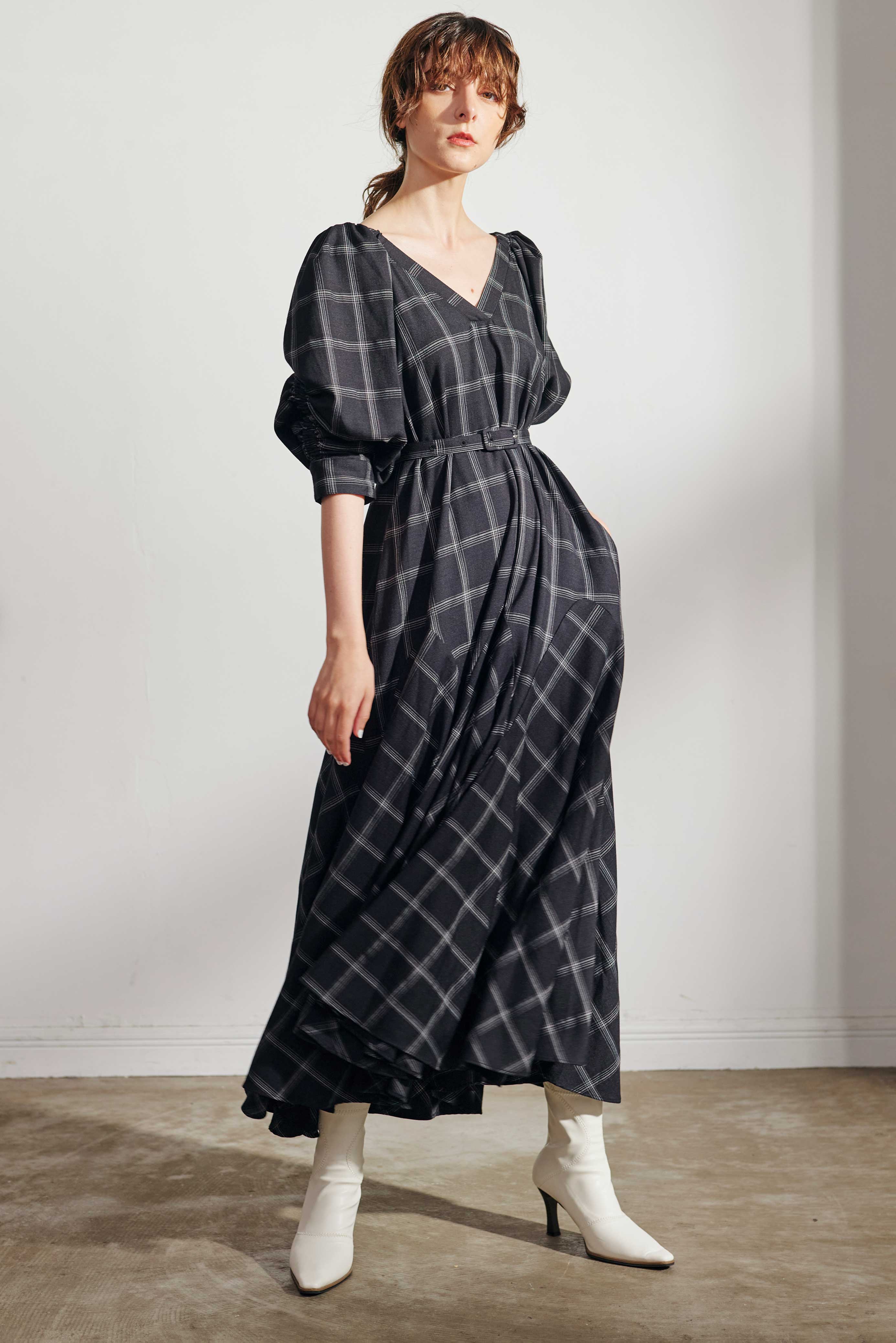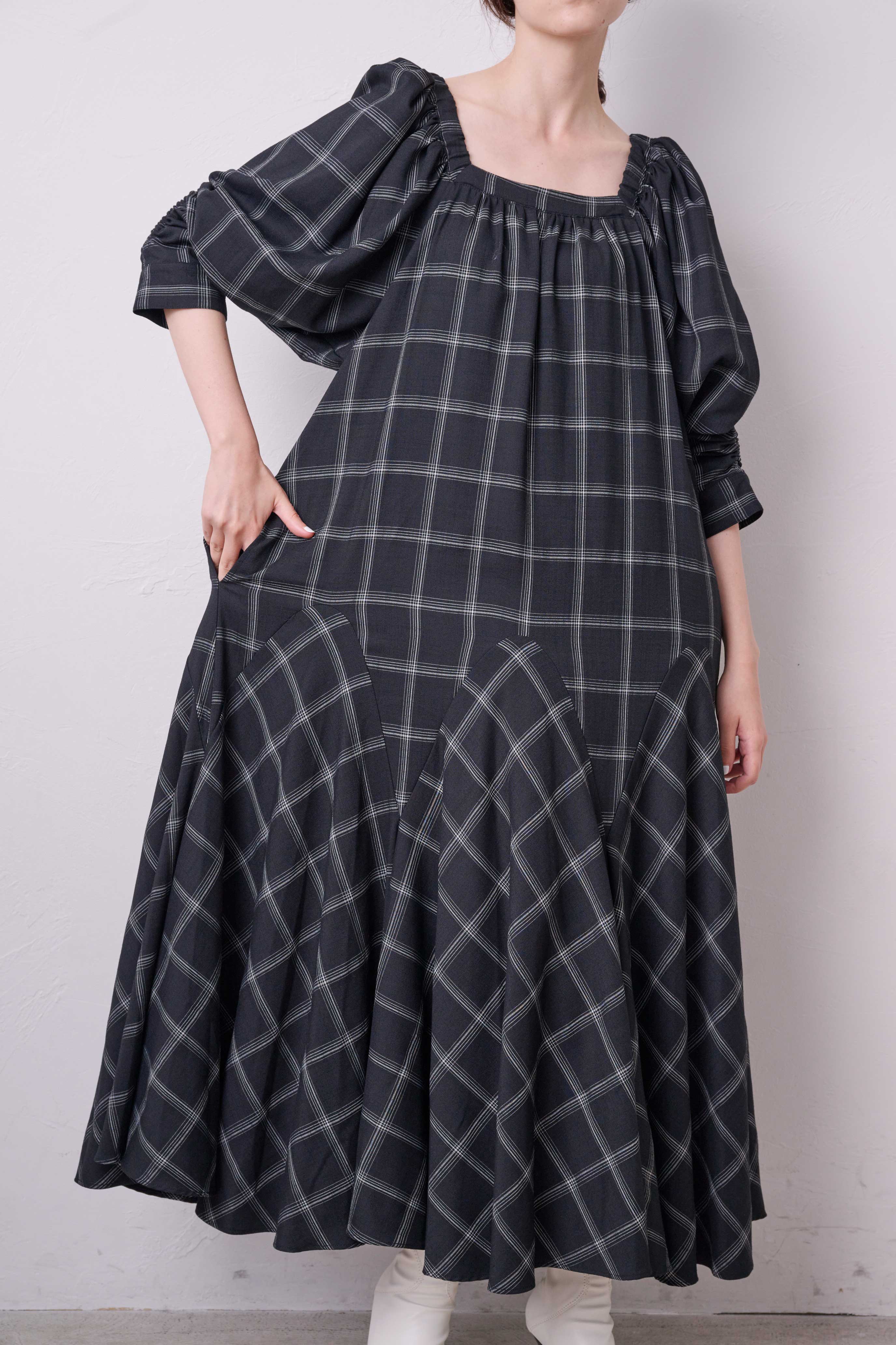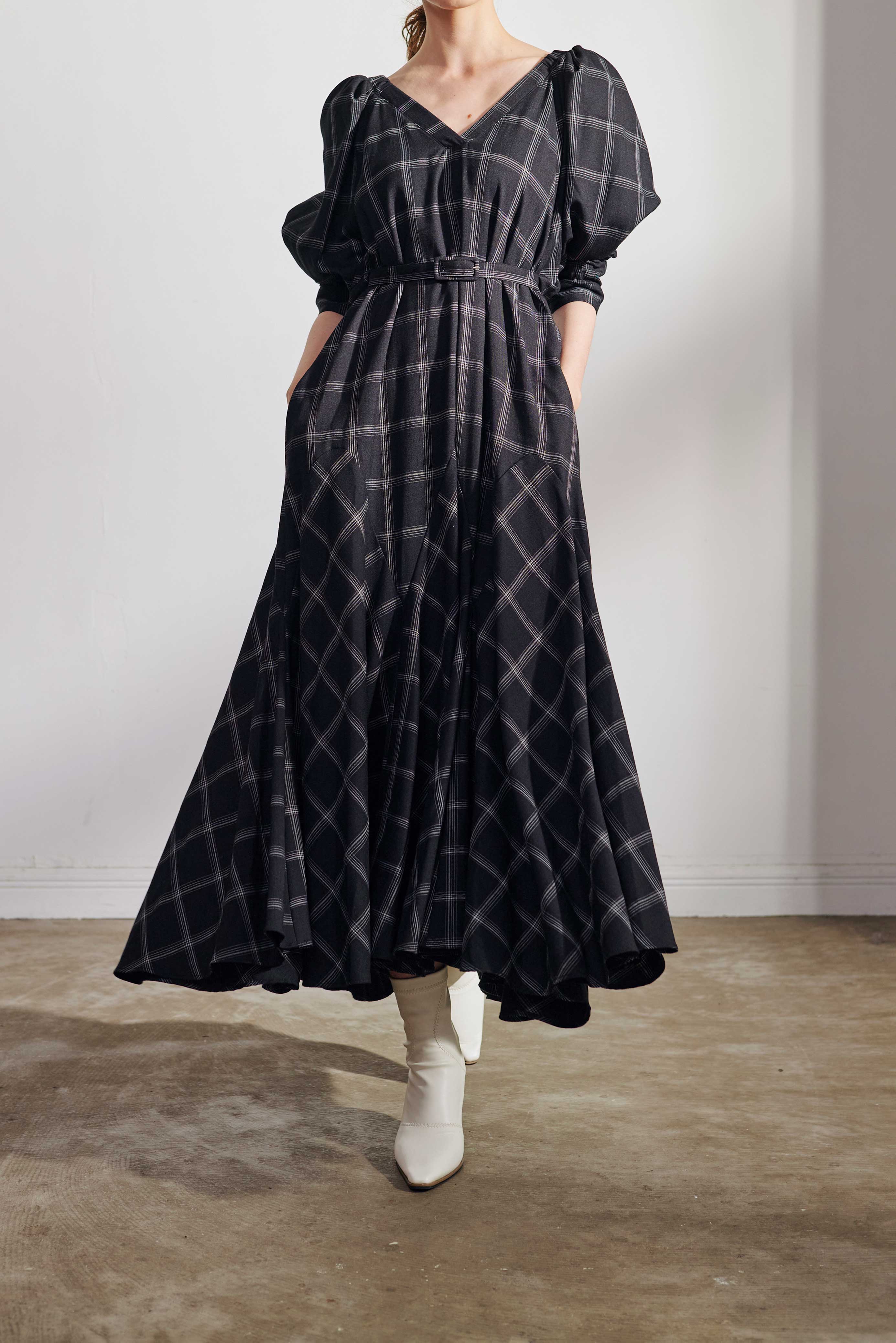 腰回りはフィットしつつも裾にたっぷりと分量感をもってくることで、上はストン、下はたっぷりフレアでスタイルアップがかないます。