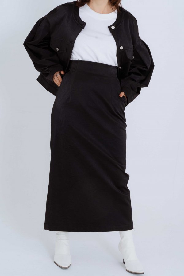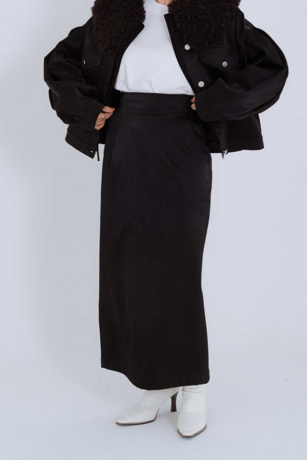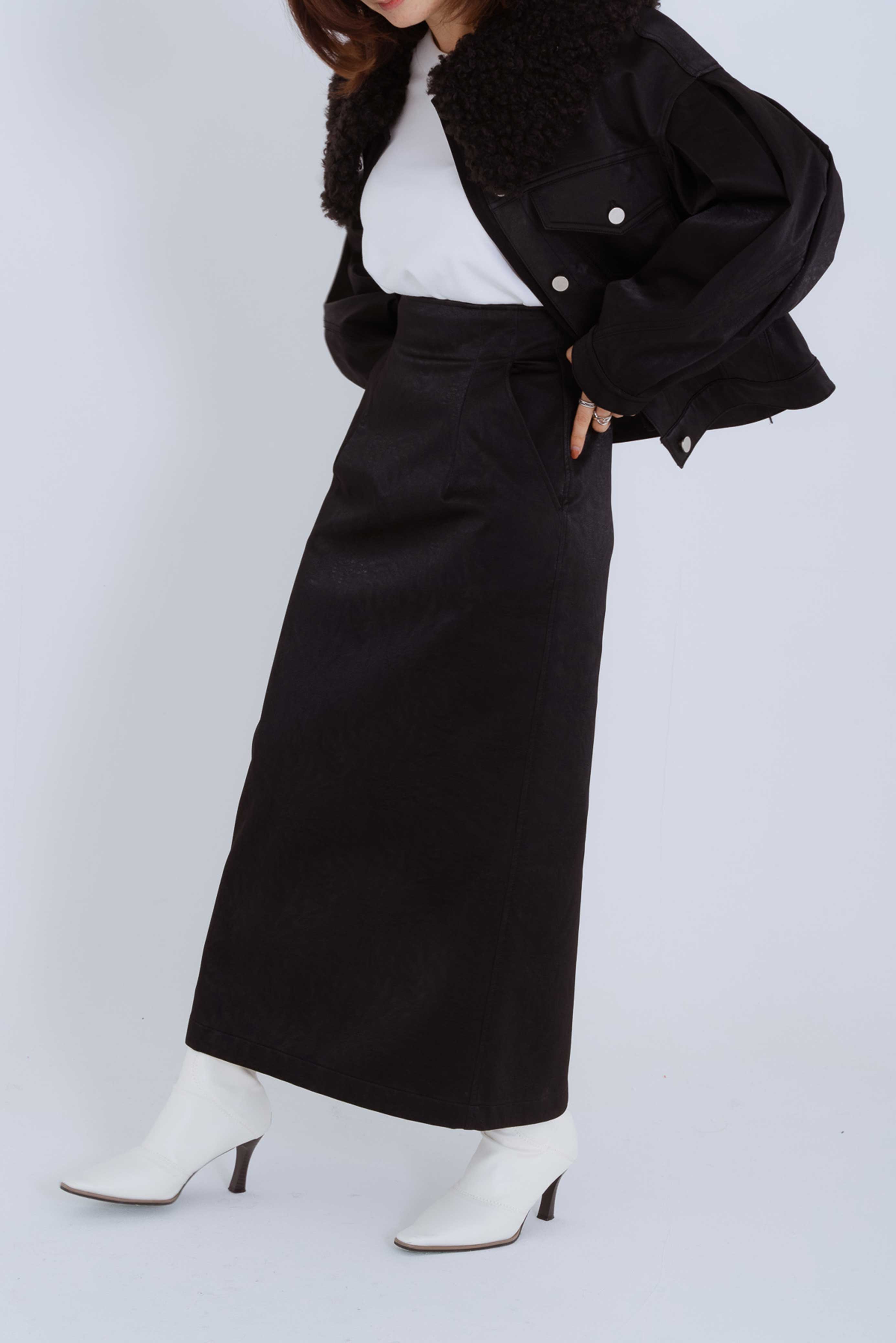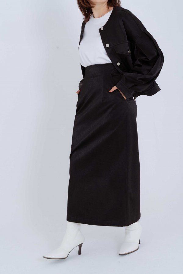 手持ちのお洋服と合わせて鮮度の高いスタイリングが完成しちゃう、1枚持ってるだけで重宝するタイトスカートは、素材感で主張してみるのもおすすめ。