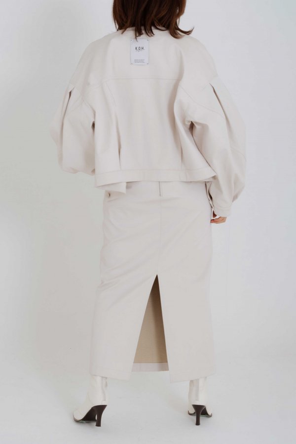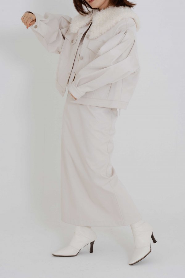 セットアップで同素材のジャケットボアカラーのついたインナーベスト同型の素材違いのジャカードスカートなどもご用意がございます。