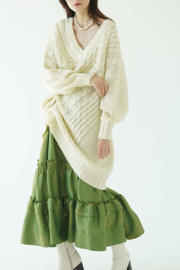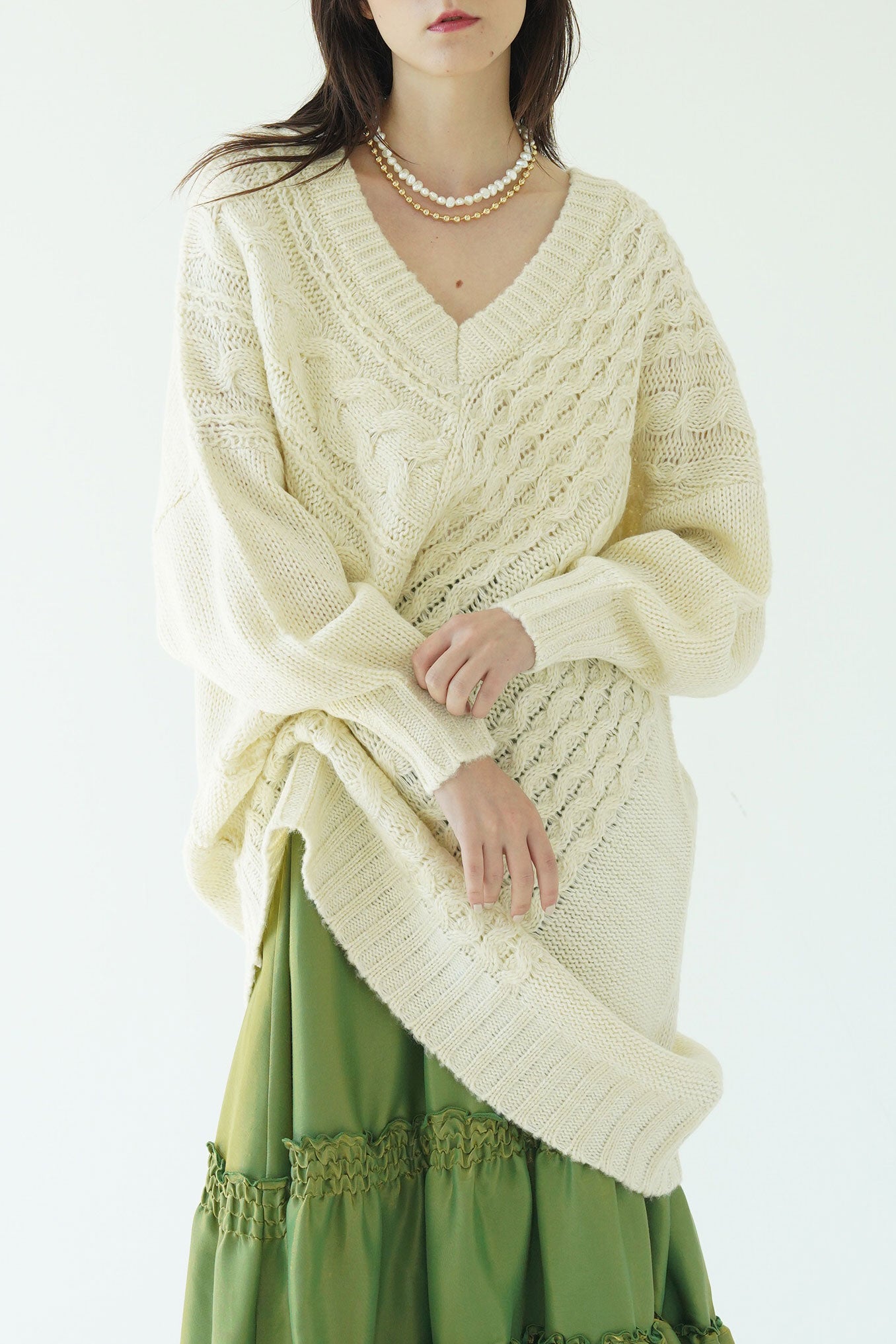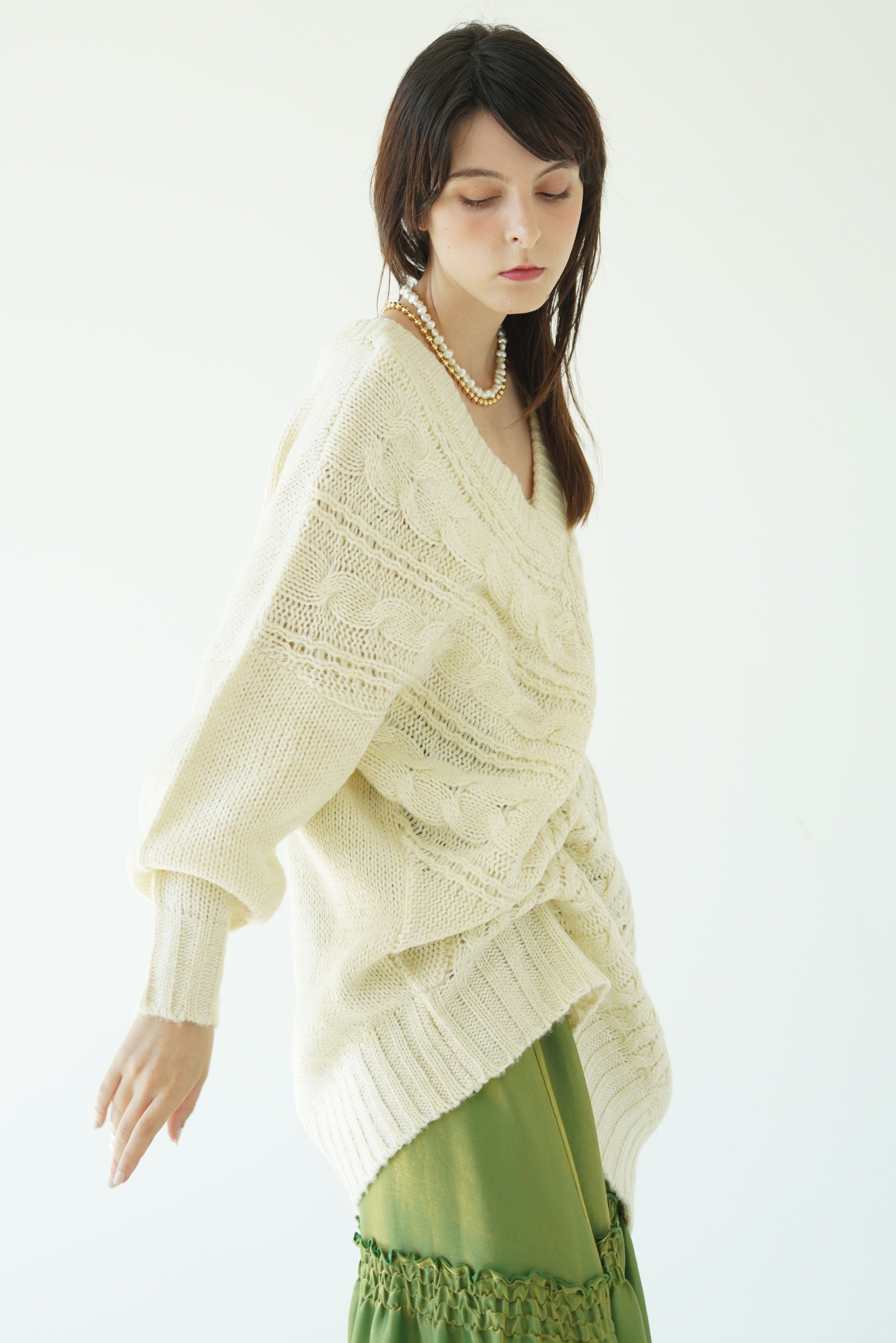 テクニックいらずでニュアンスシルエットが完成する小技ありのケーブルニットトップス。