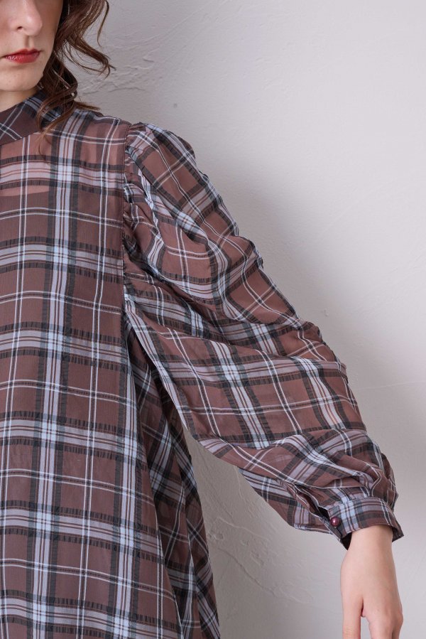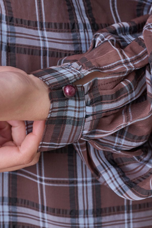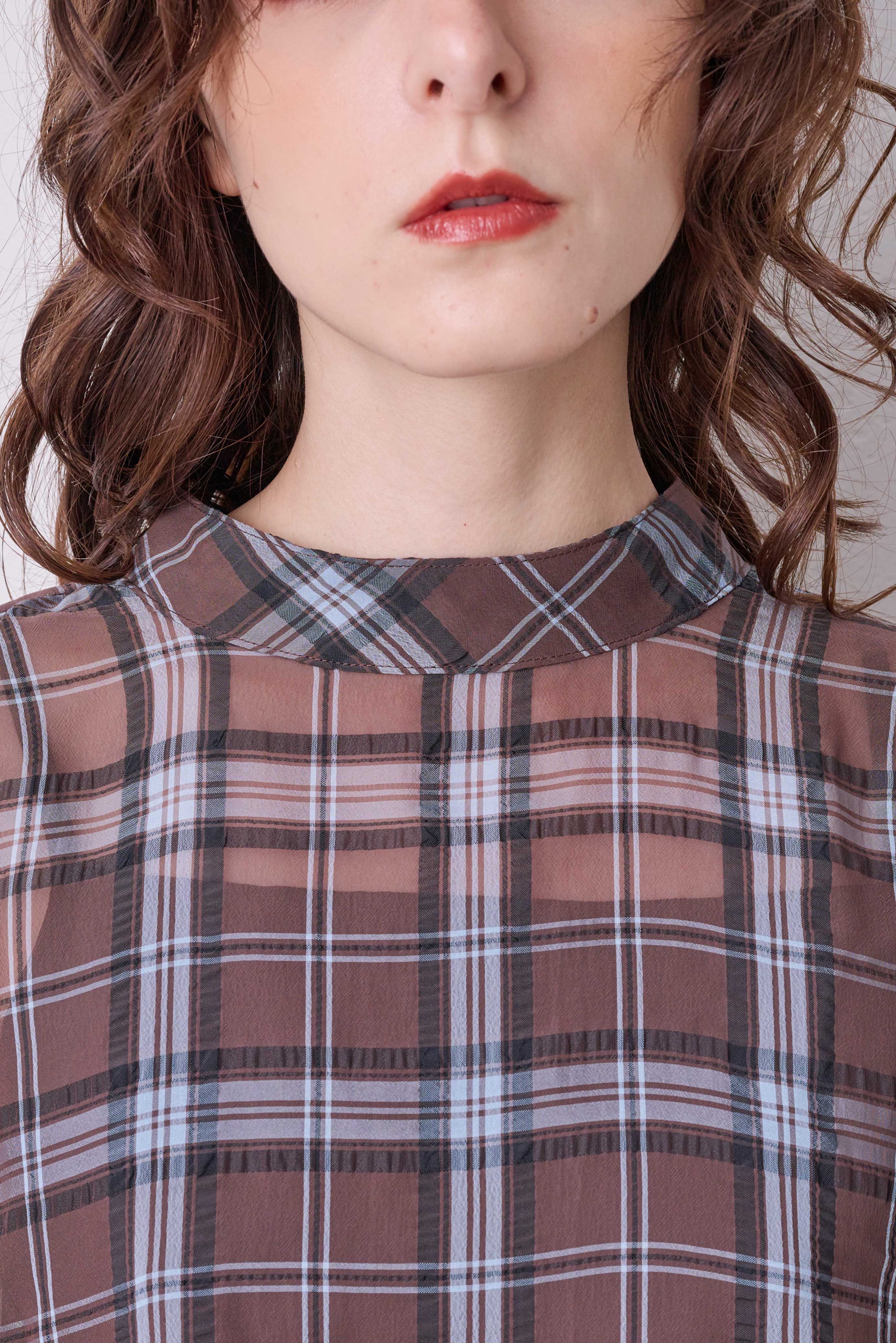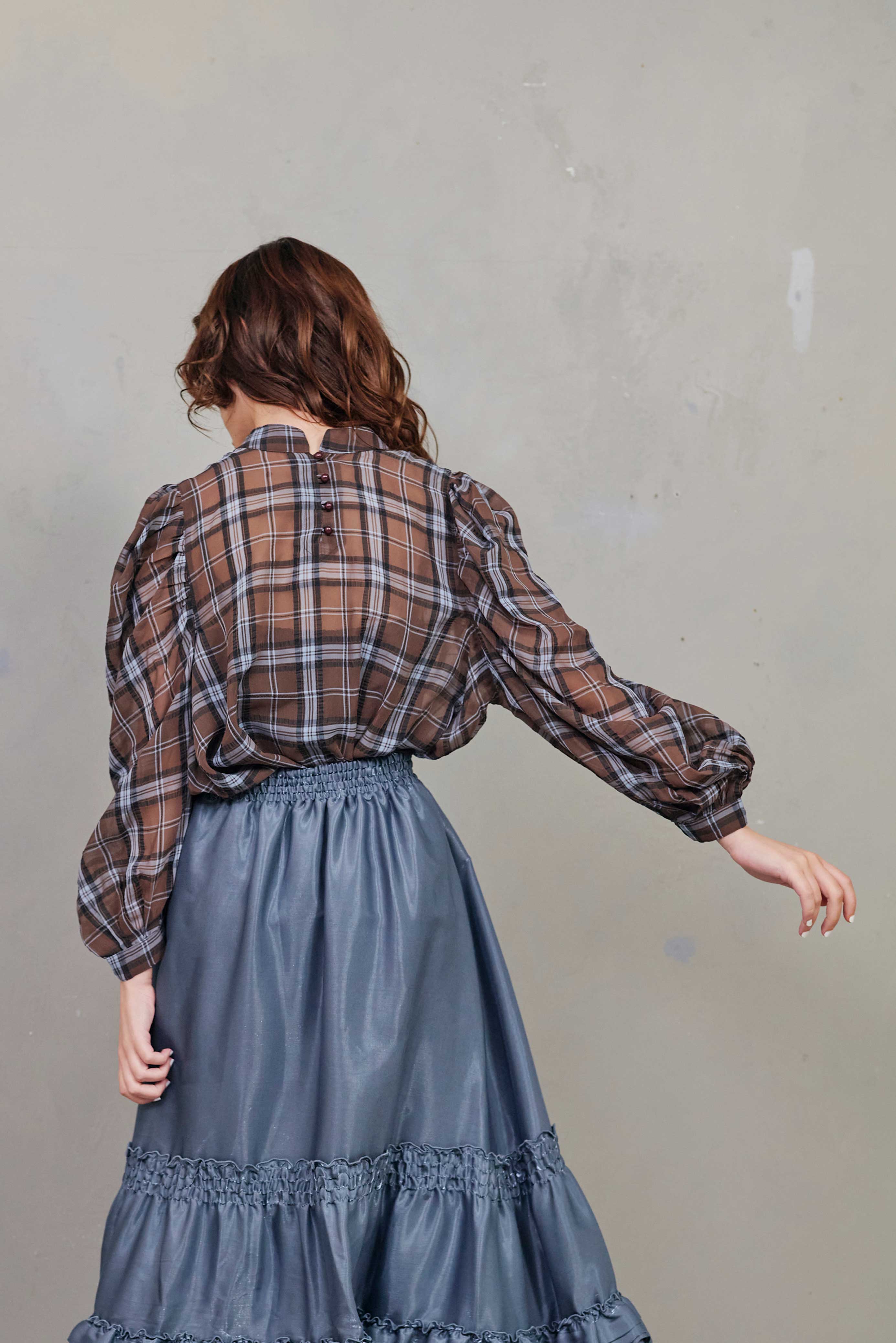内側にぐっと入った肩線が華奢な肩幅を演出してくれるクラシカルな印象のチェックブラウス。