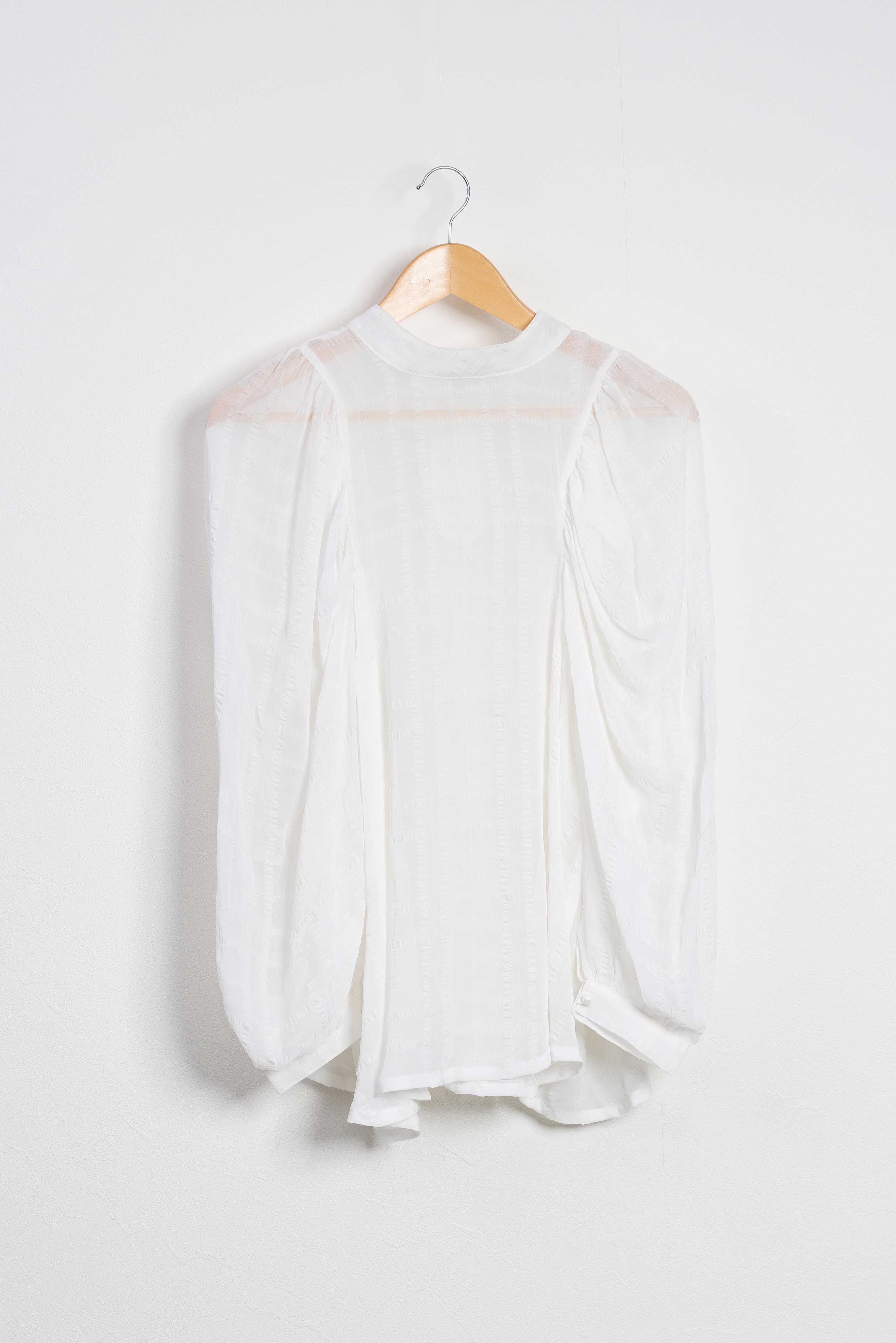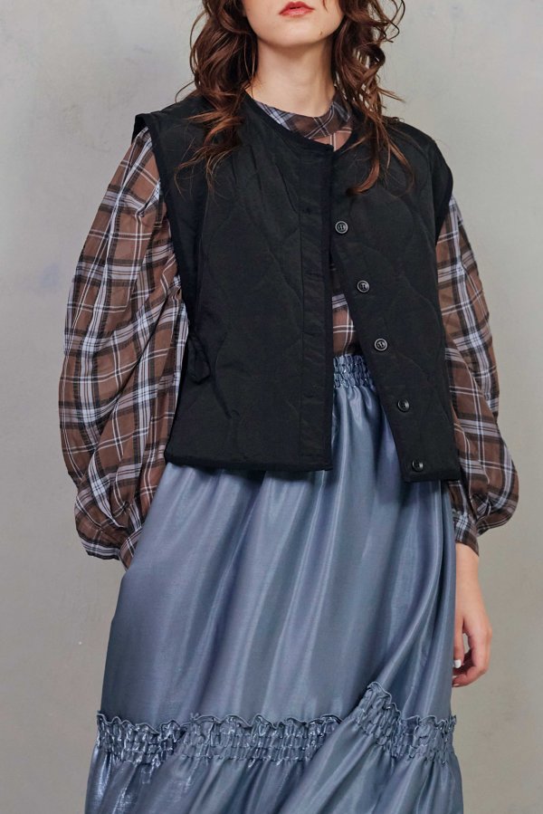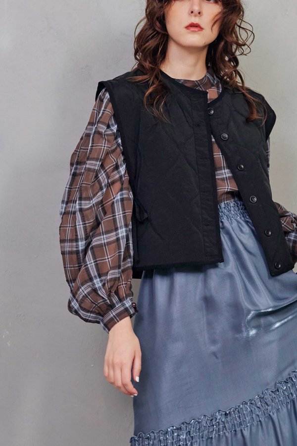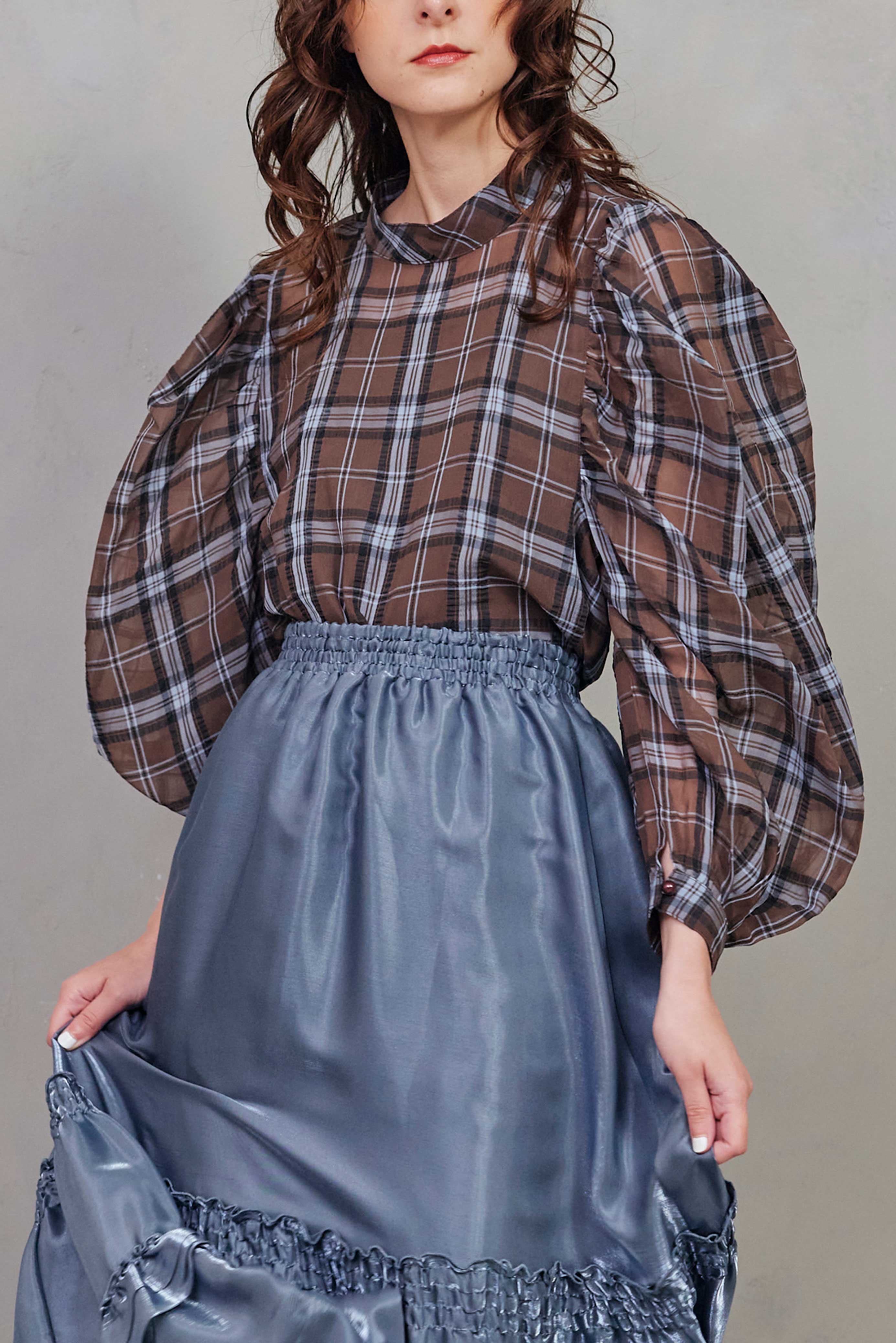 内側にぐっと入った肩線が華奢な肩幅を演出してくれるクラシカルな印象のチェックブラウス。