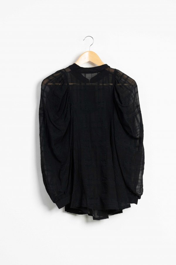 袖は立体的にぽわんとふくらむようにタックを入れており、やわらかなボリュームがあるフォルムなので、身幅はちっちゃくコンパクトに見えるようにアームホールの切り替えにしていますが実は身幅はゆったりめです。