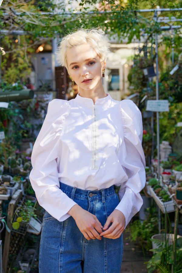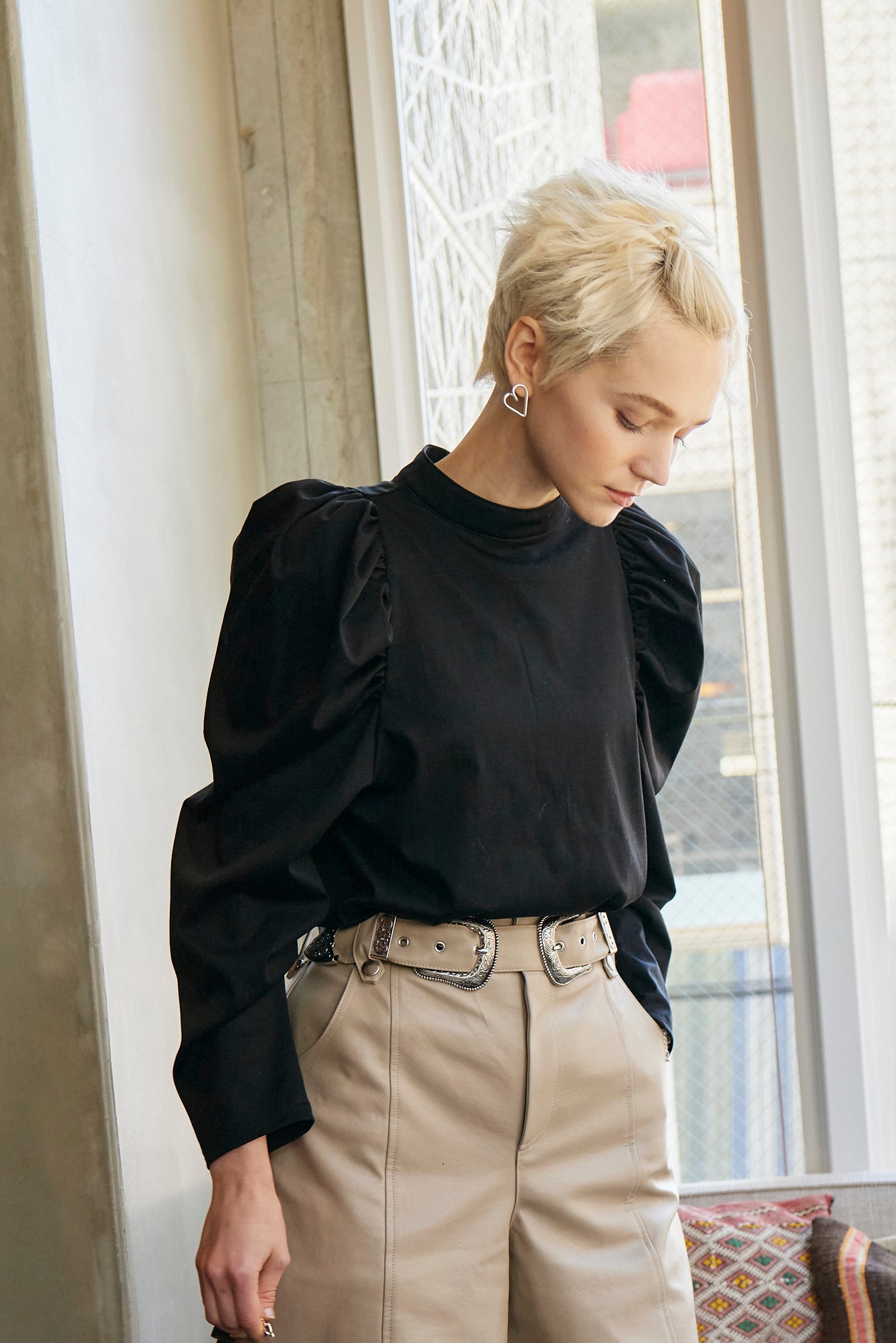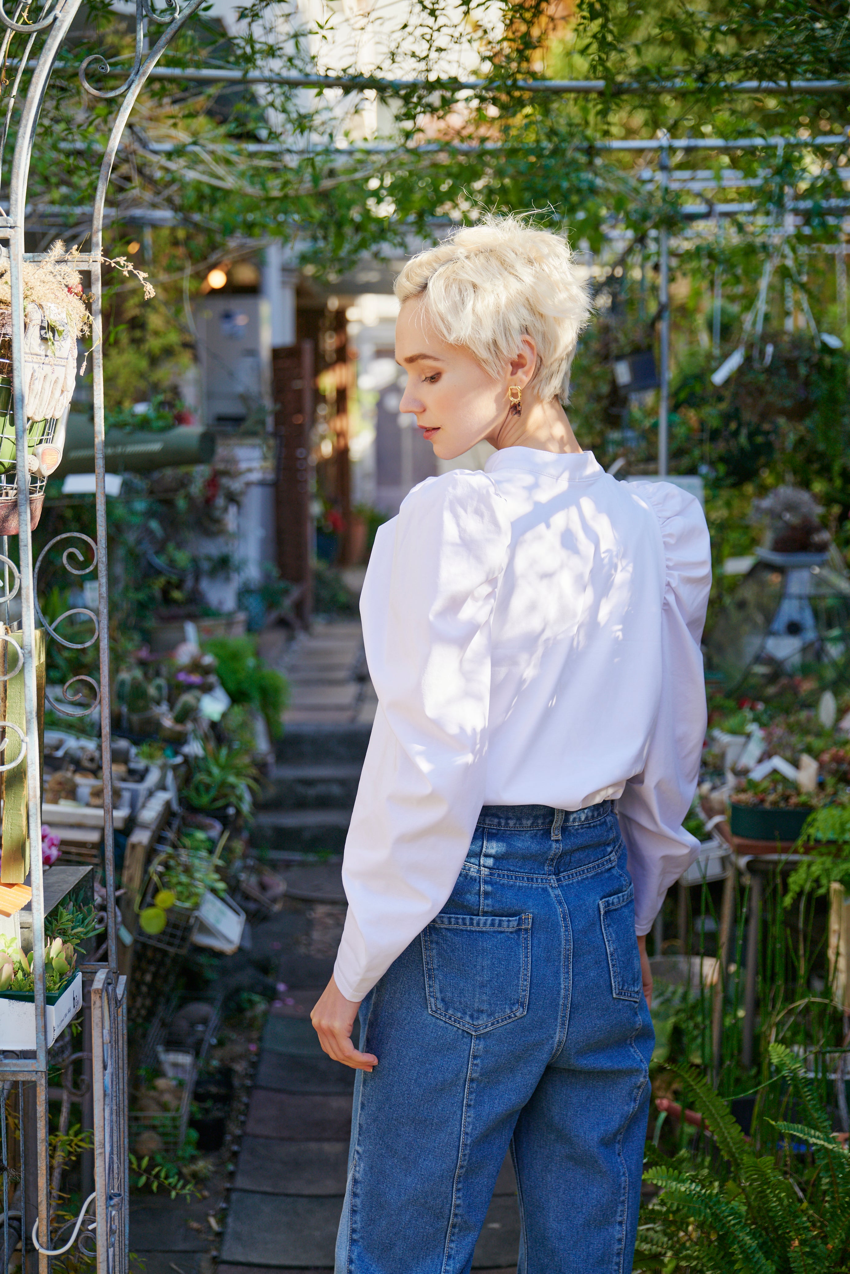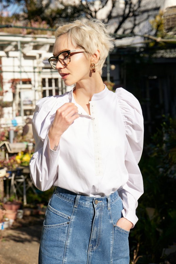 肩と袖の切替を内側にしたことで肩幅を小さくみせ、落ち着いた印象に。