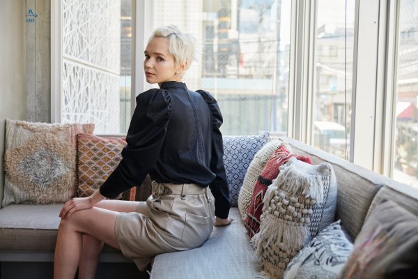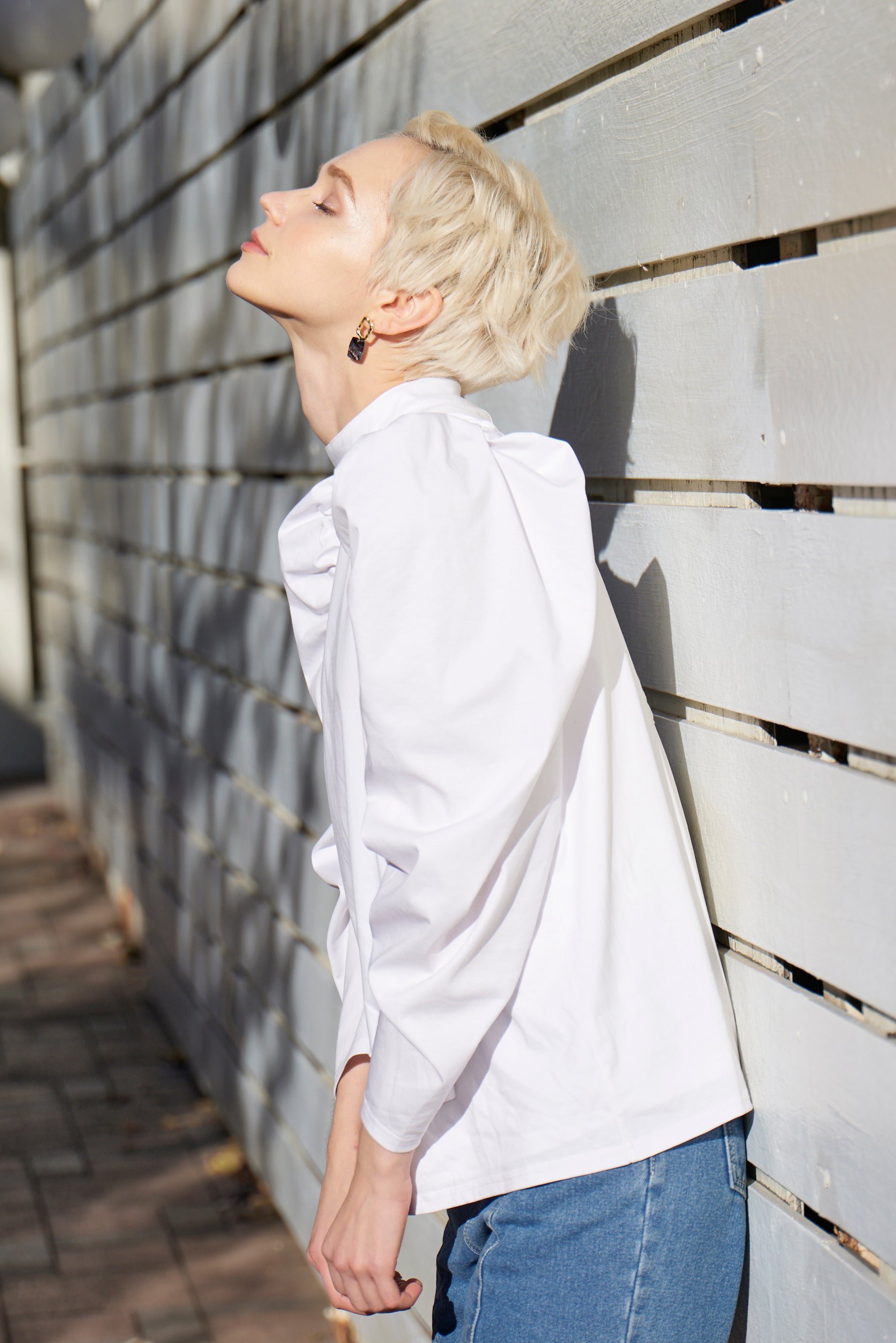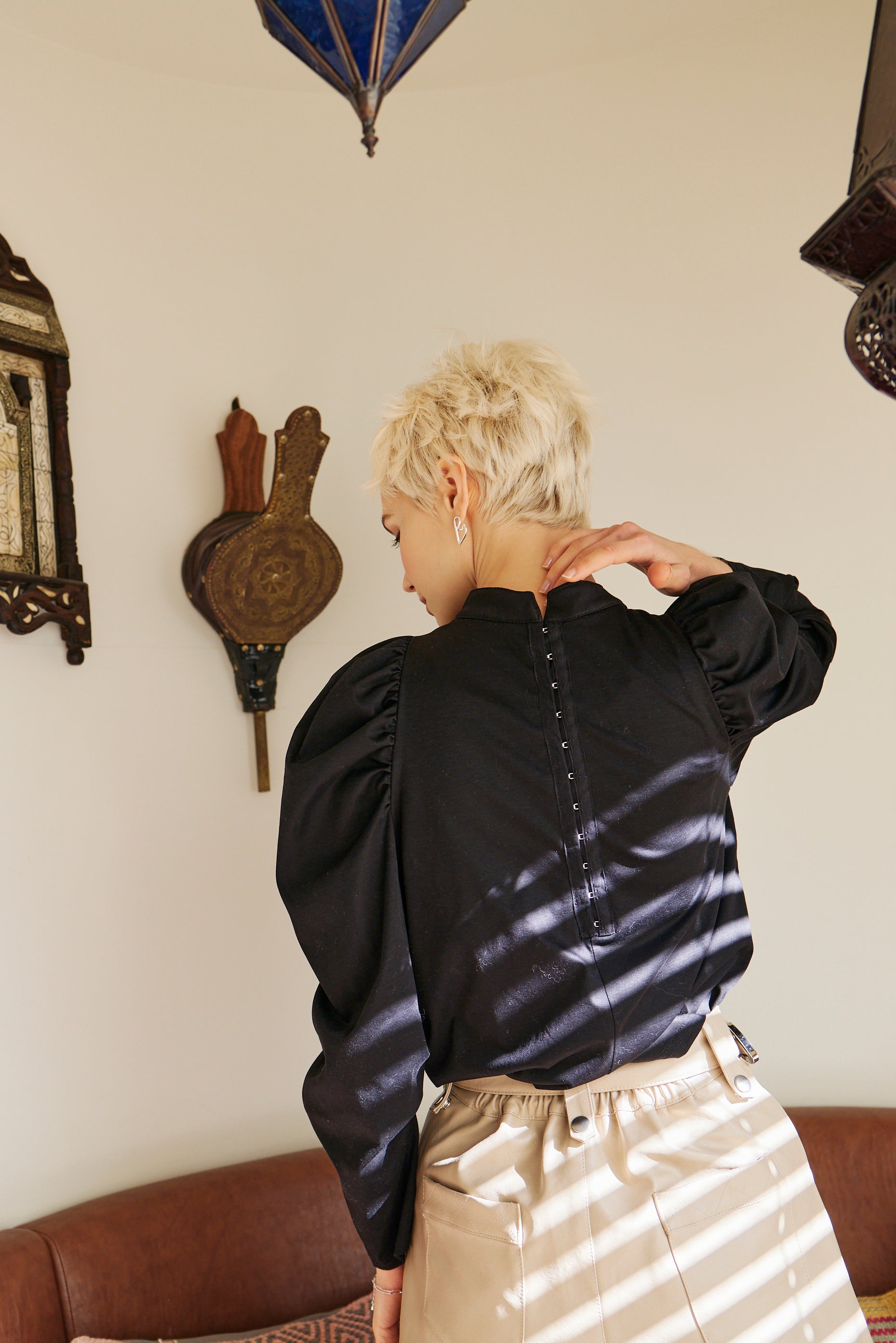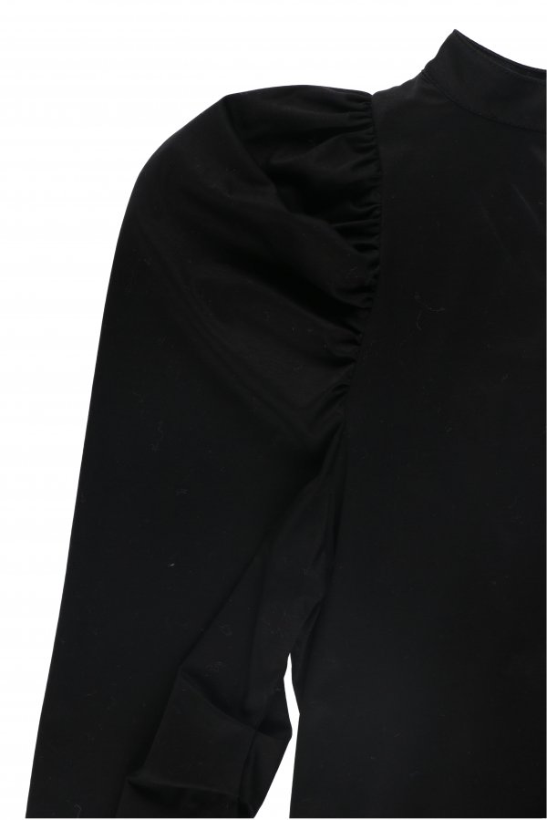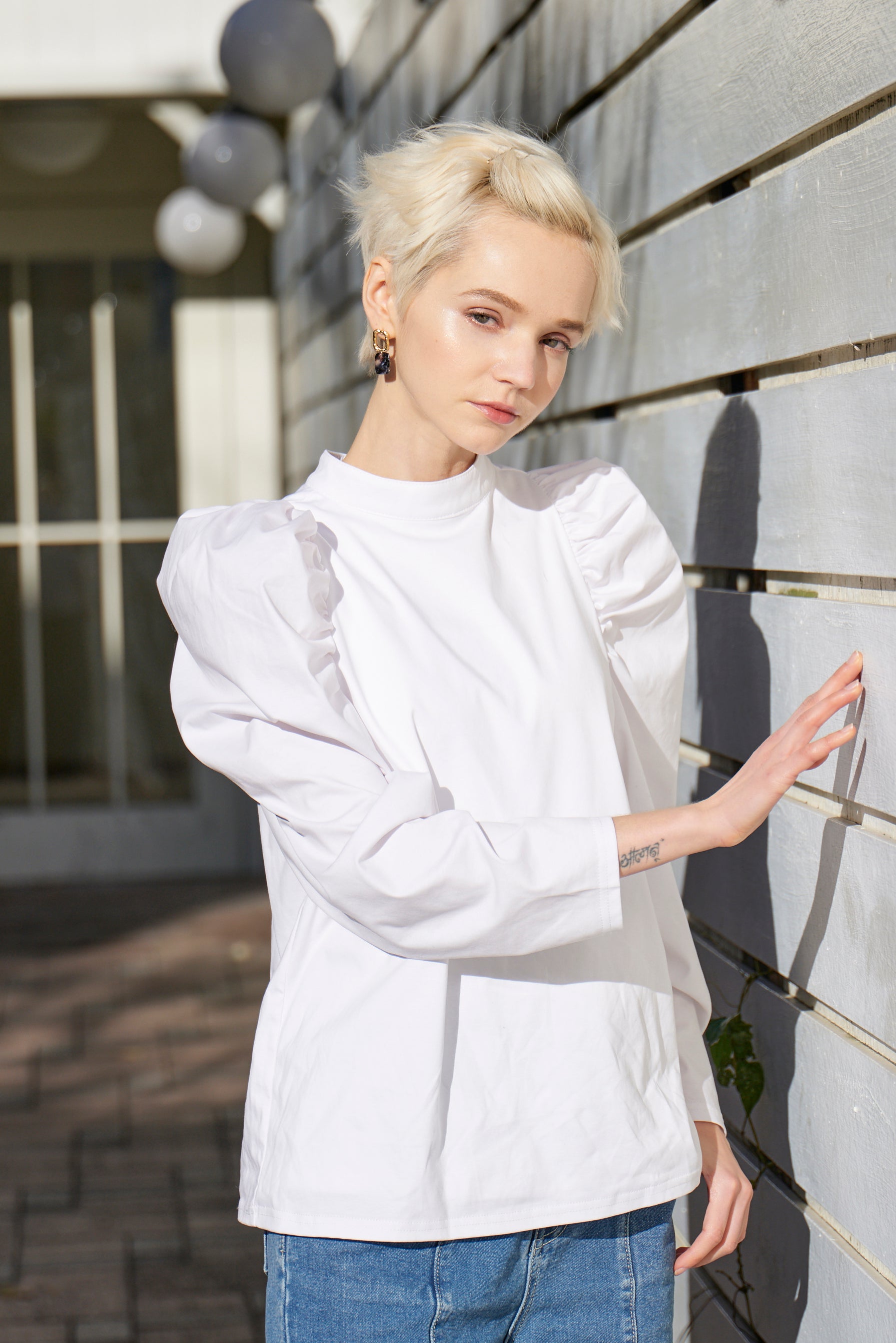 肩と袖の切替を内側にしたことで肩幅を小さくみせ、落ち着いた印象に。