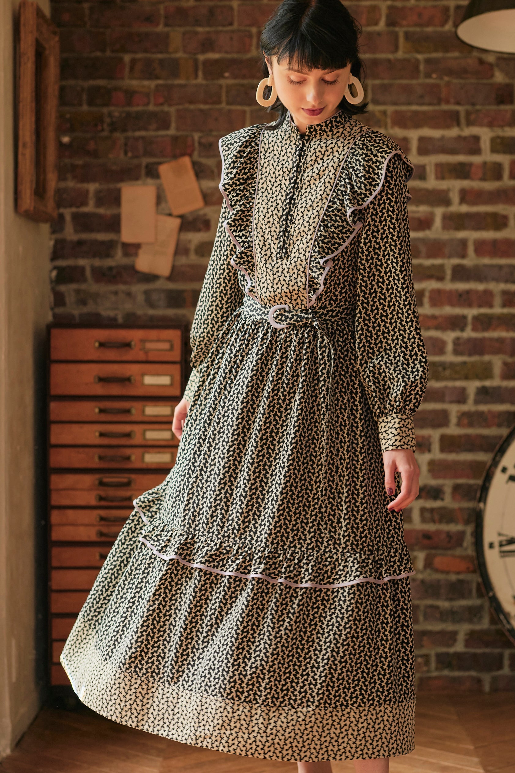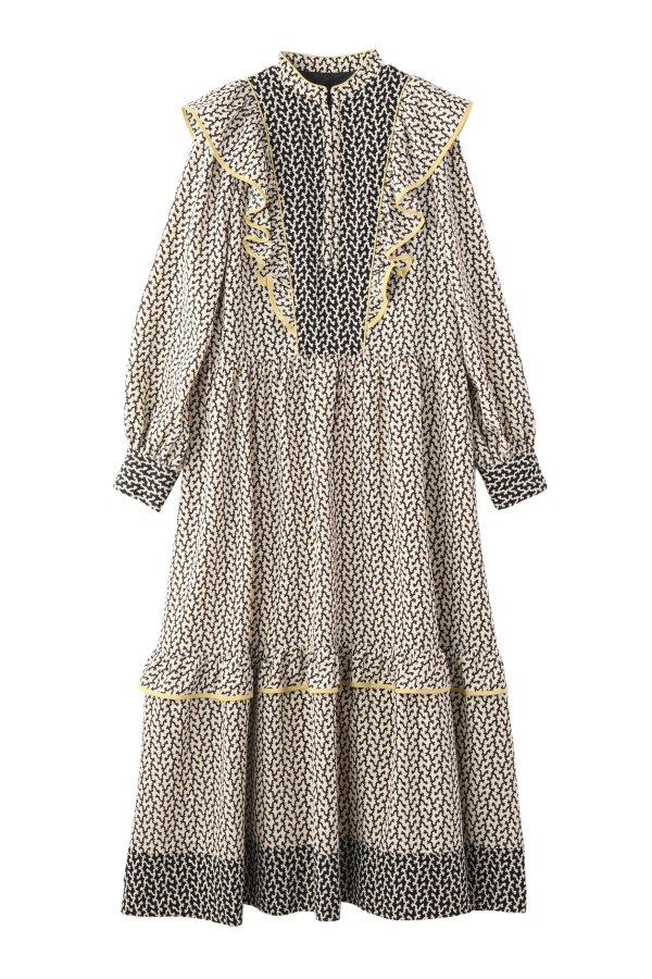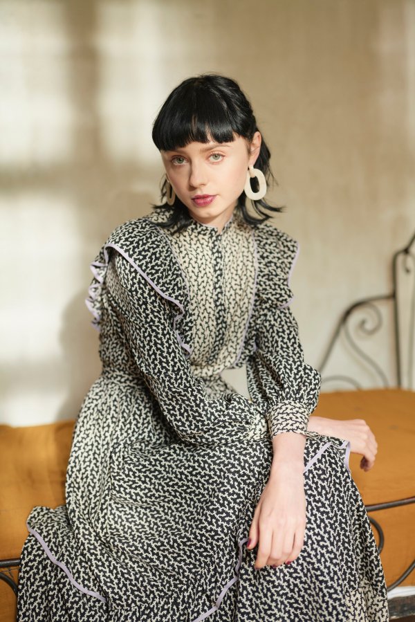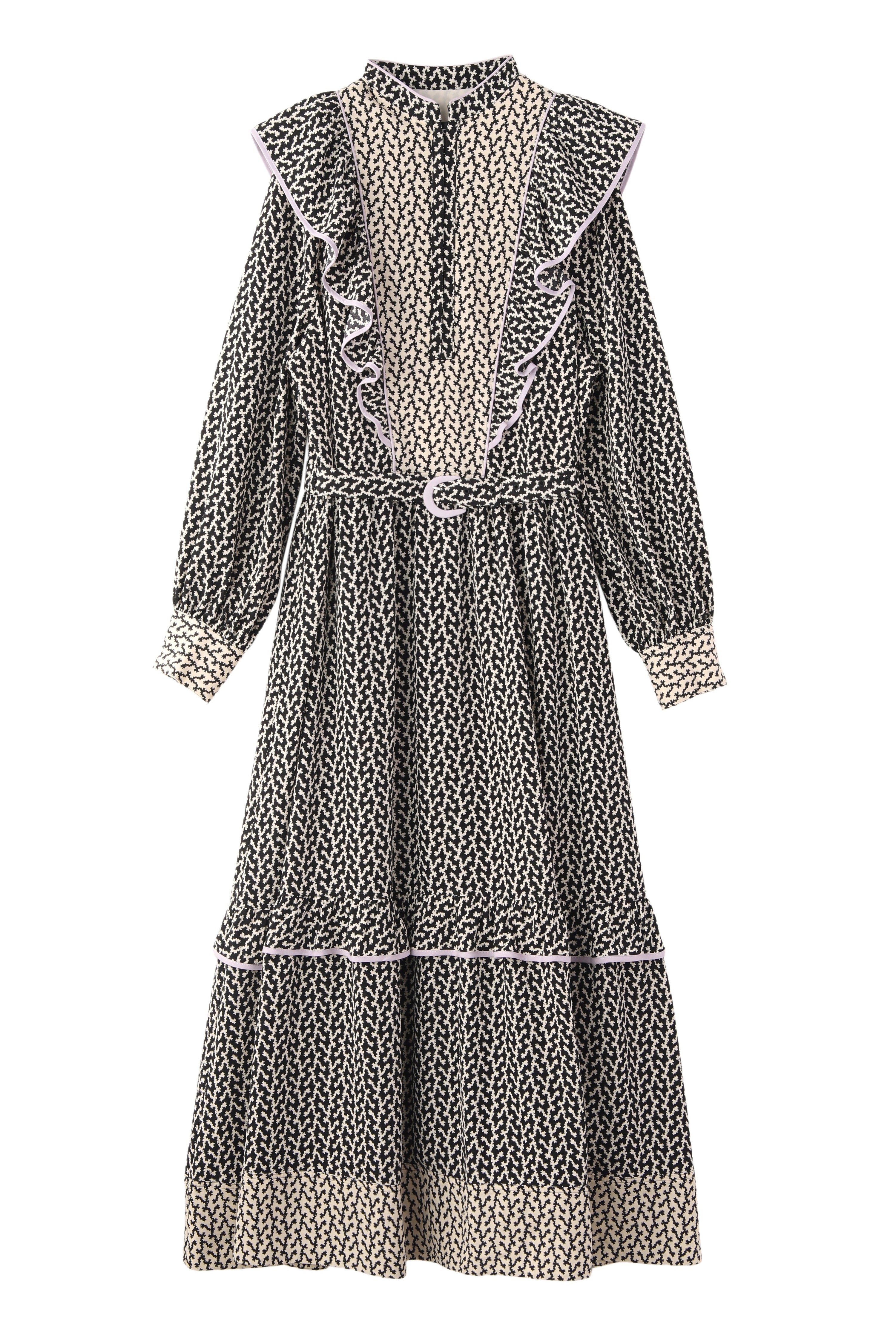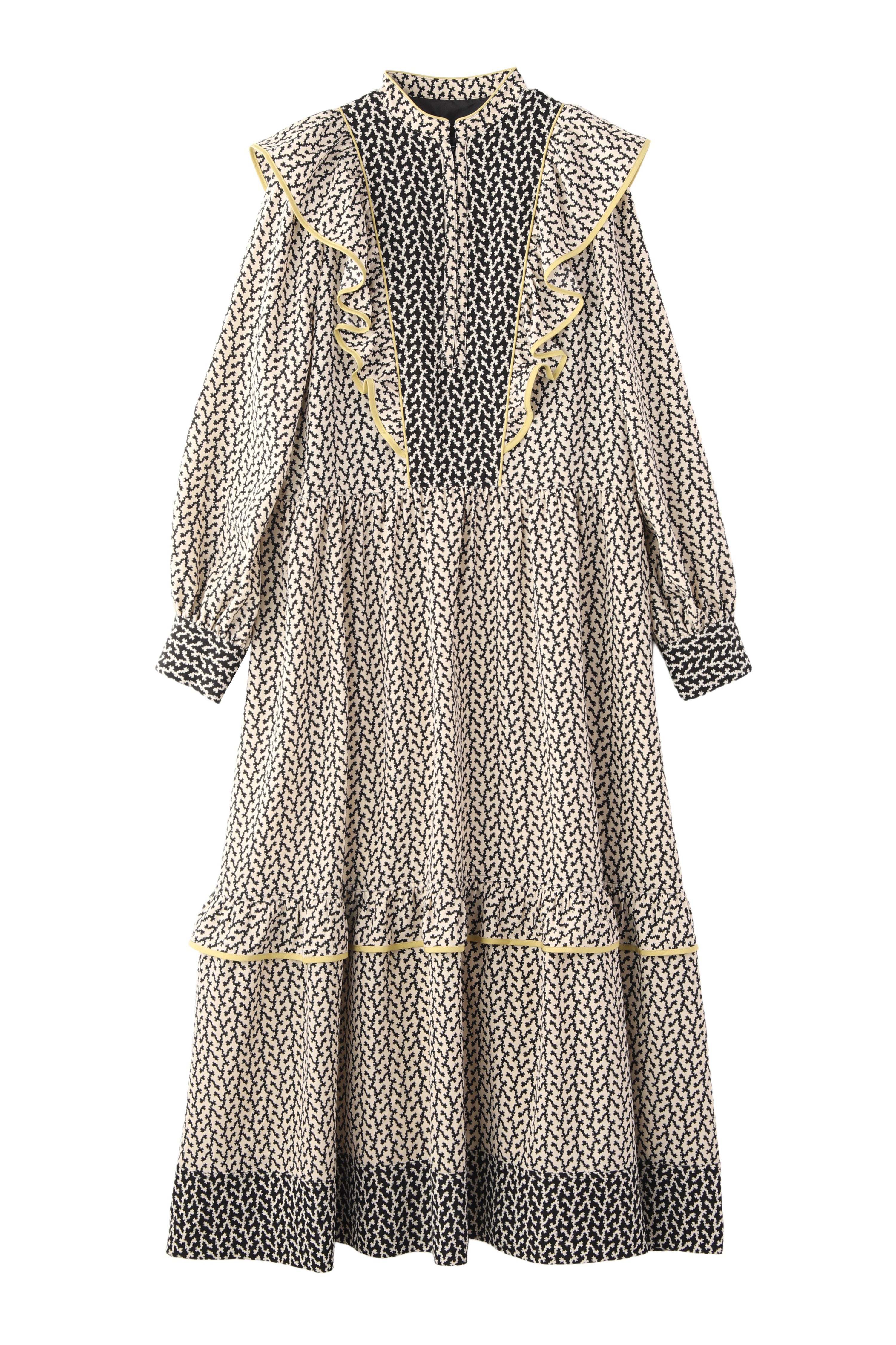モノトーンの柄ワンピース。