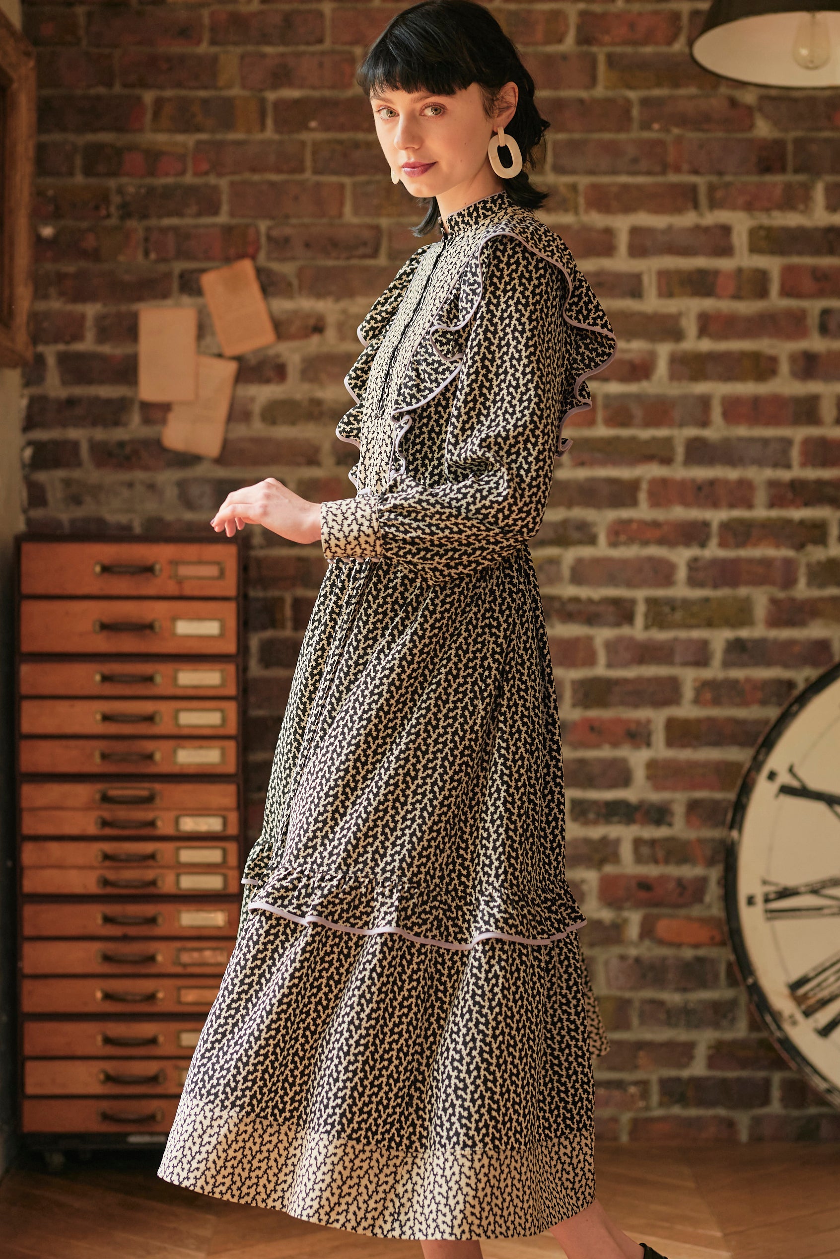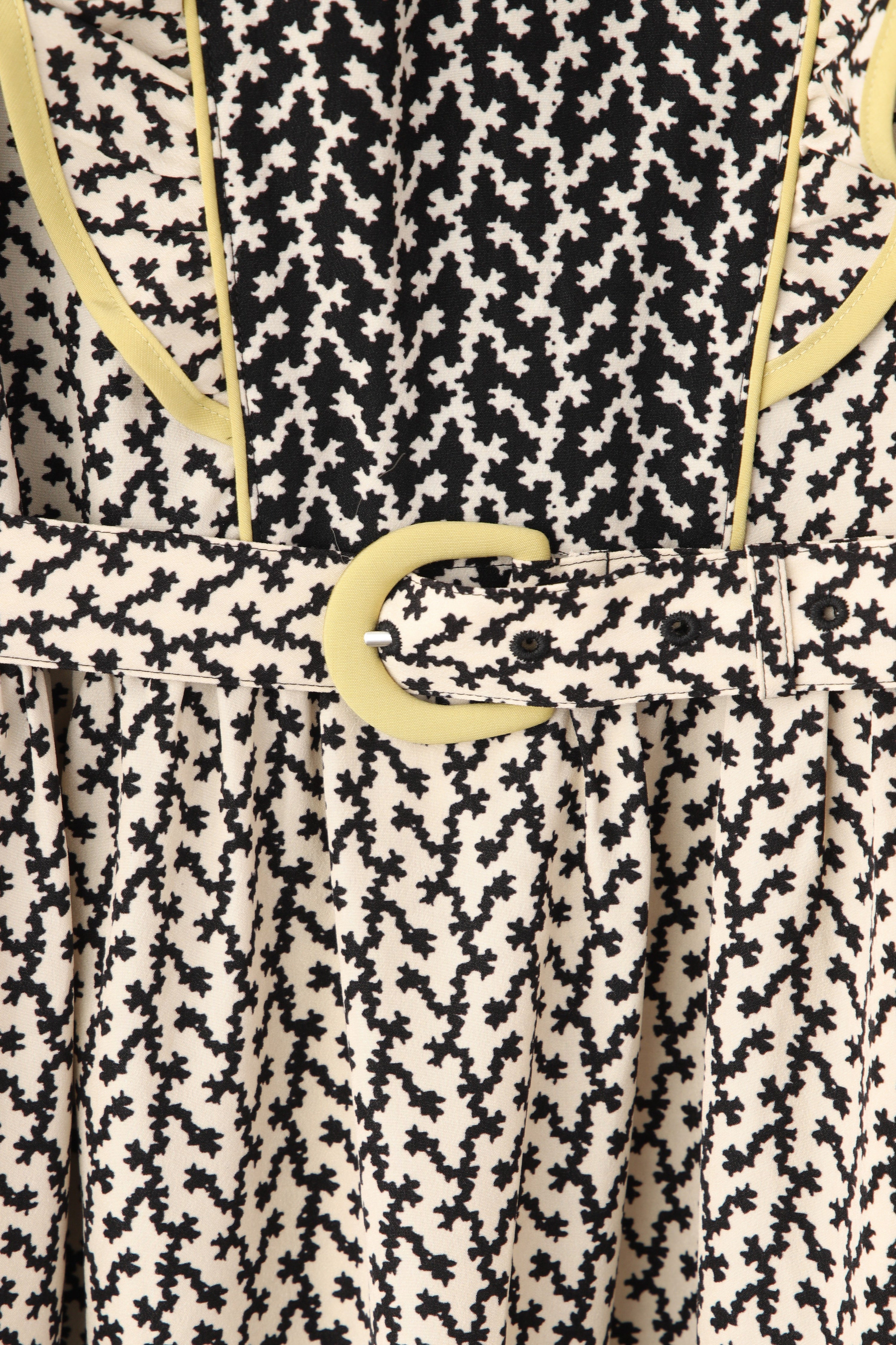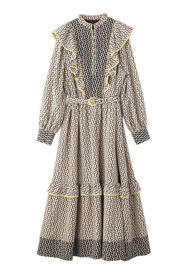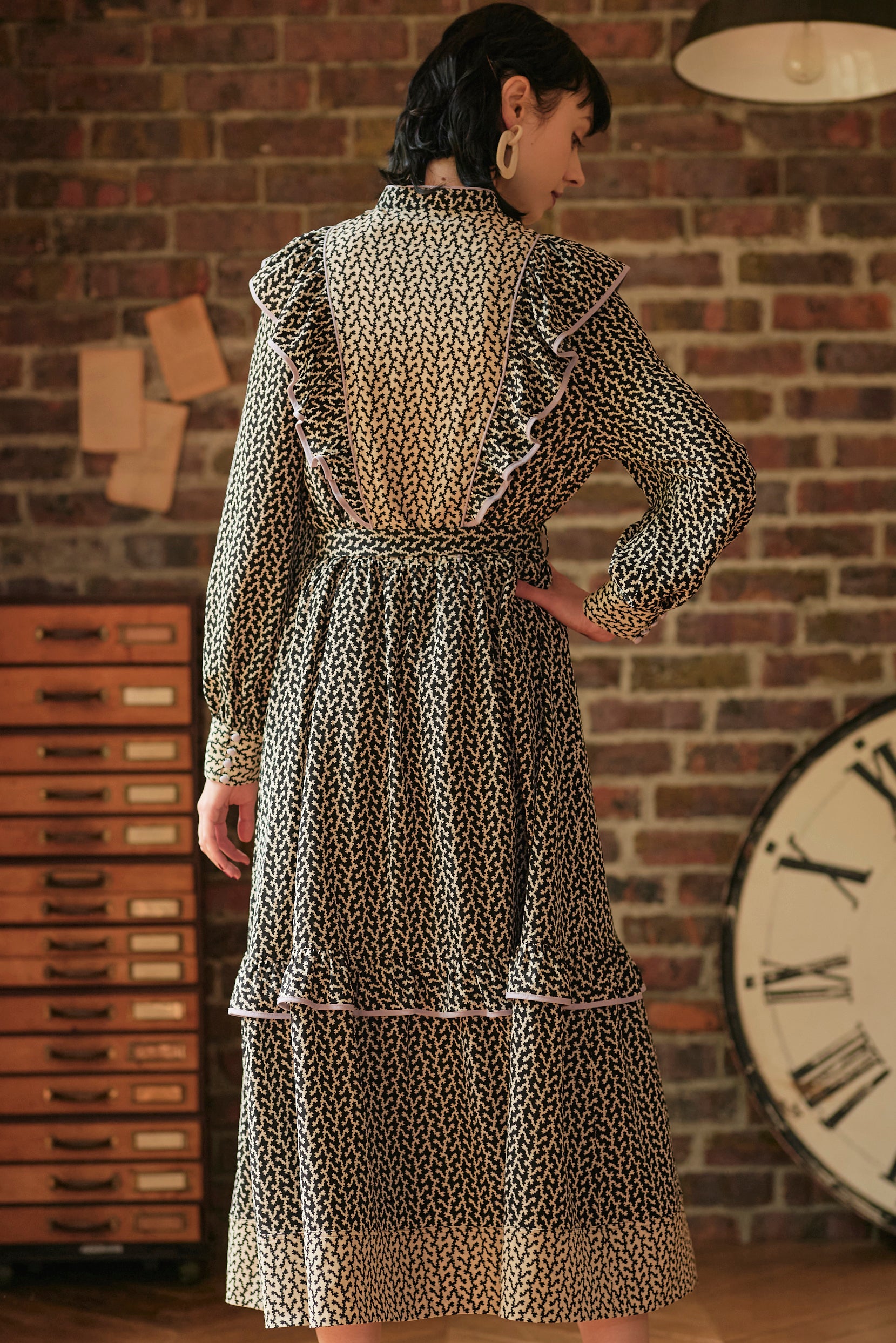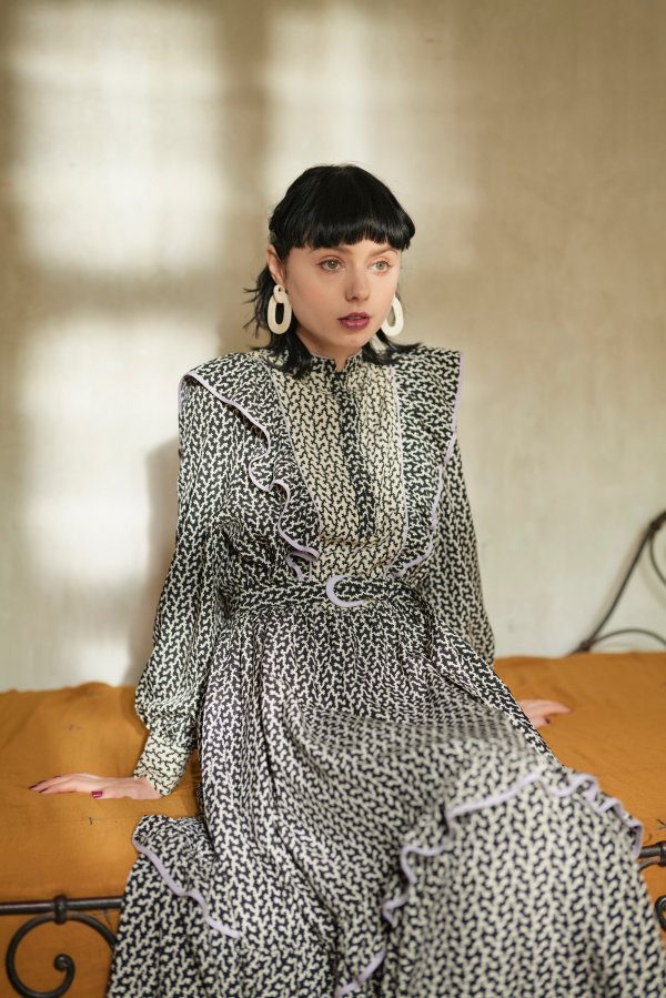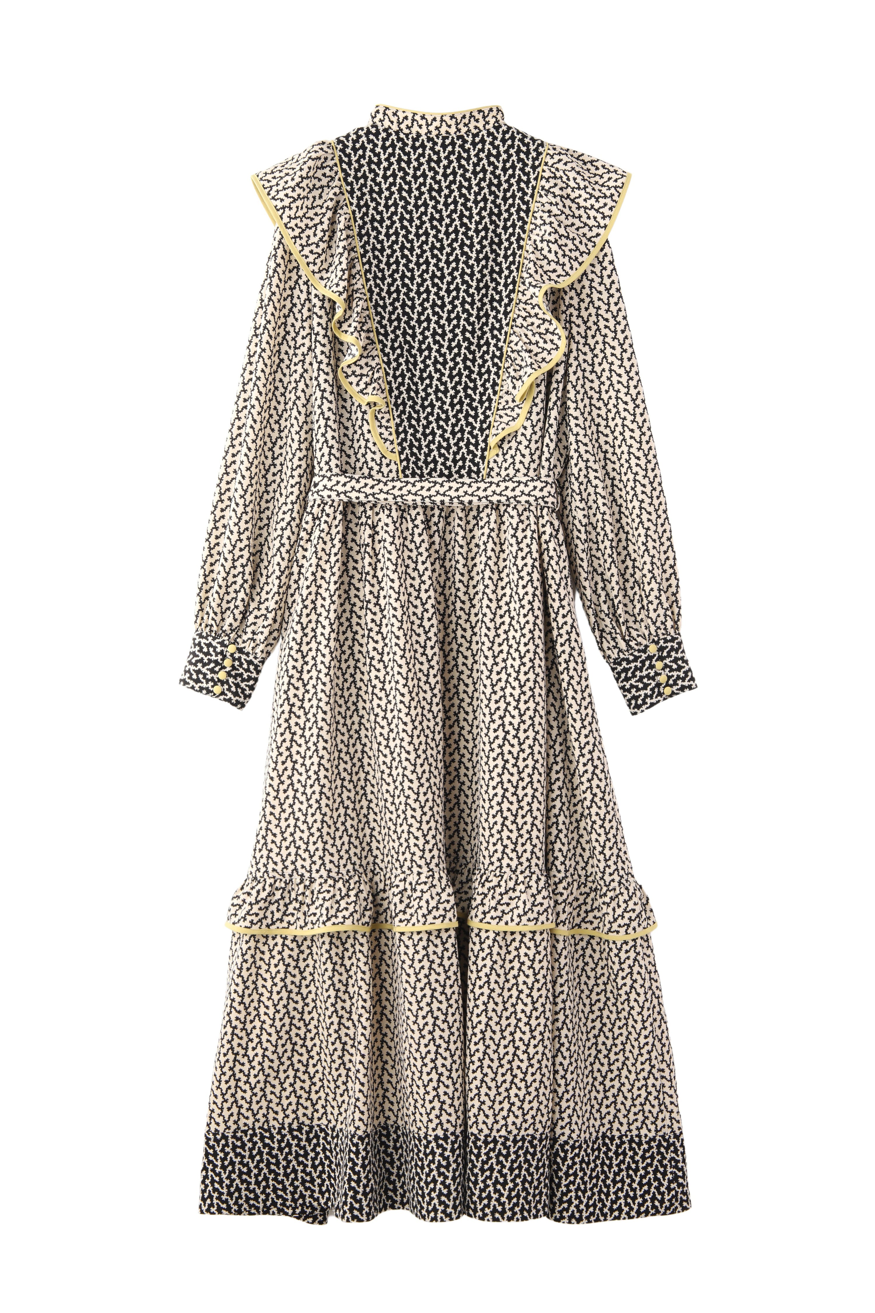モノトーンの柄ワンピース。