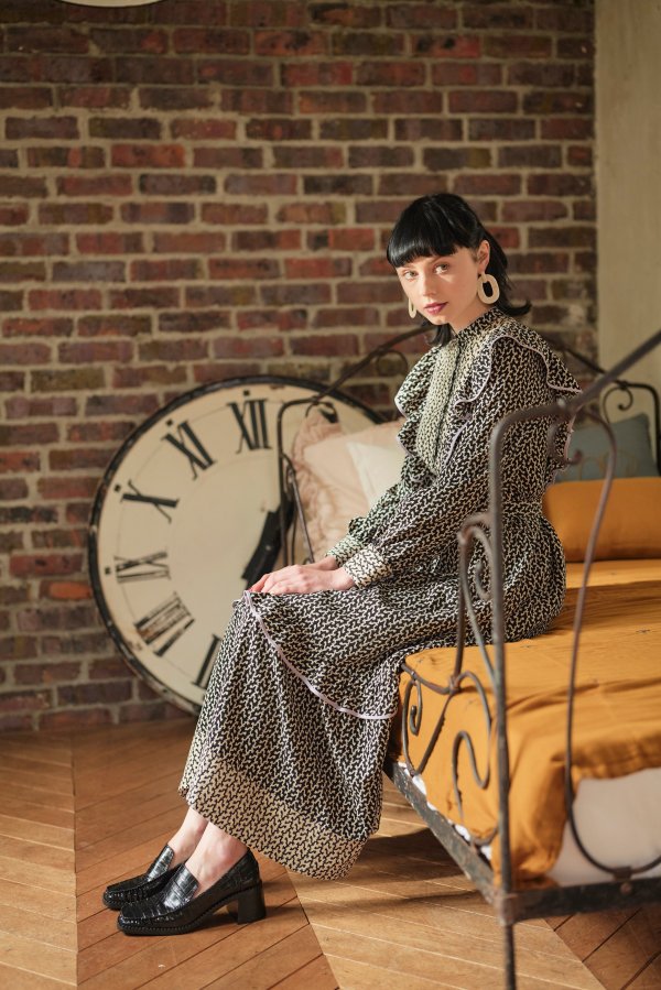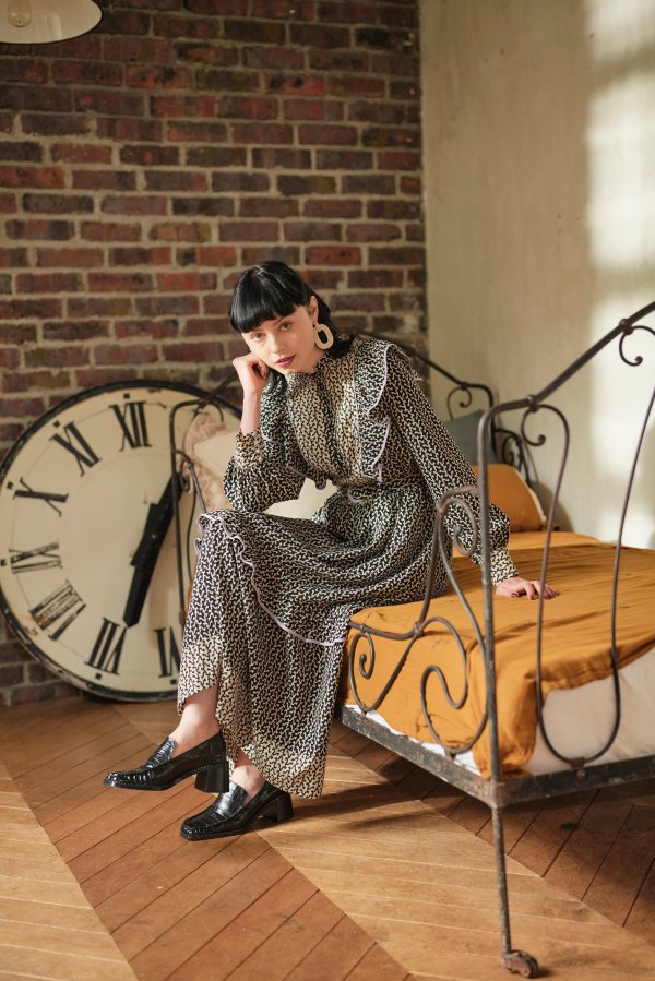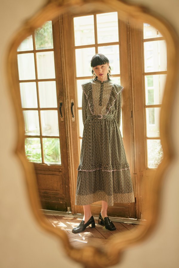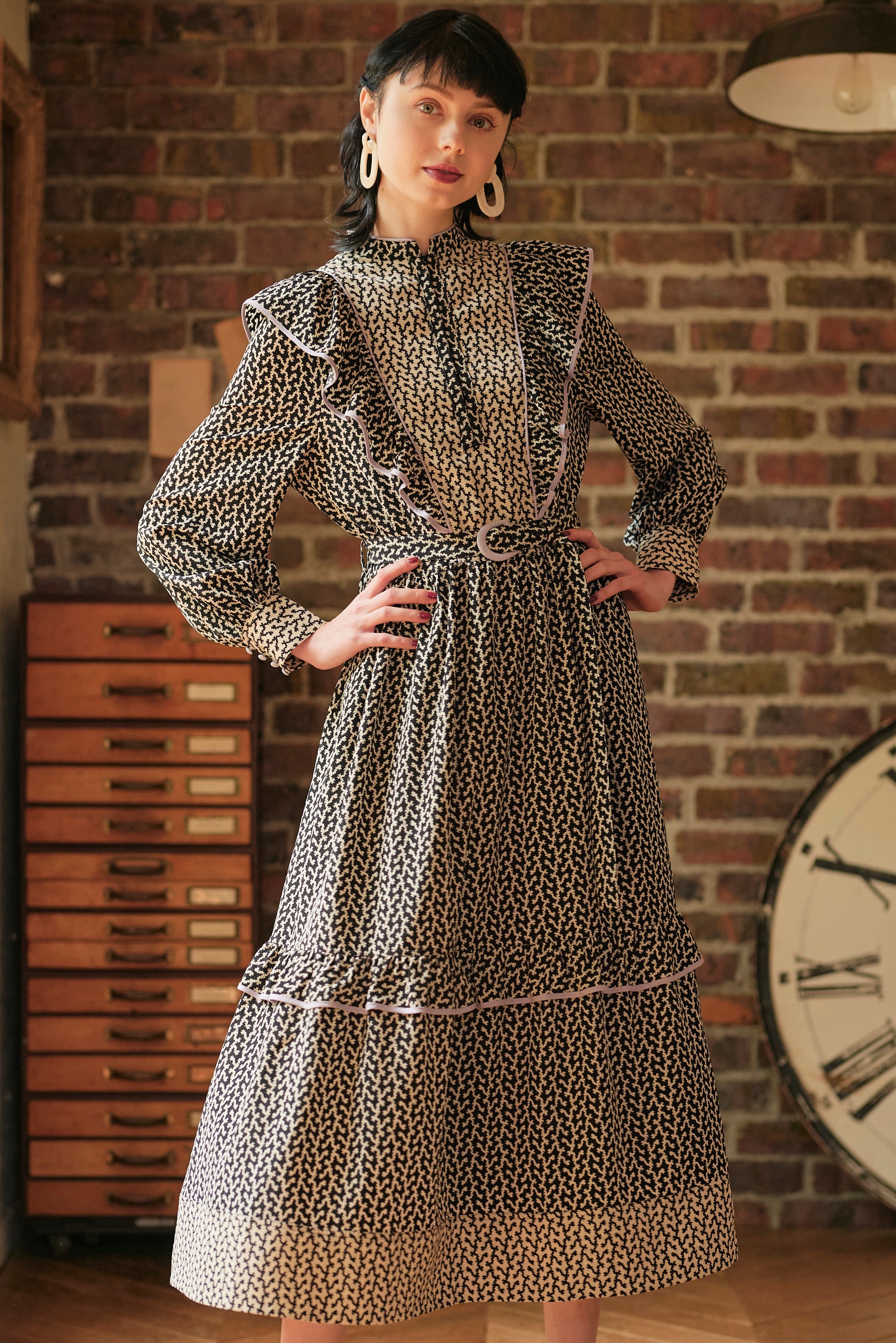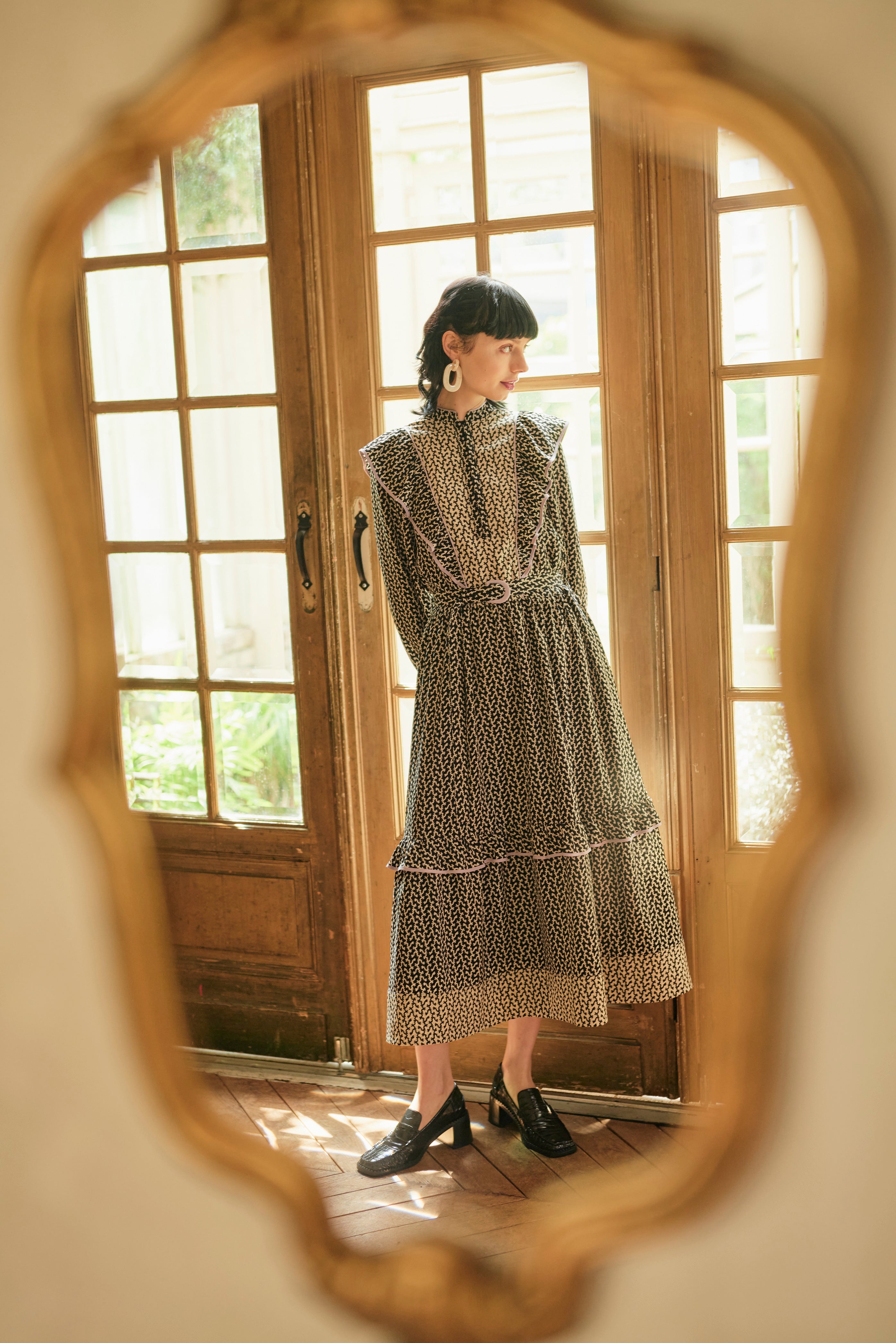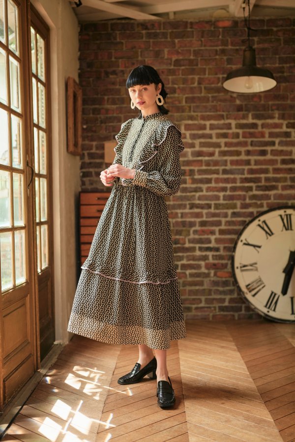 モノトーンの柄ワンピース。