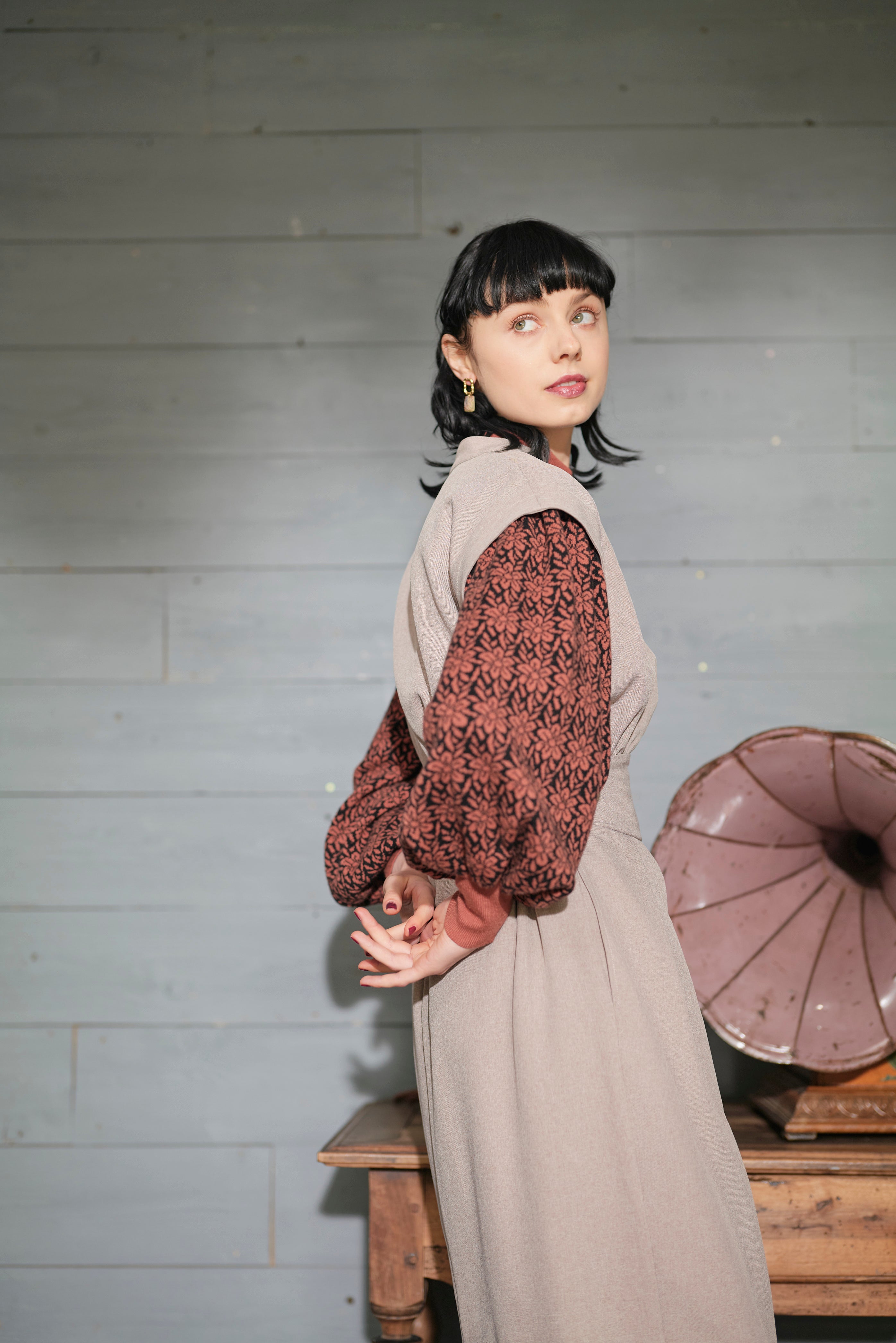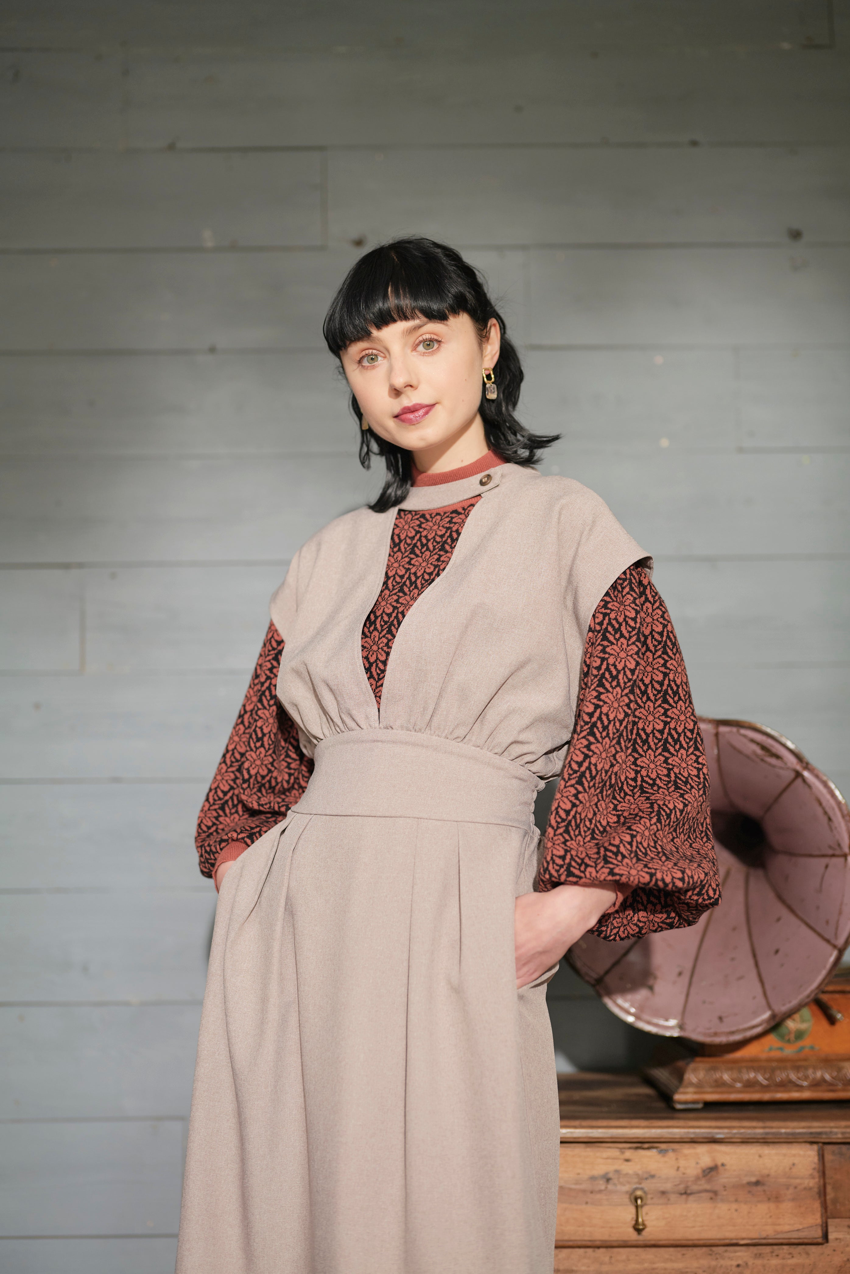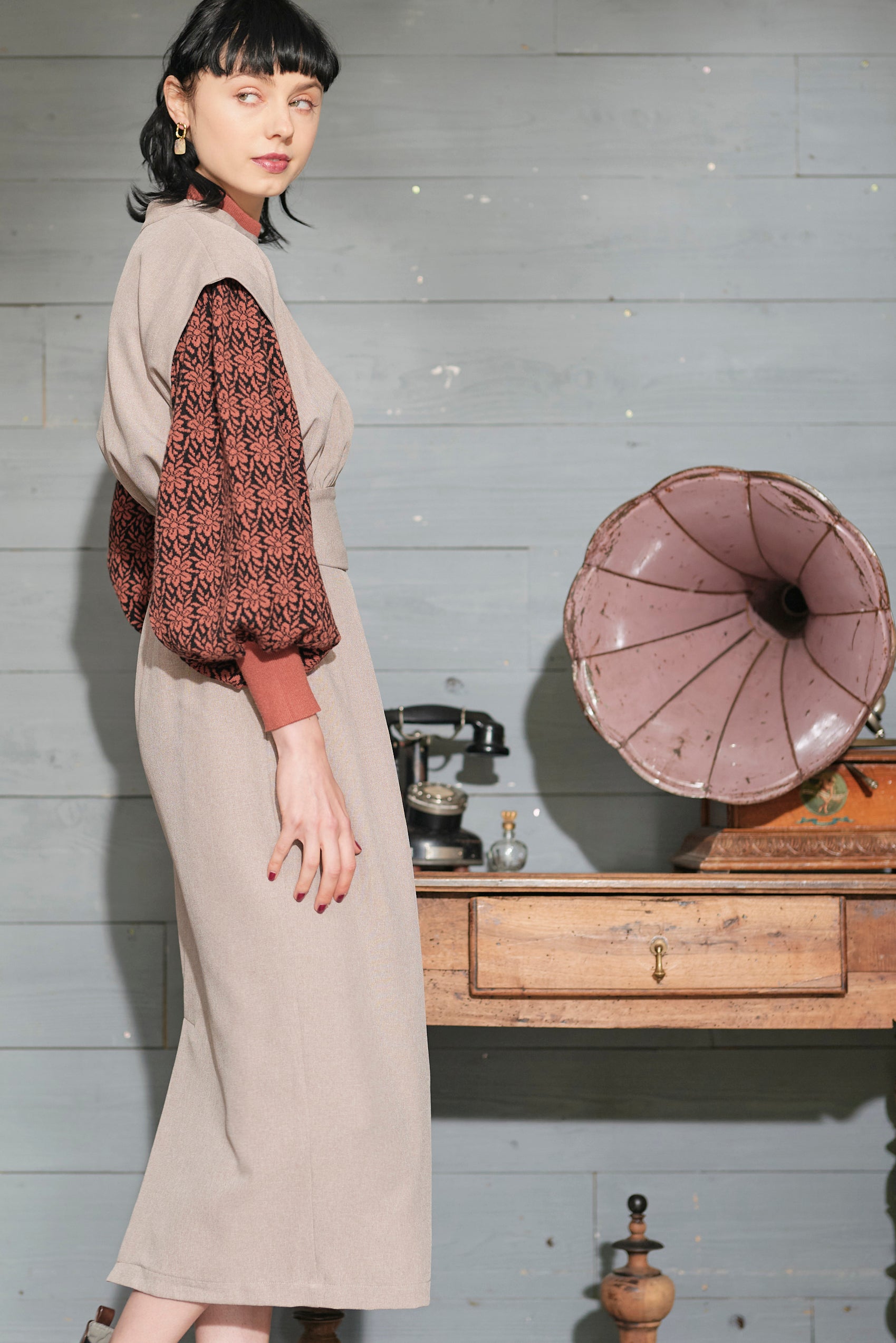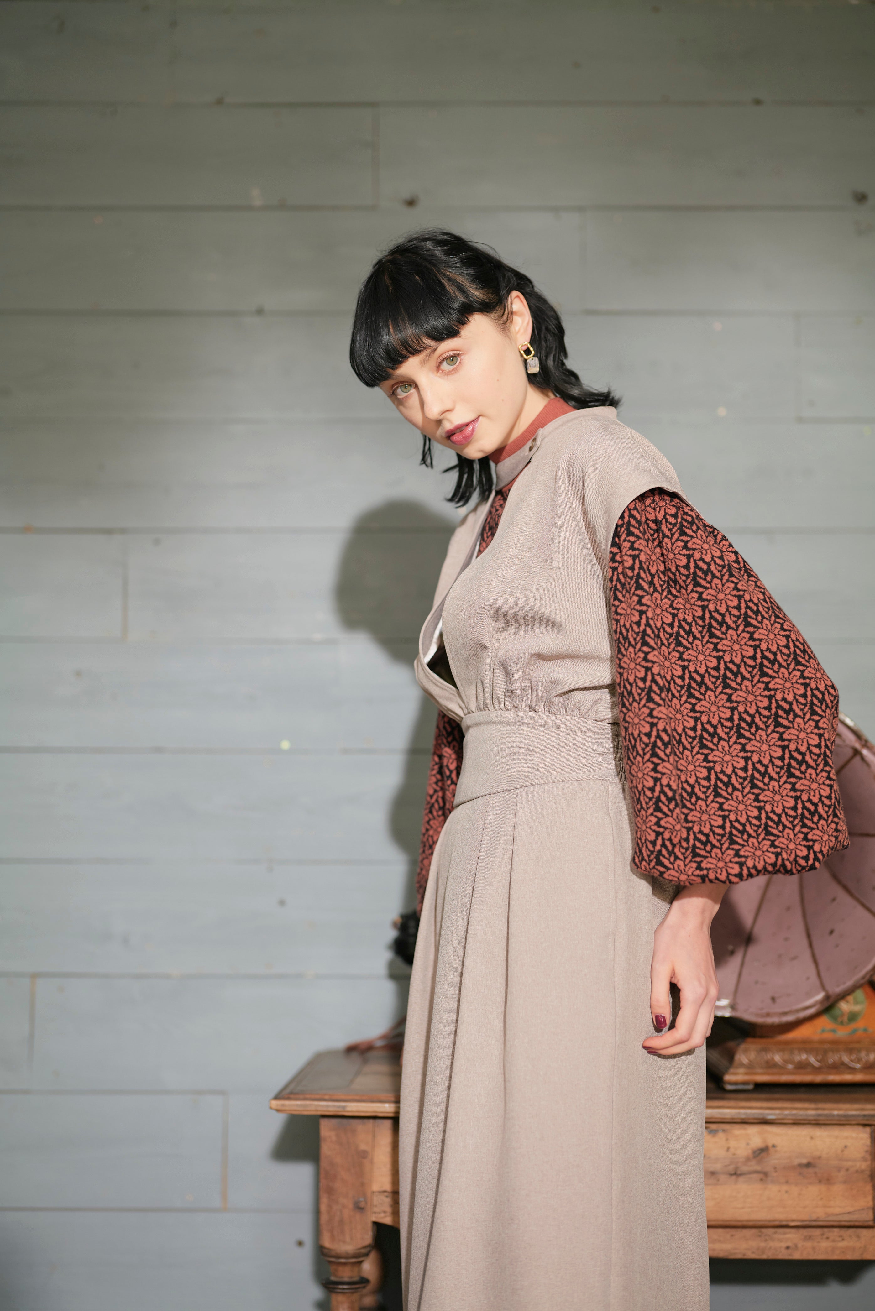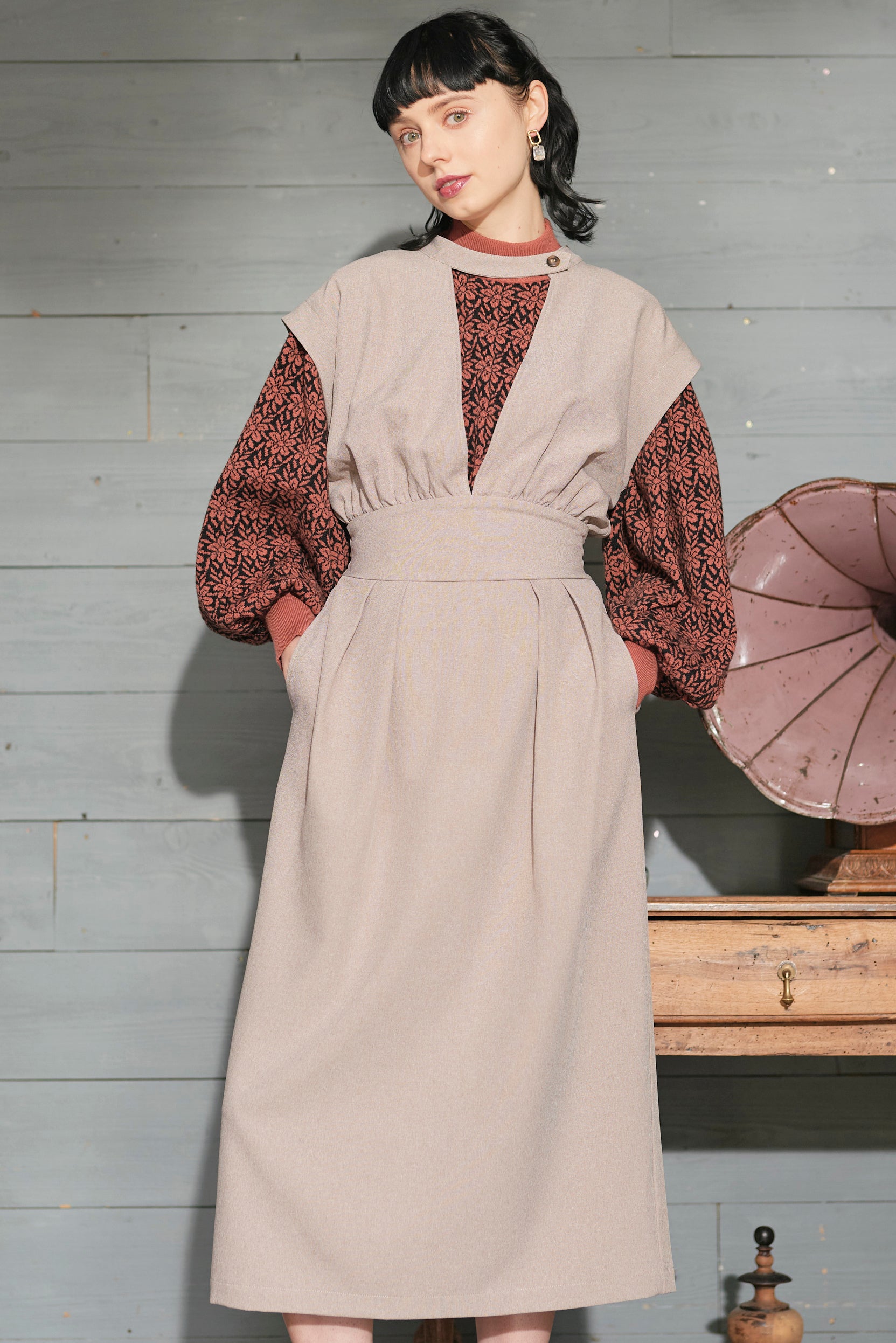 モード感のあるワンピースのセットアイテム。