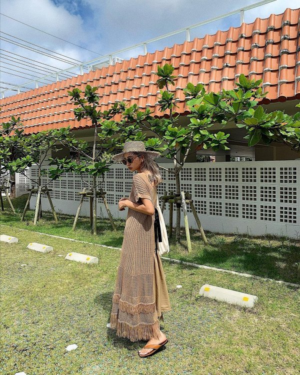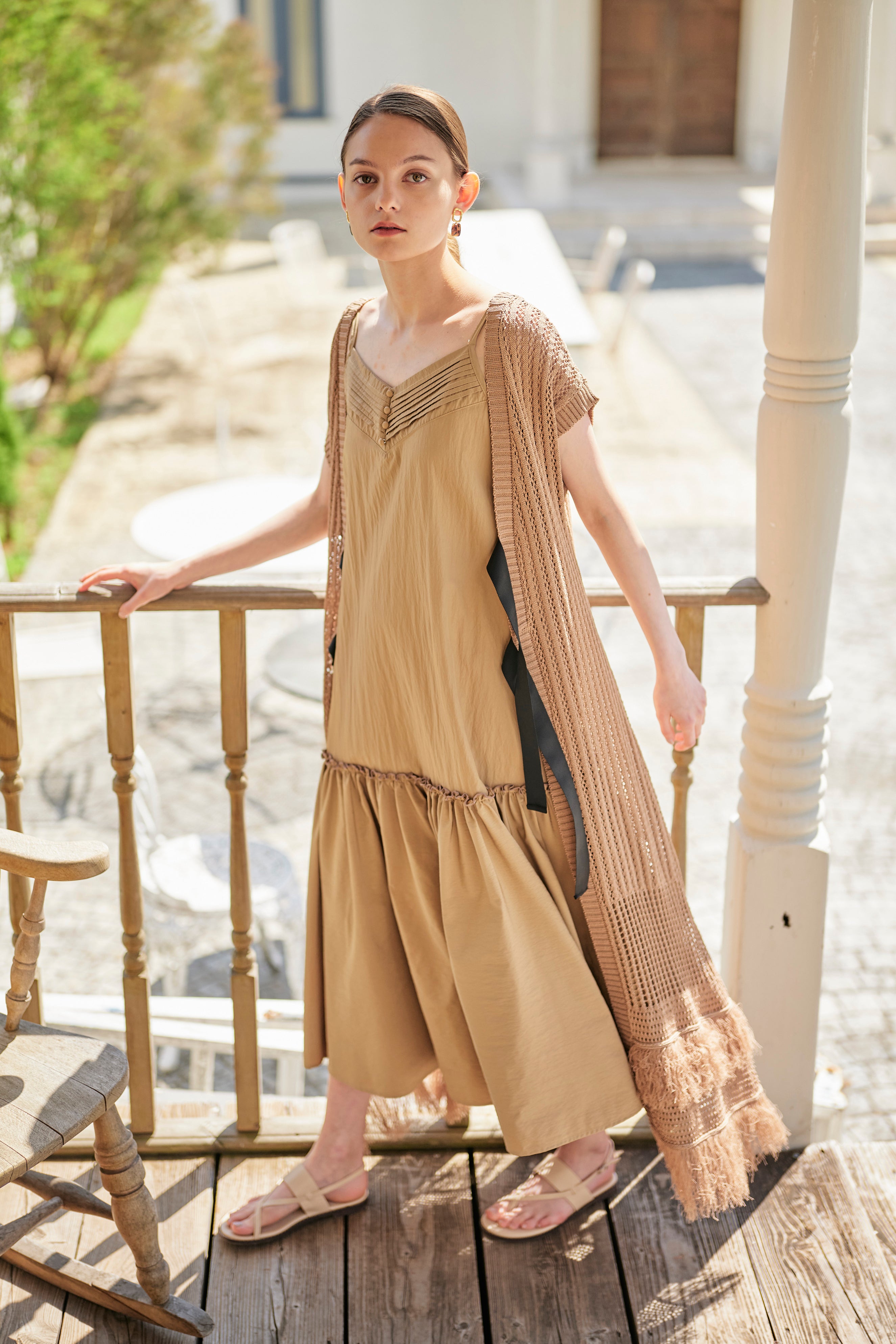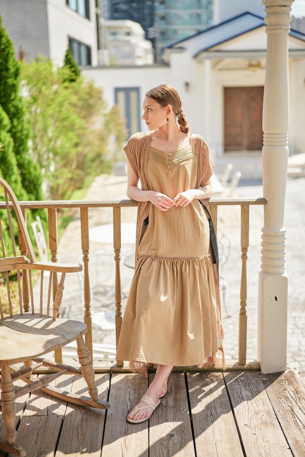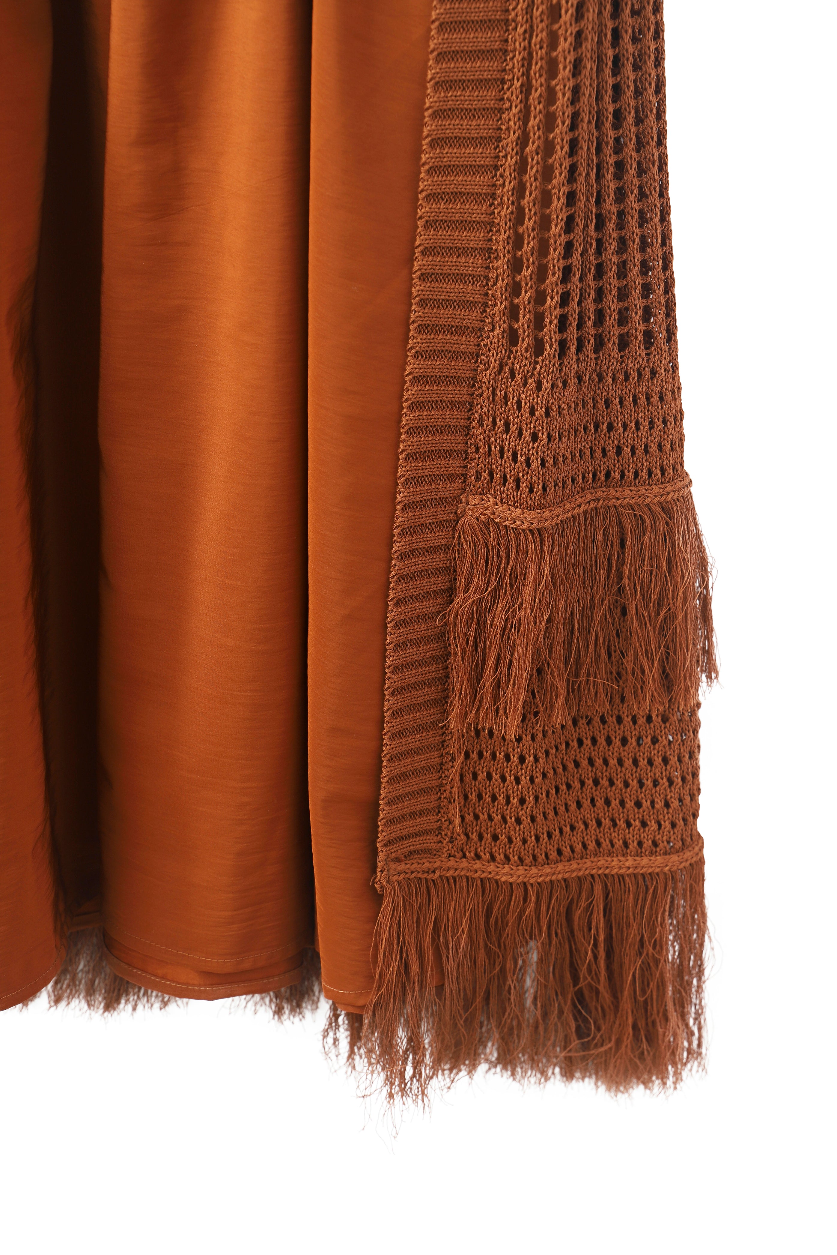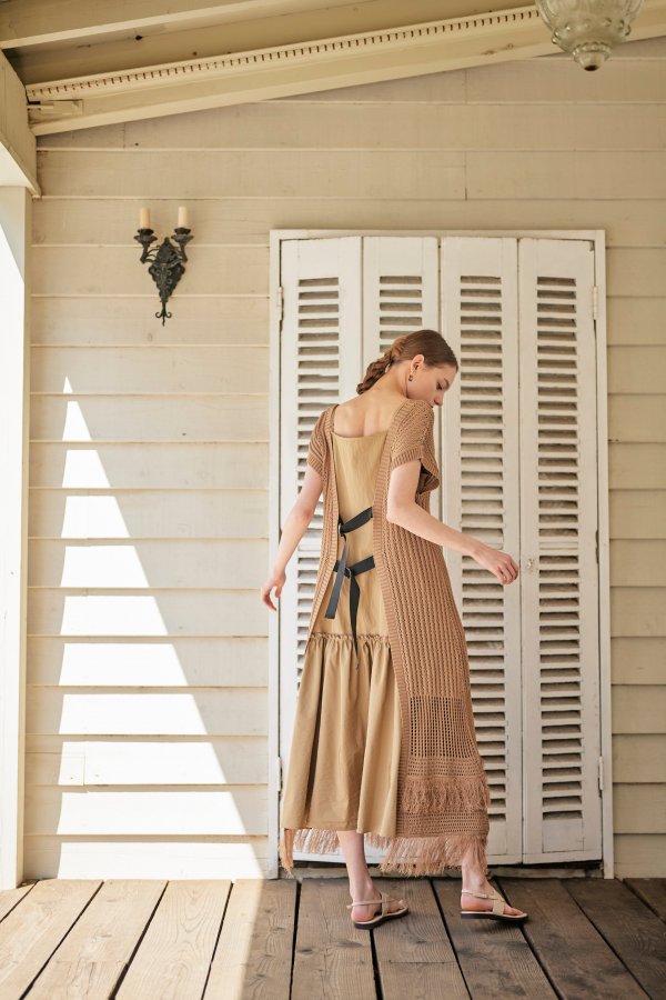 インナーワンピースがセットになった、かぎ針のロングカーディガン。