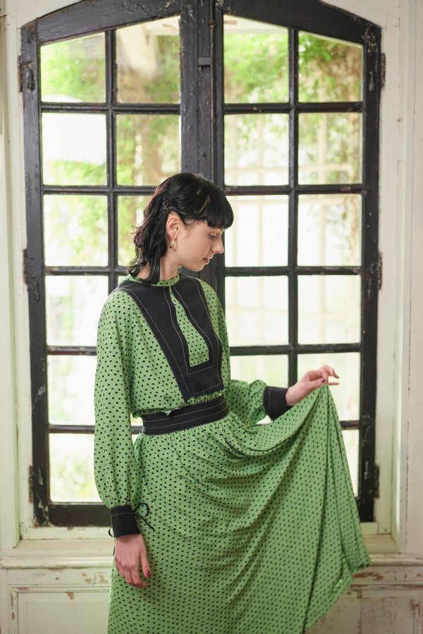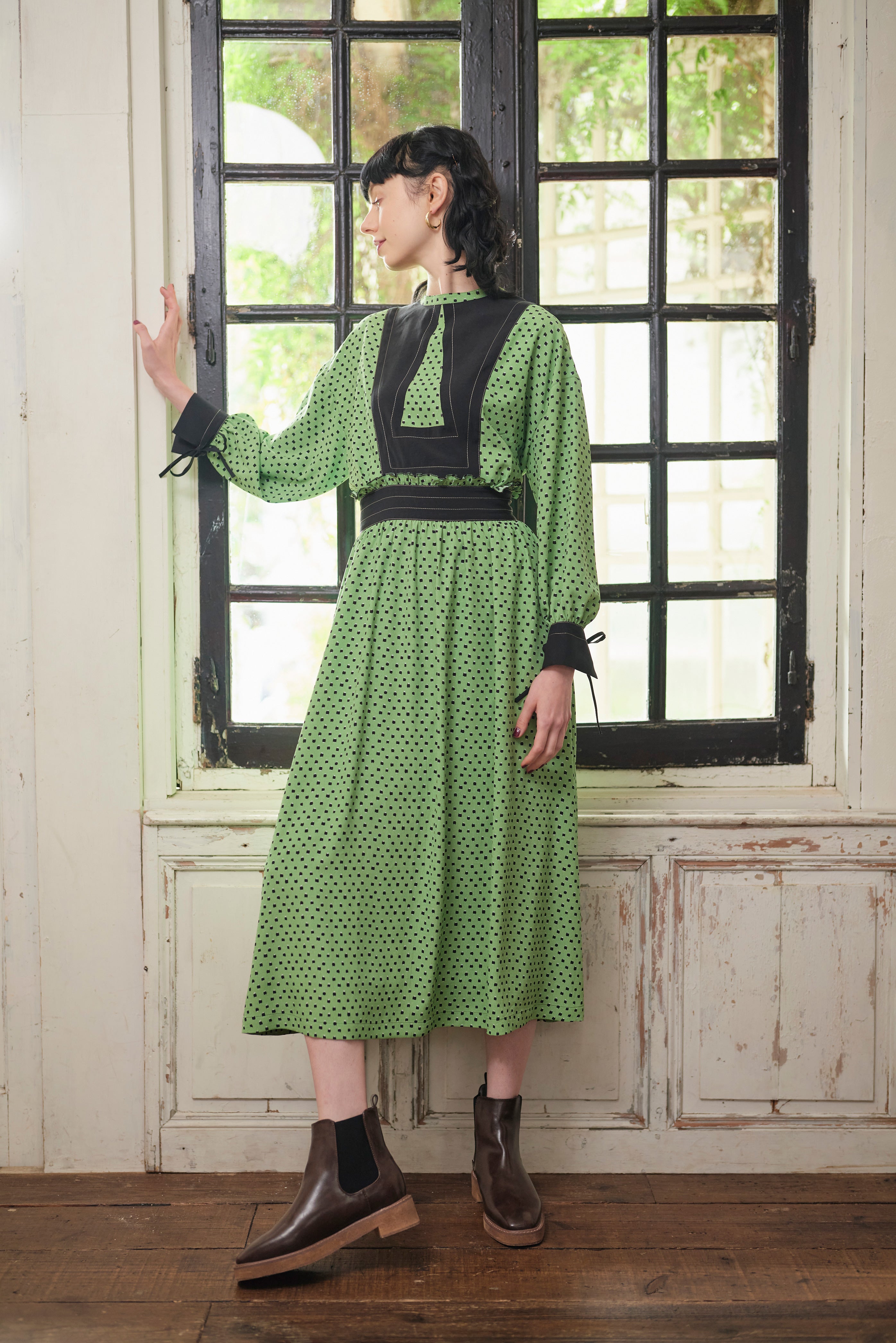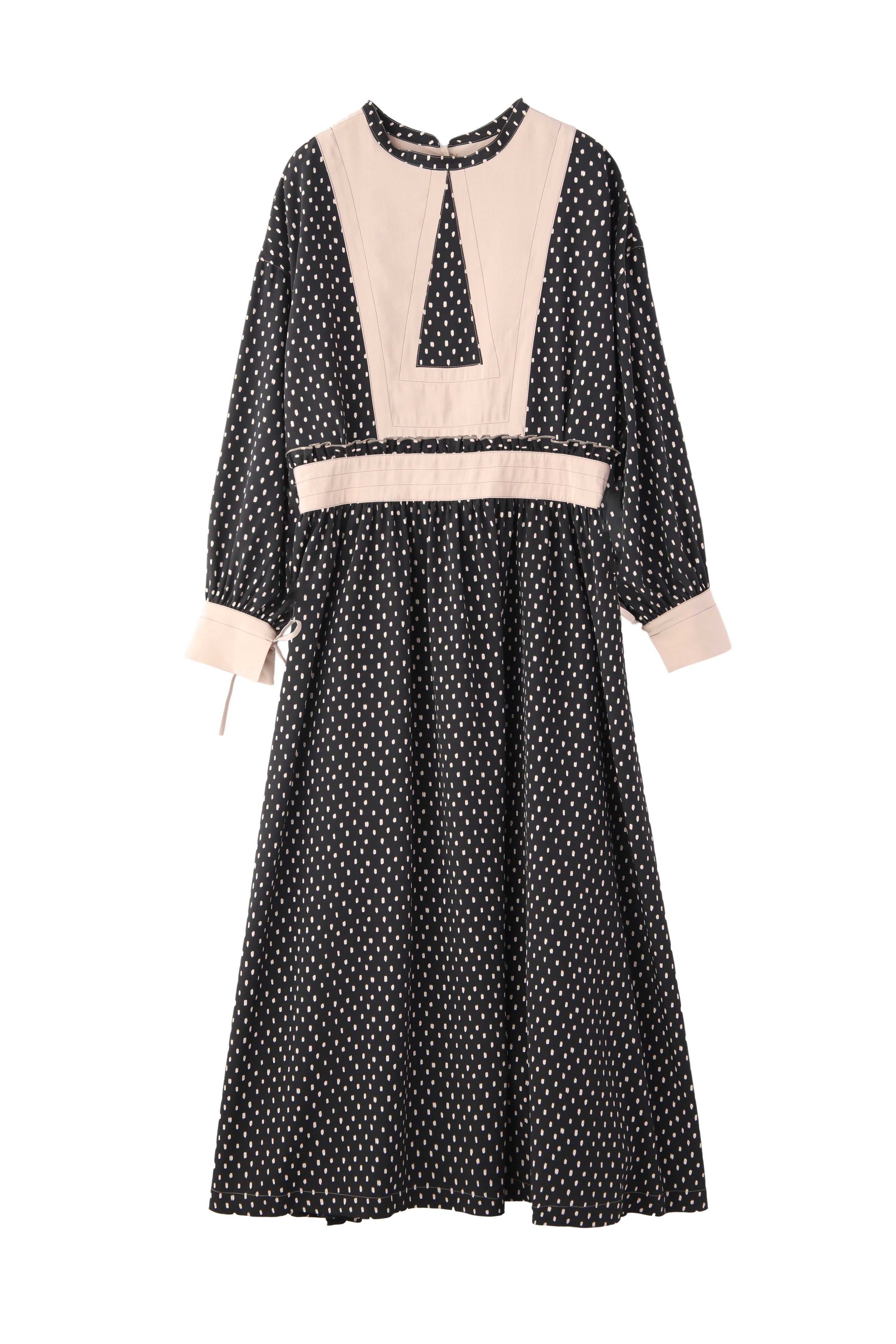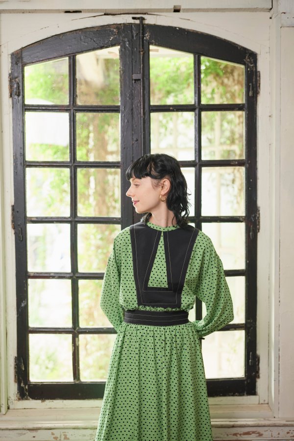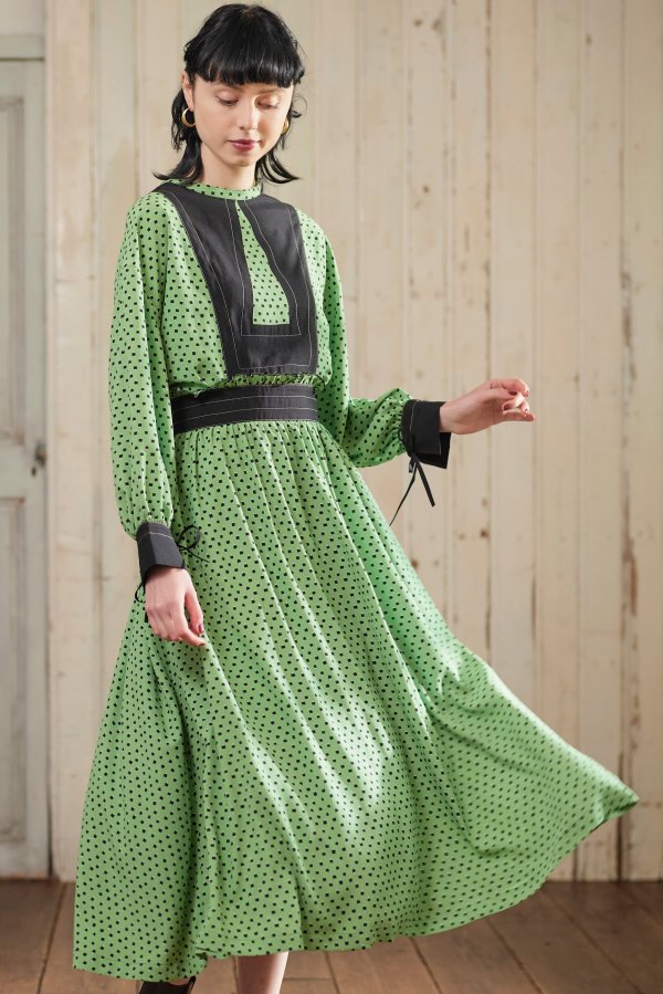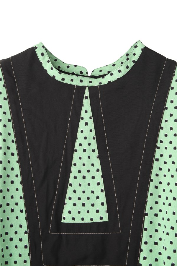 柄のワンピースも無地のパーツで切り替えて