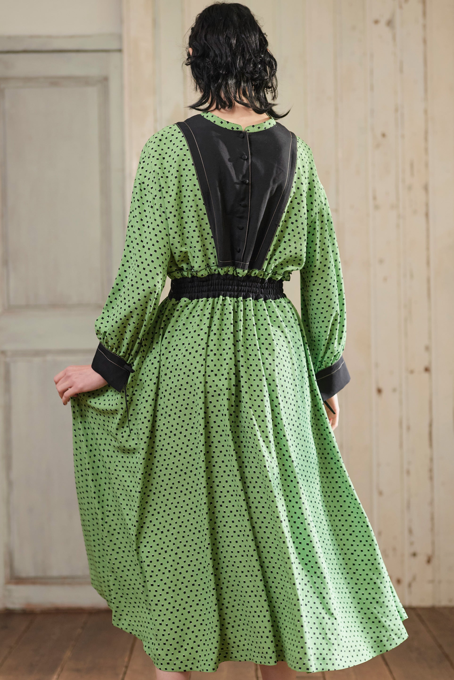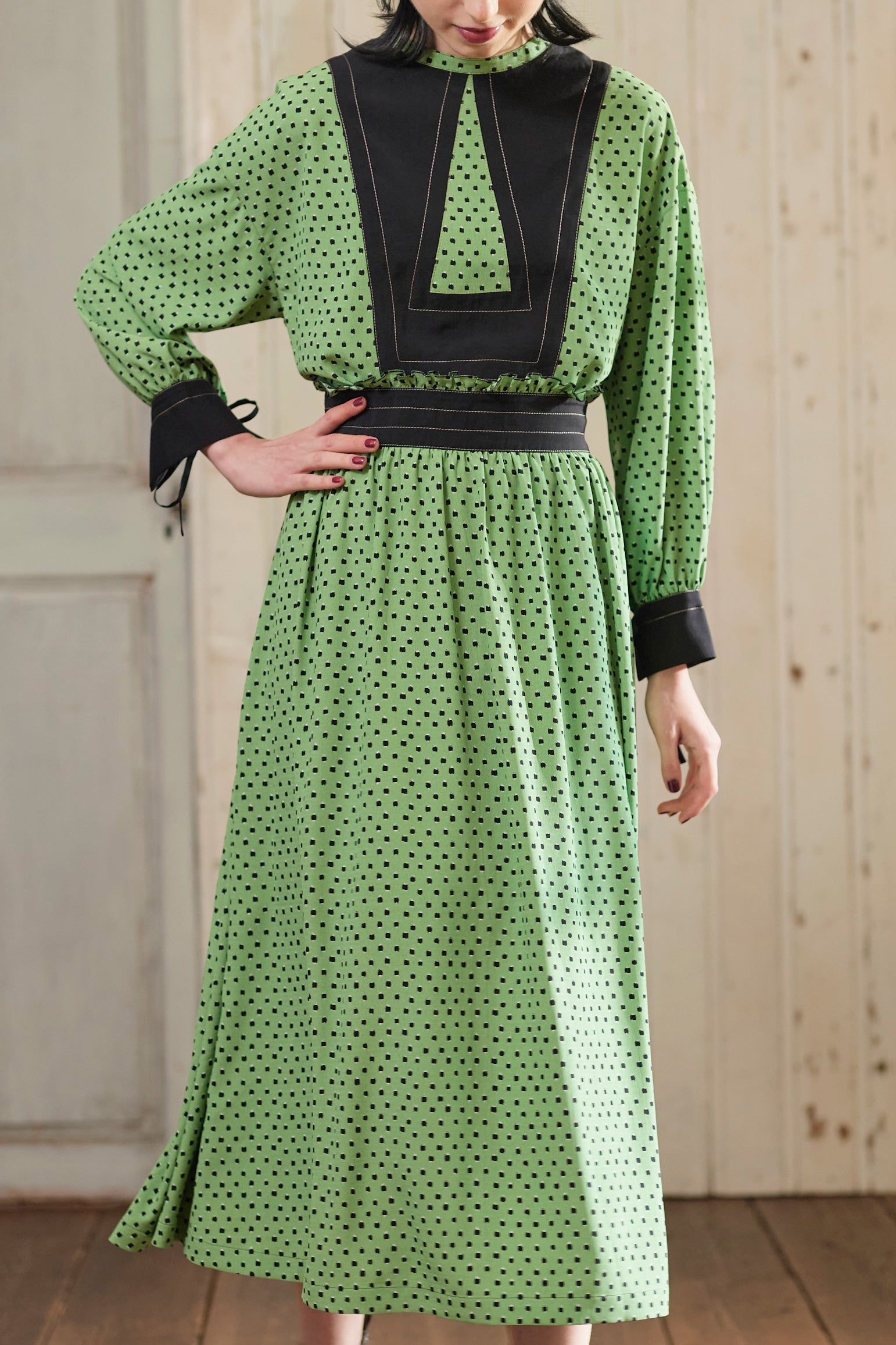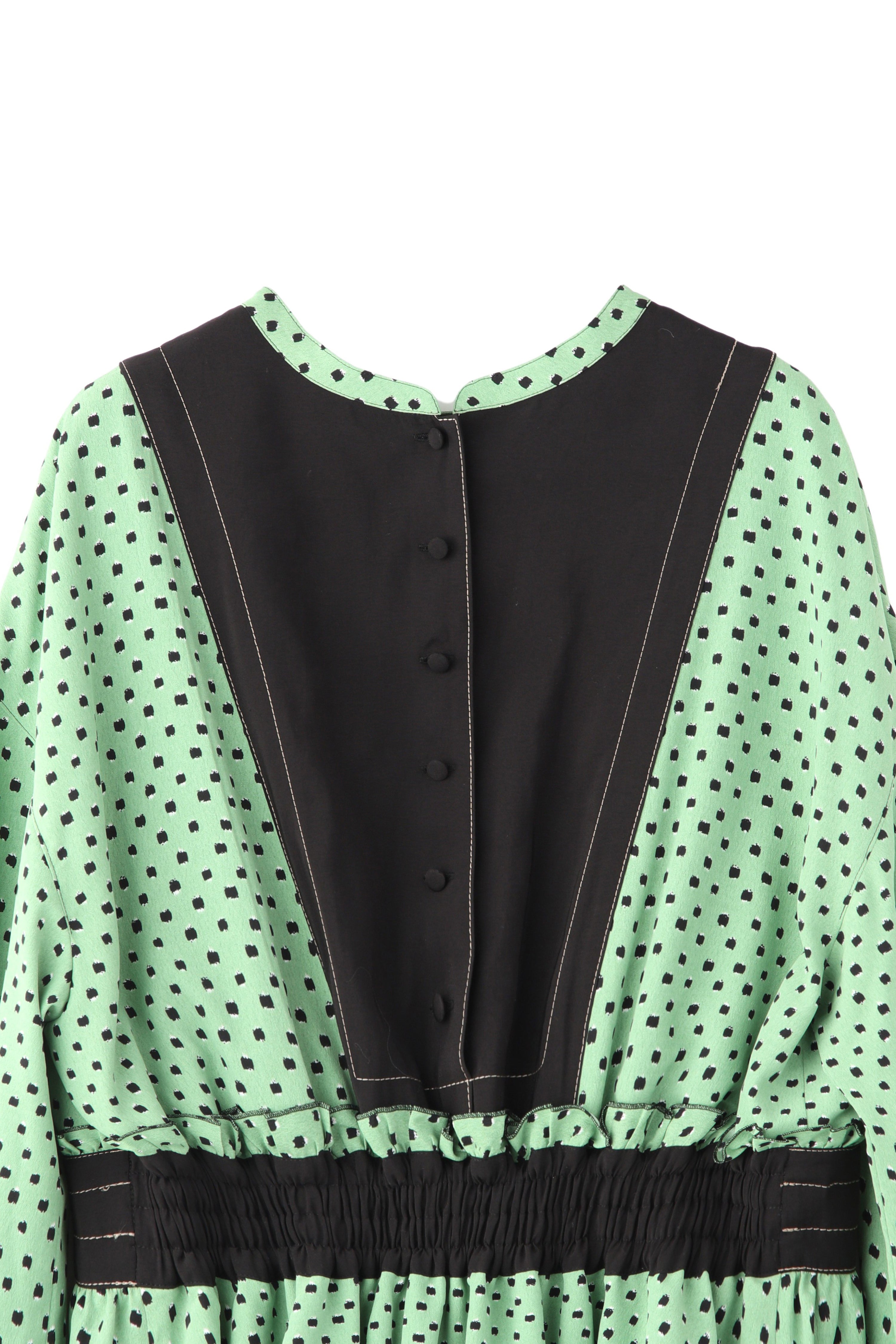 柄のワンピースも無地のパーツで切り替えて