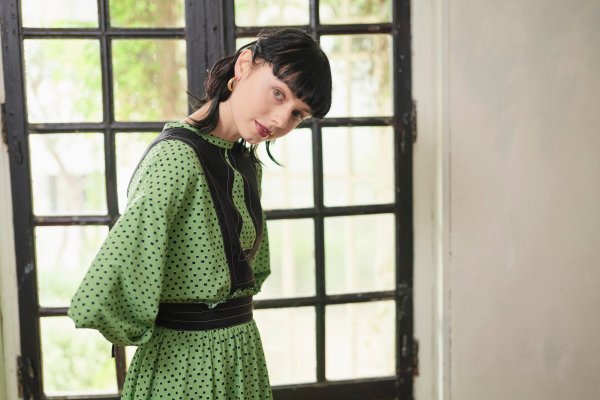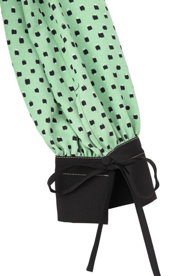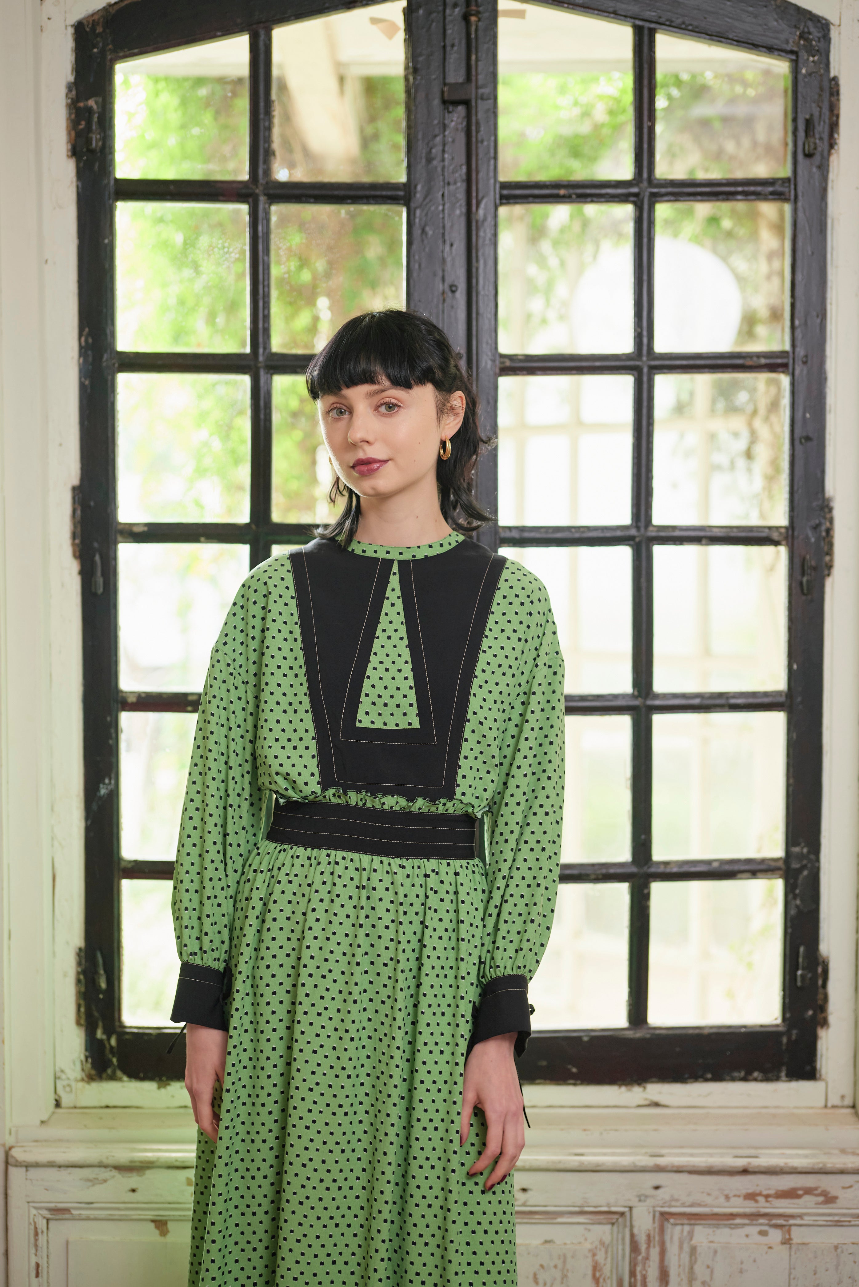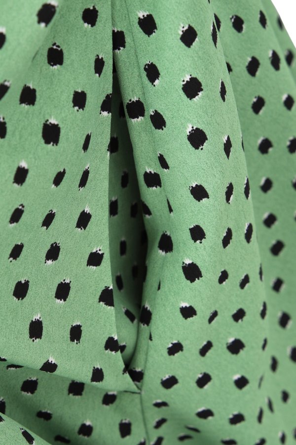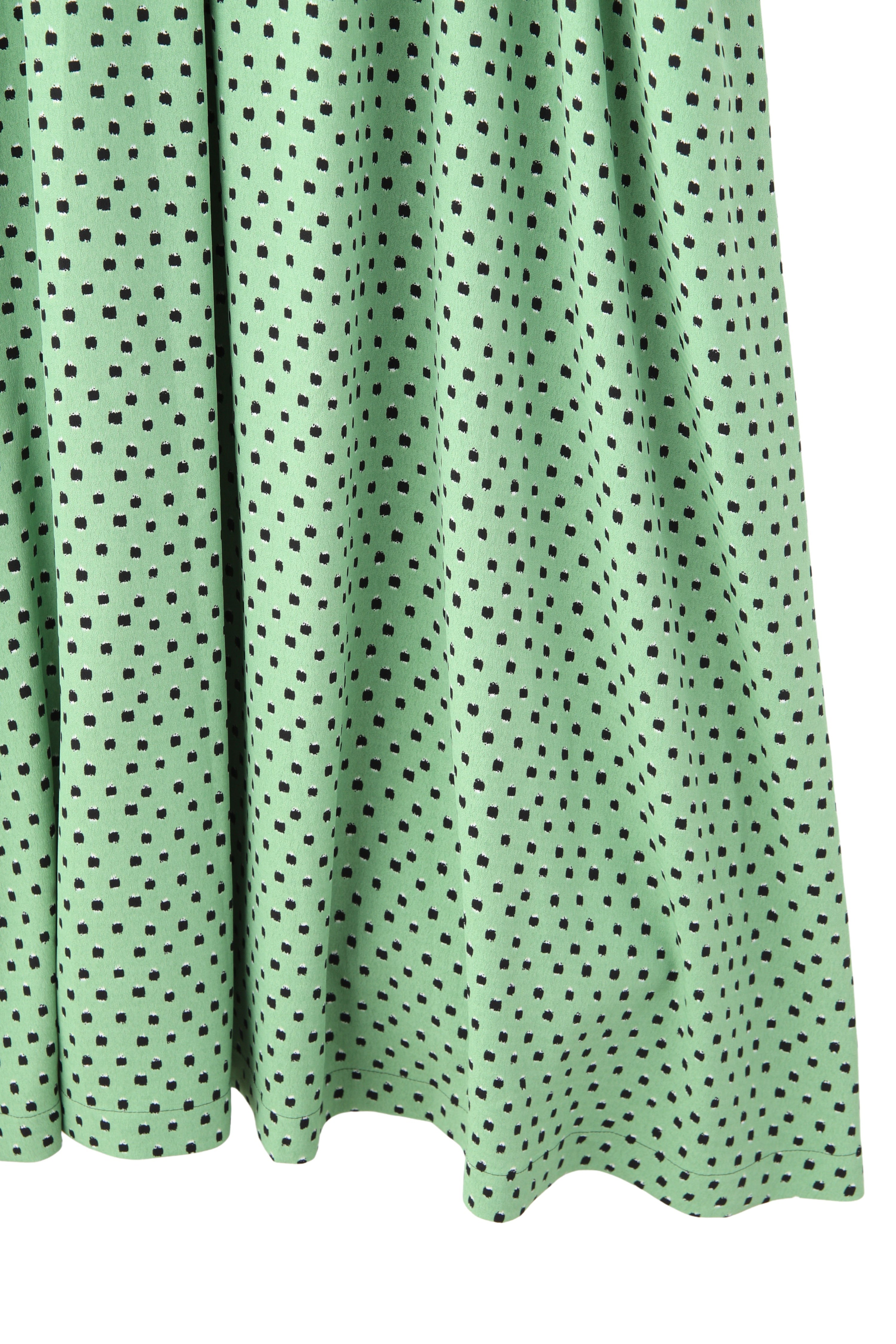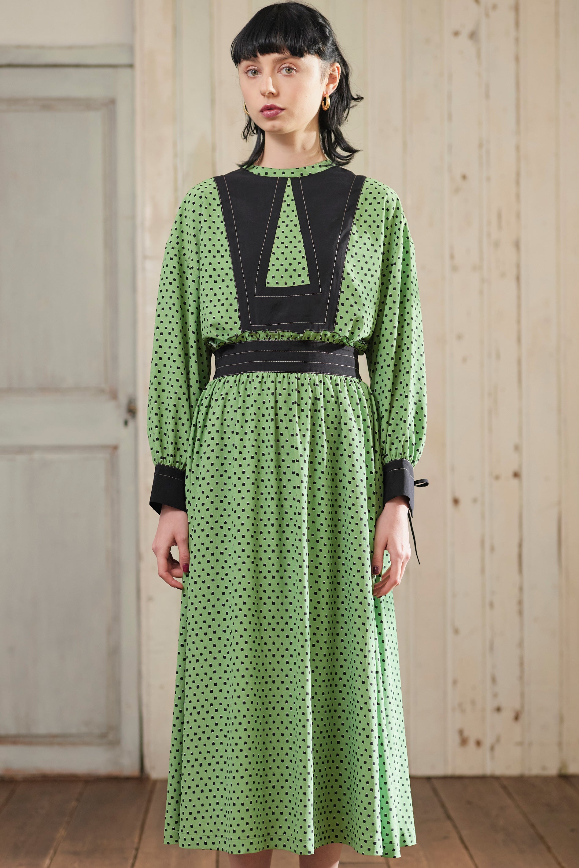 柄のワンピースも無地のパーツで切り替えて