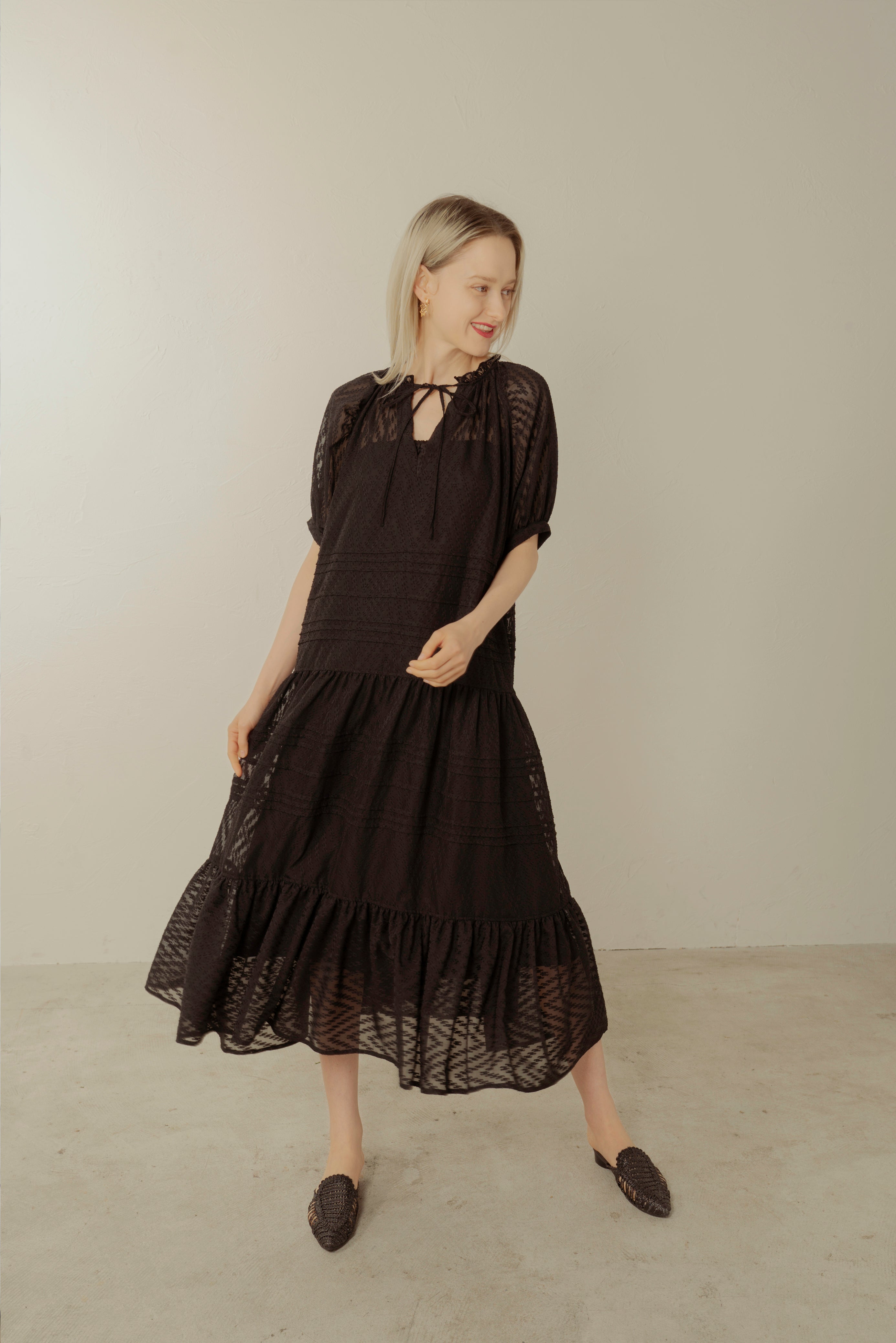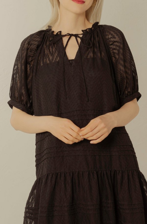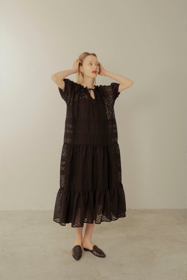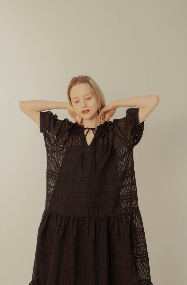ヘリンボーン模様の入ったシースルー生地のボリュームのあるワンピースとインナーのセットアイテム。