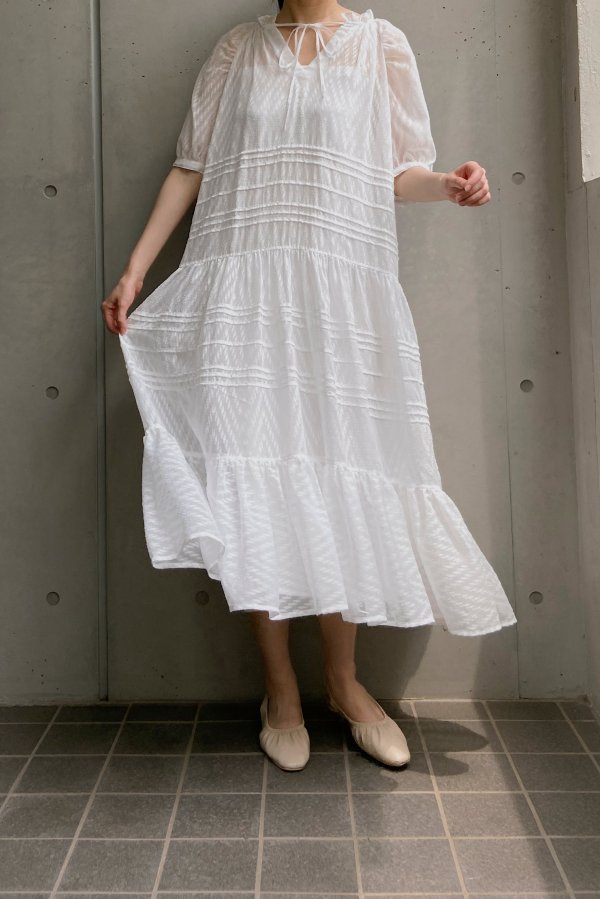 生地分量をたっぷりと使用したティアードスカートに繊細なタックを入れることでほどよい重みが生まれ、上品なシルエットに仕上げました。