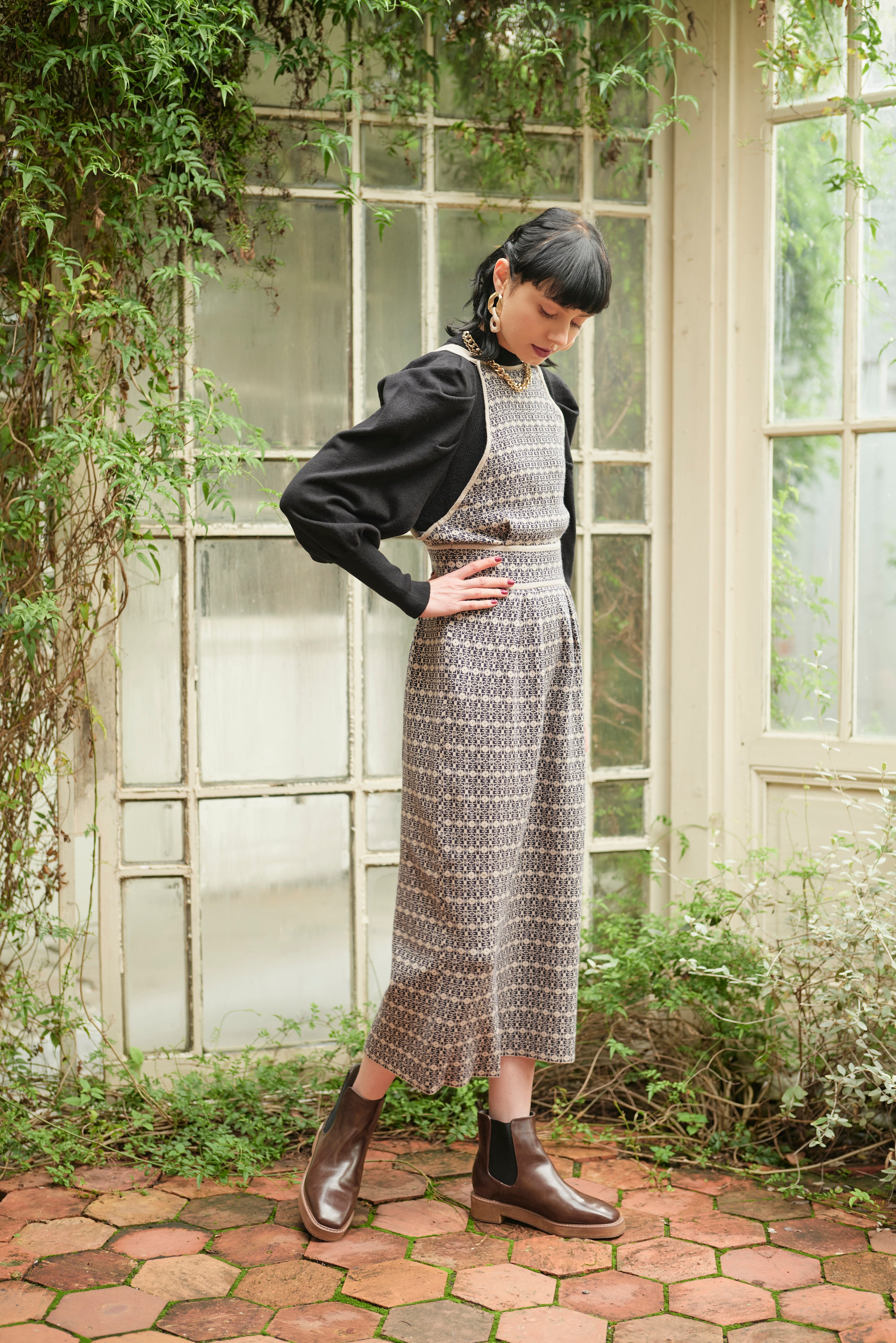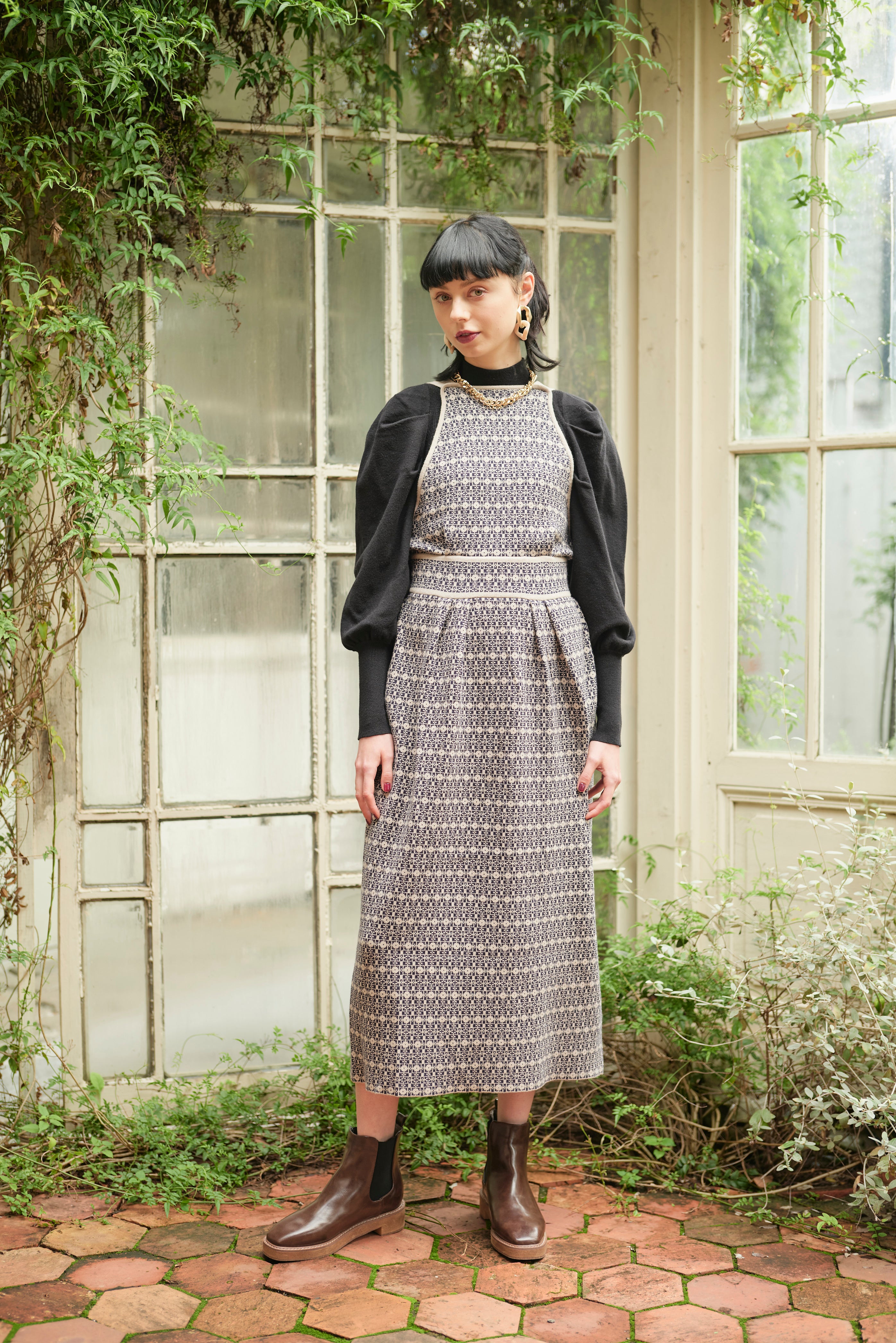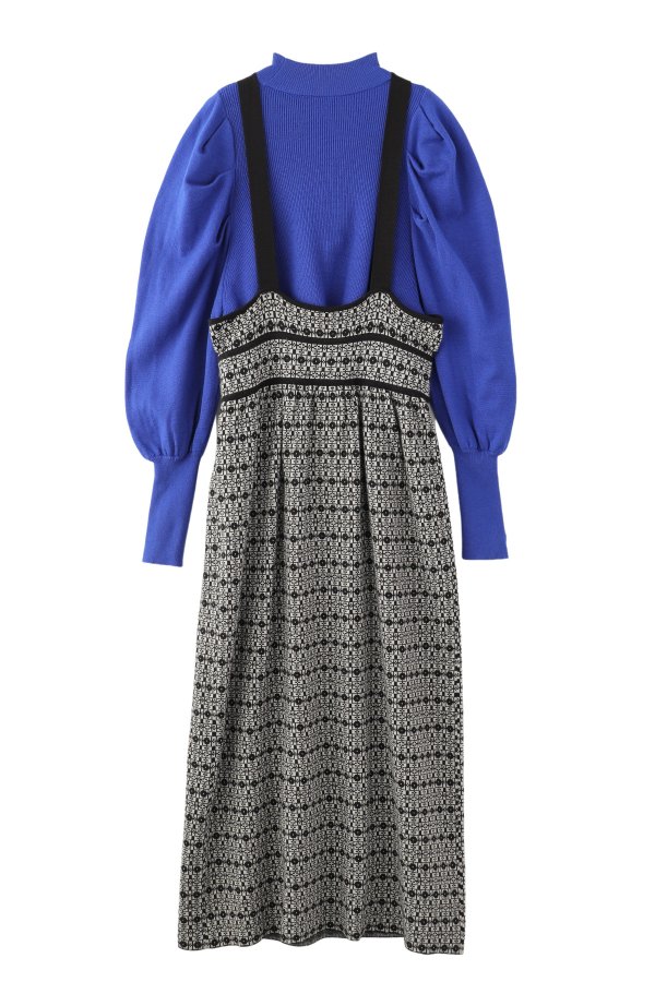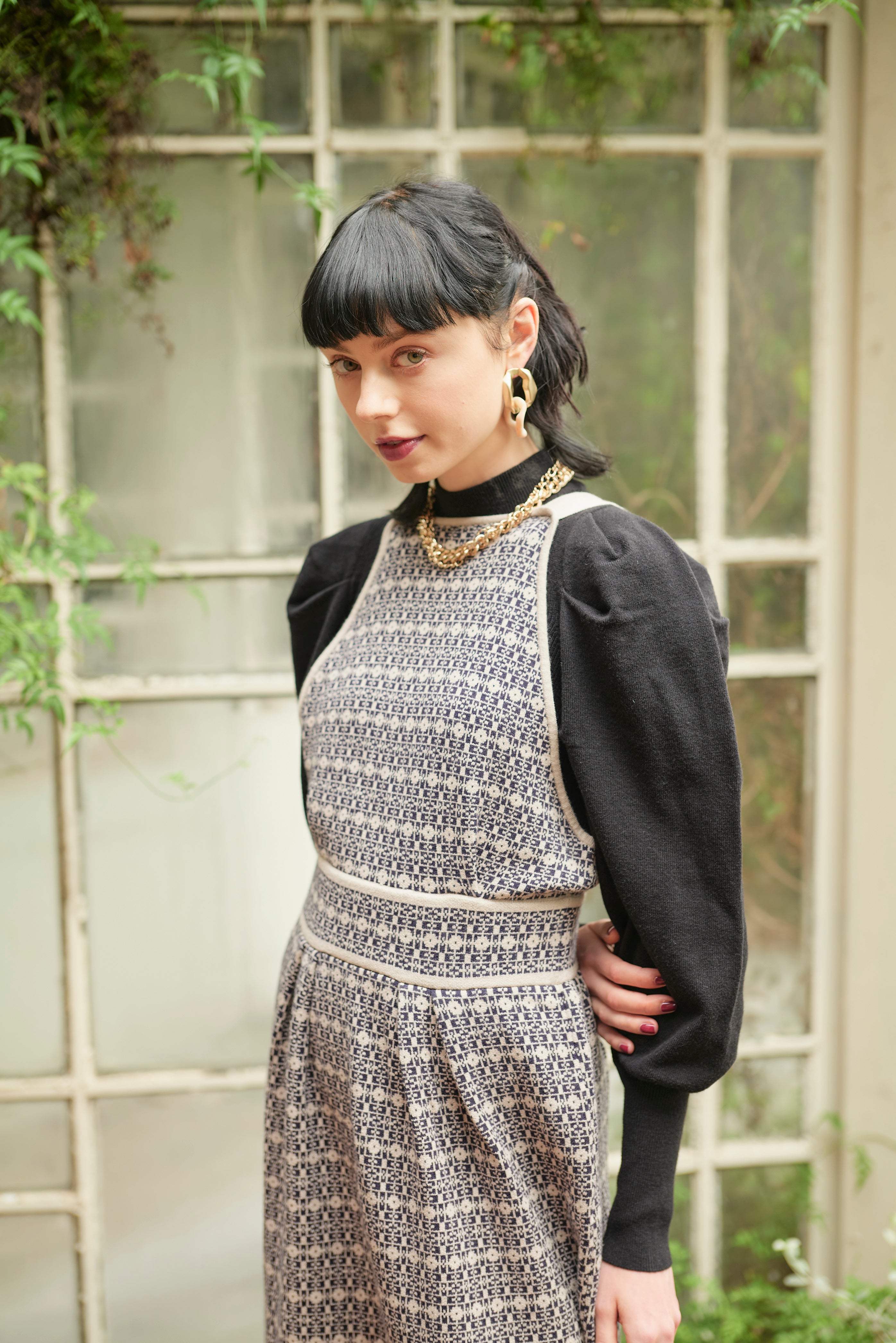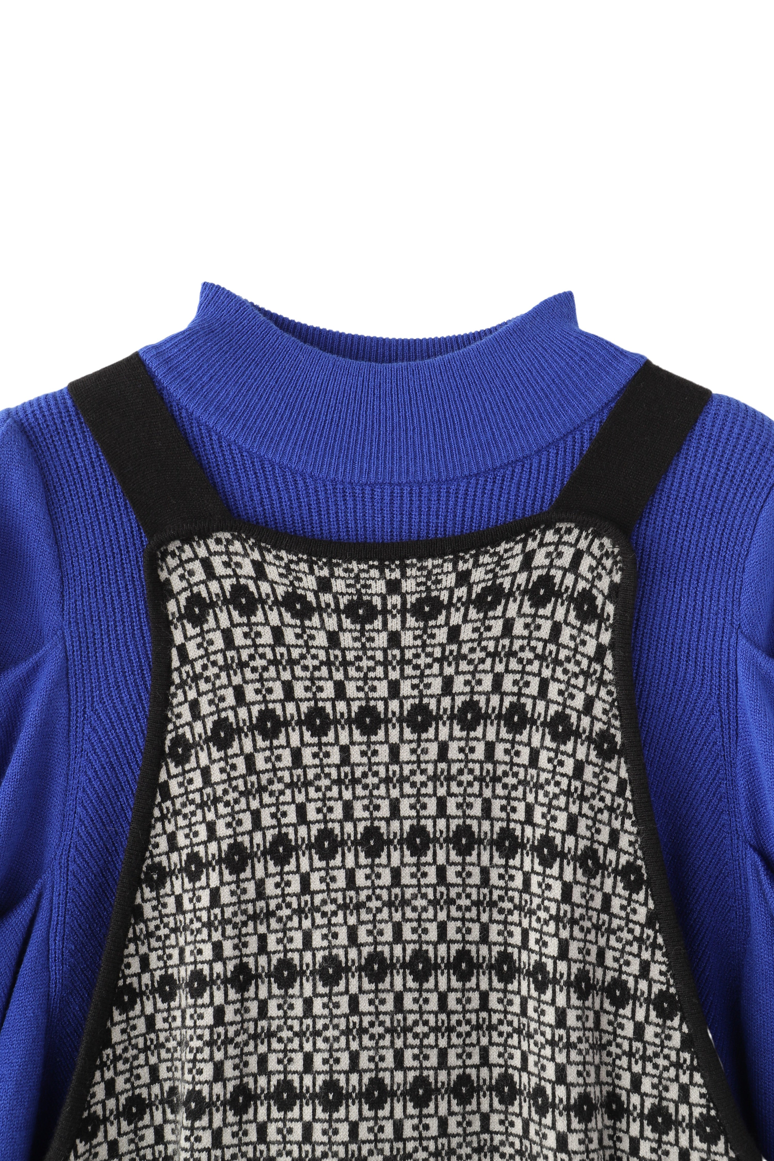 格子総柄のニットジャンパースカートと