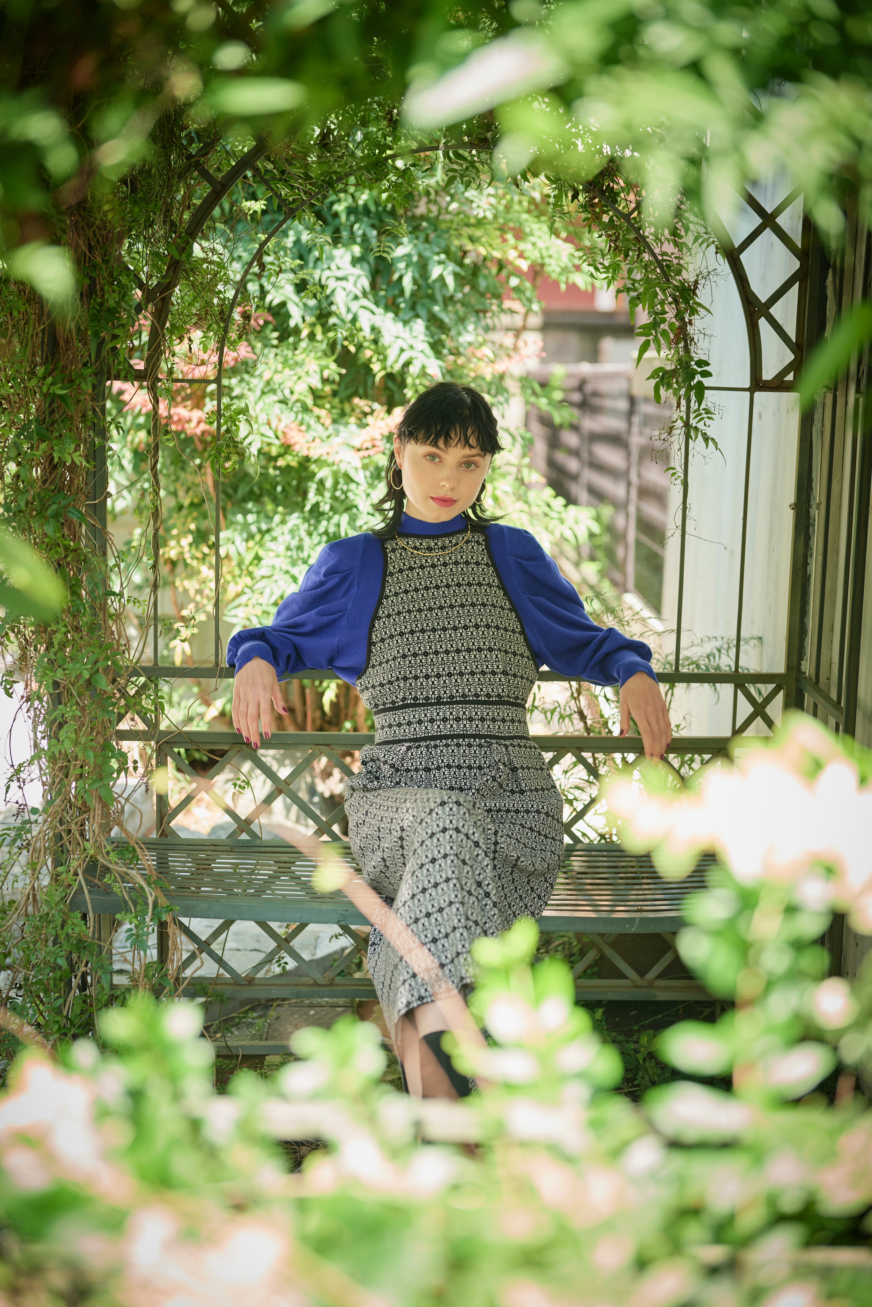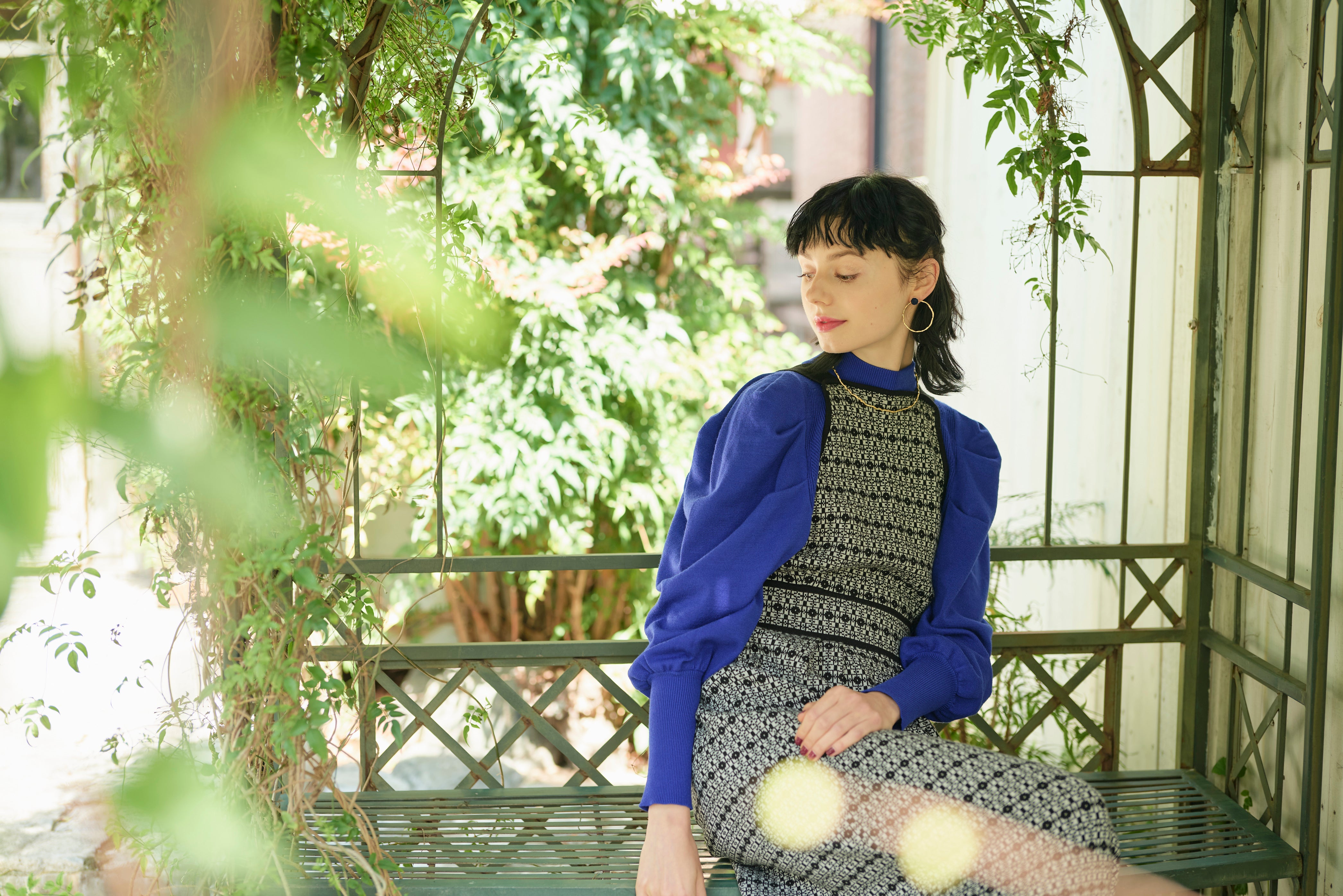 BLACKはビビットなBLUEのインナーを合わせモードっぽさ漂う印象に。