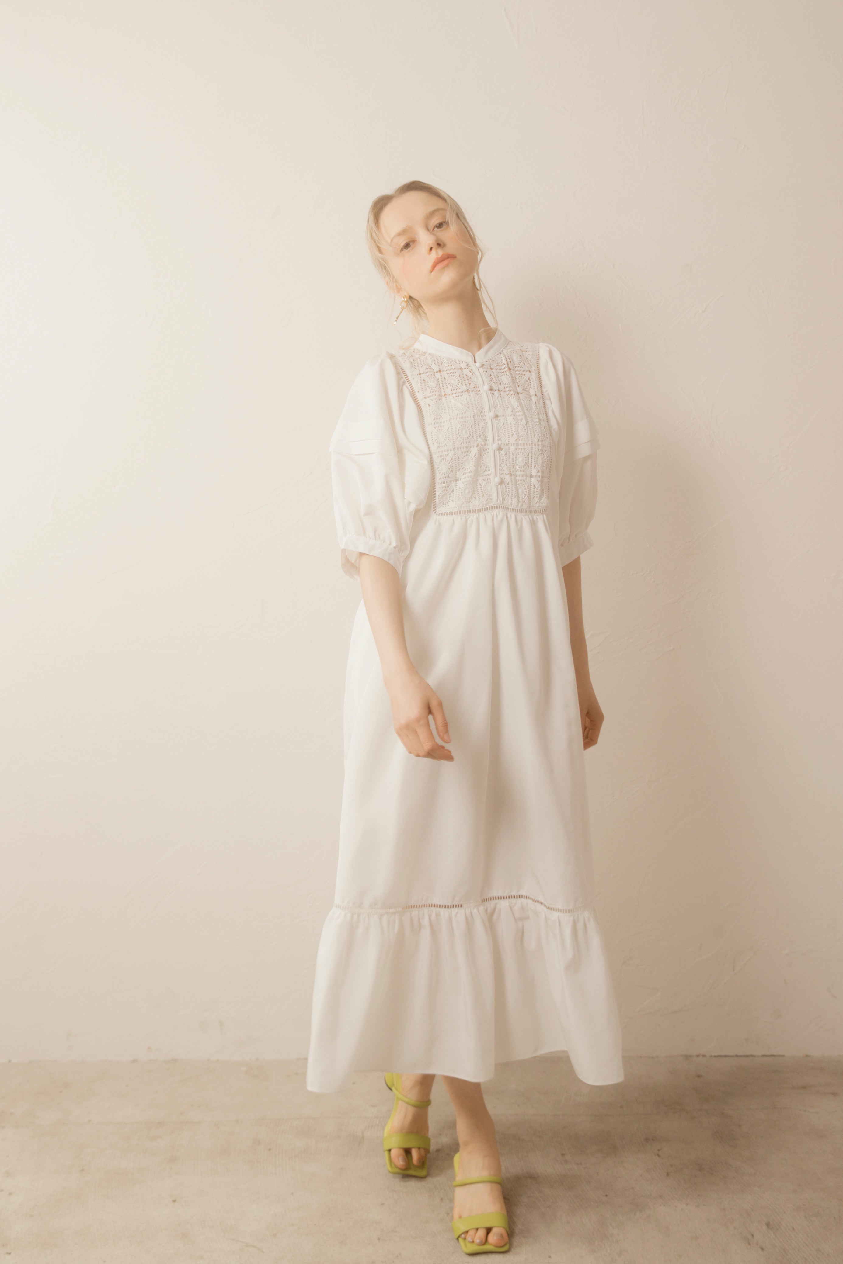 ステンドグラスのような透け感が今季らしい格子のレースがポイントのロングドレス。