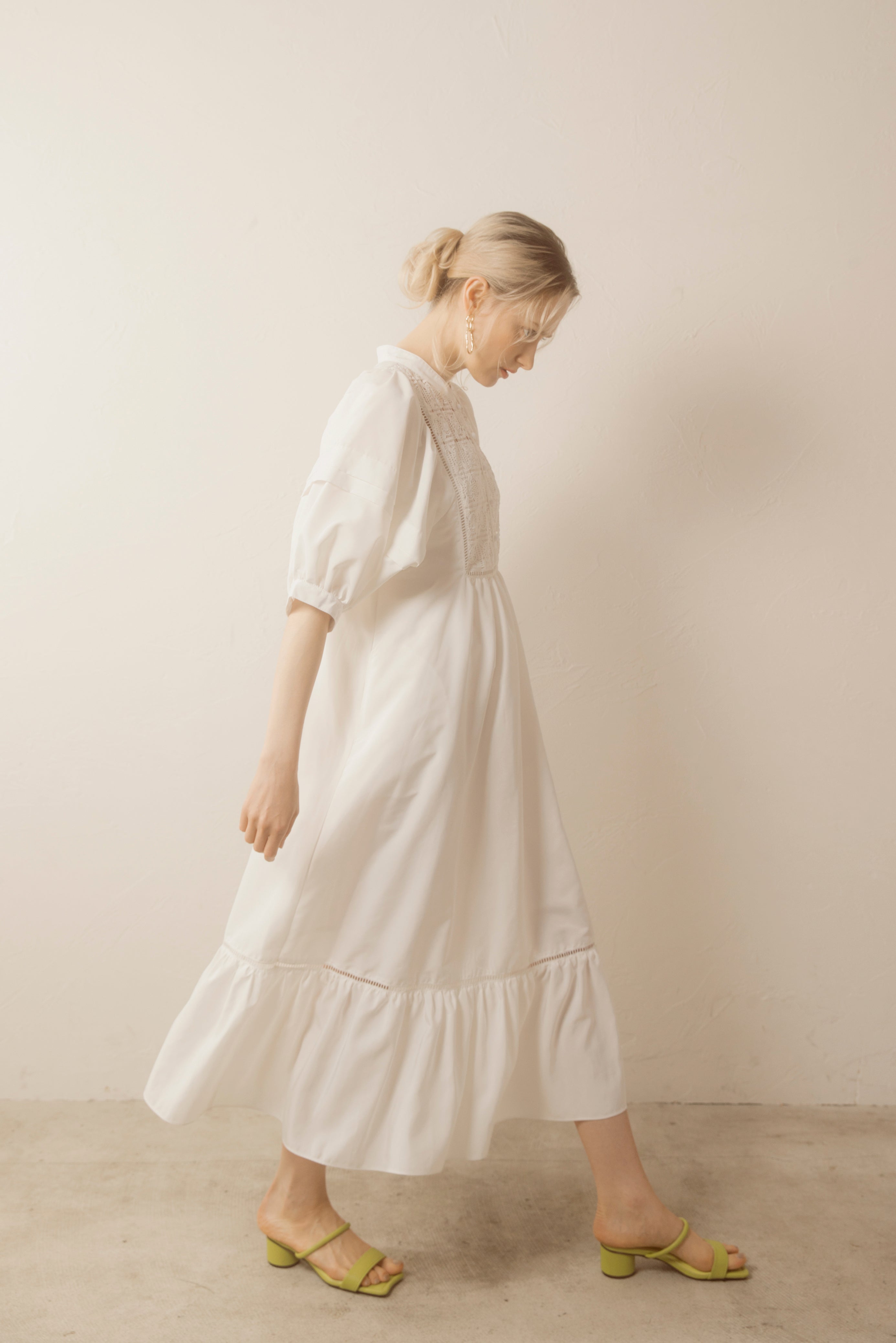 デコルテとティアード切り替え部分のはしごレースの透け感がさりげない肌見せがを演出してくれます。