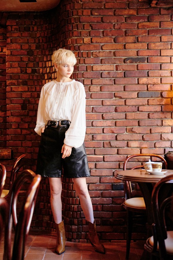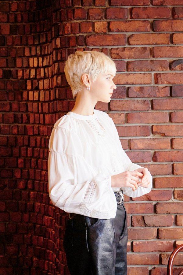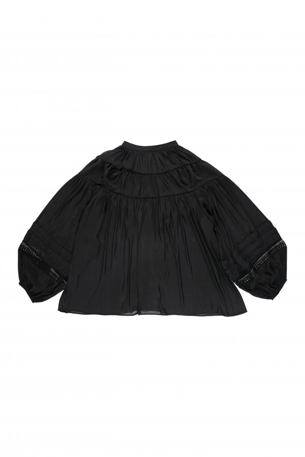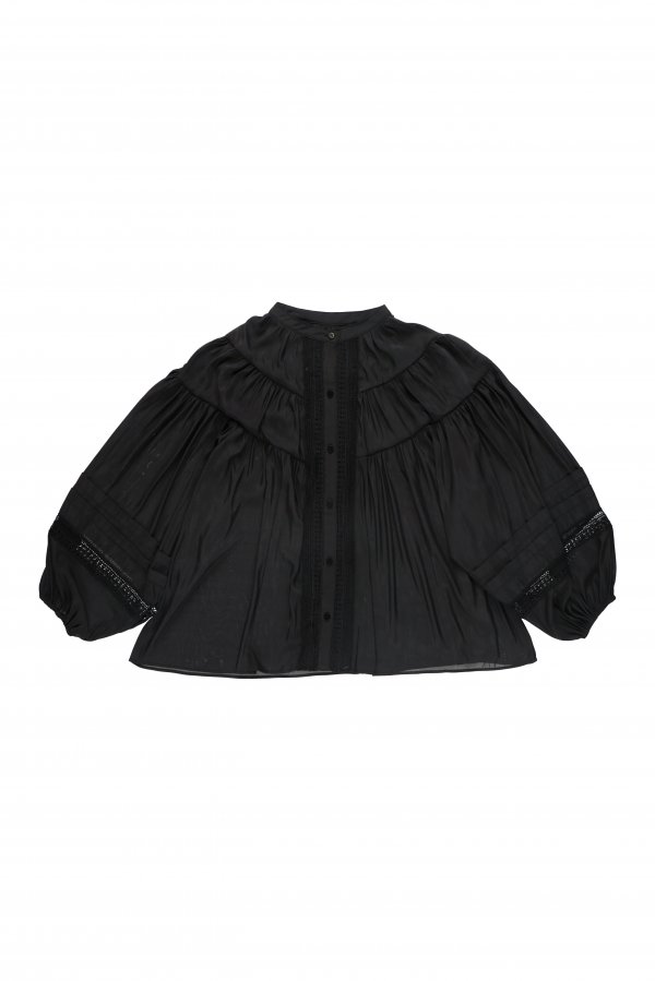 レースとシャーリングで女性らしいシルエットのブラウスに仕上げました。