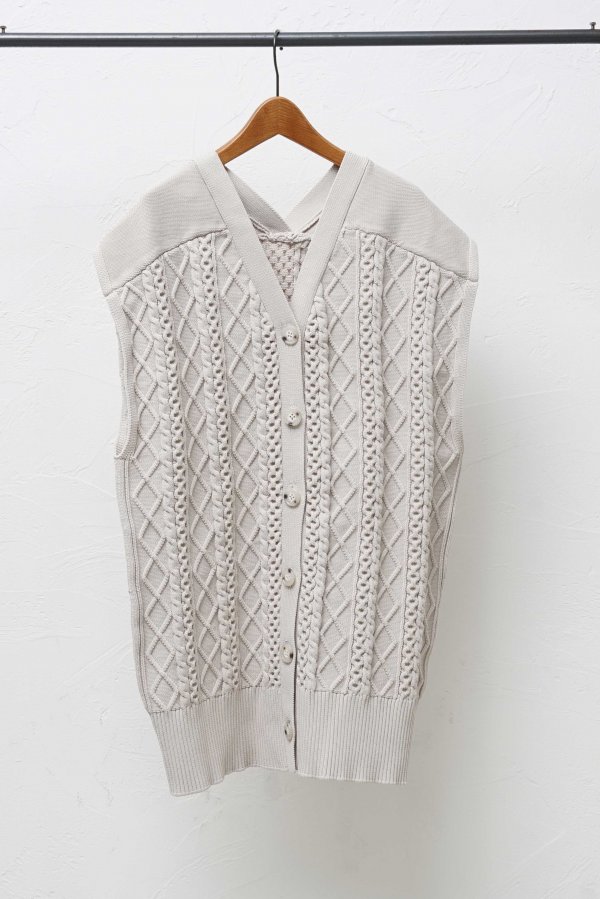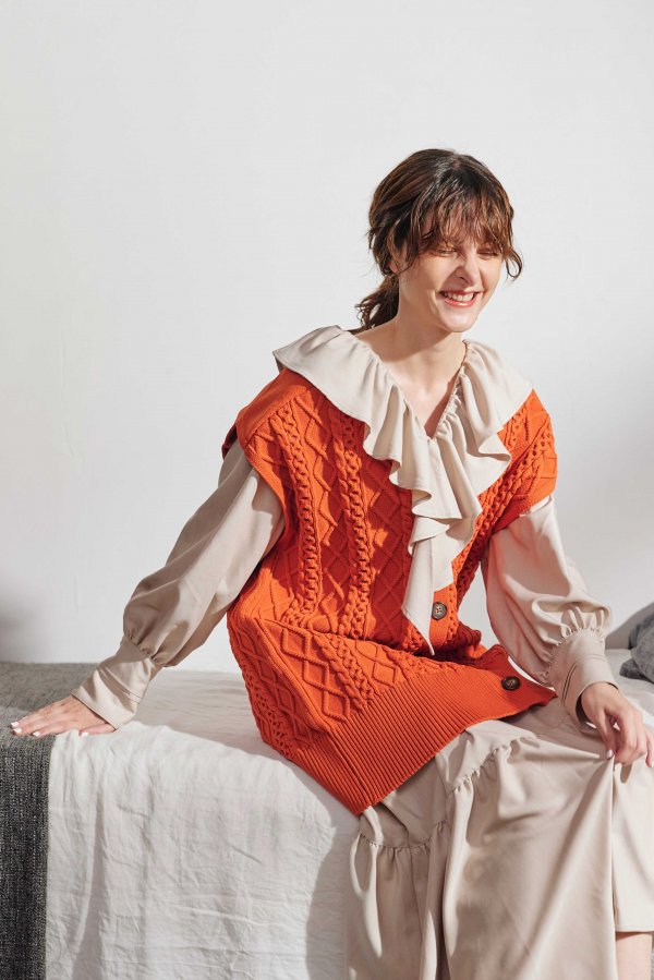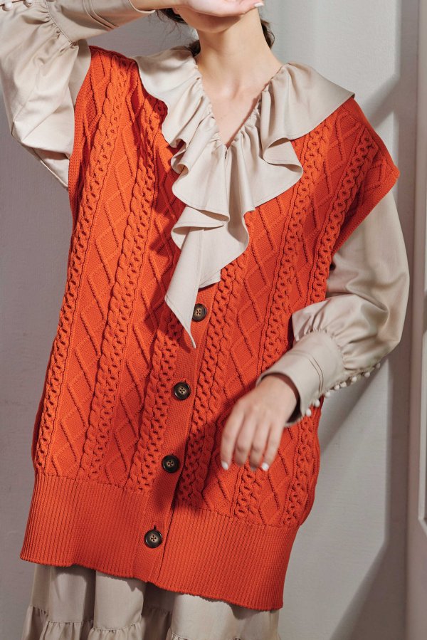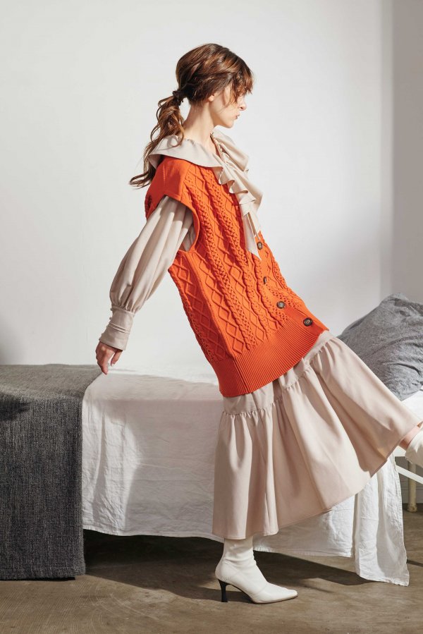 編み地を立体的に見せてくれる質感の糸を使用し、ほっこりしがちなケーブル編みのベストも綺麗めなワンピースなどにも合わせやすいバランスに仕上げました。