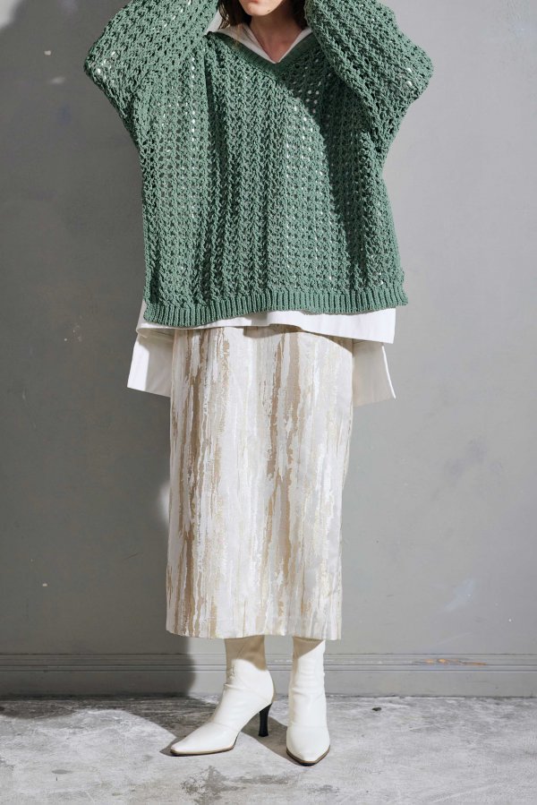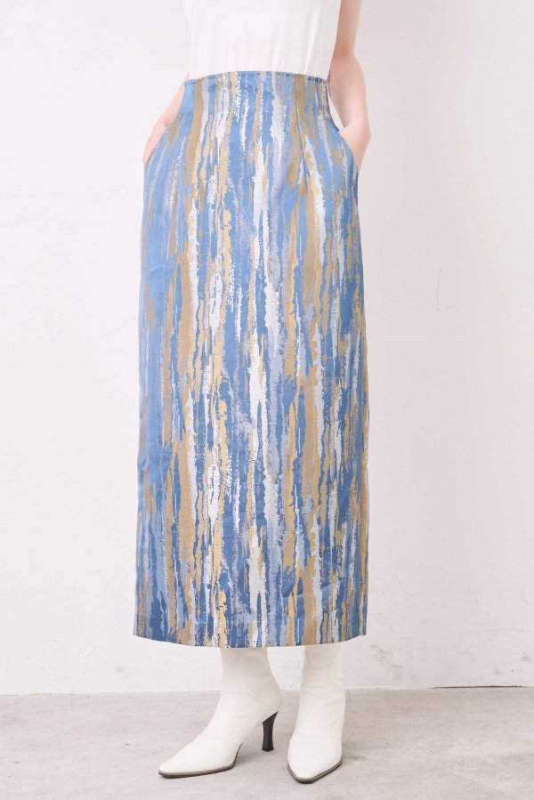抽象画のようなニュアンス感のジャカードスカートはデザイナー今季イチ押しアイテム。