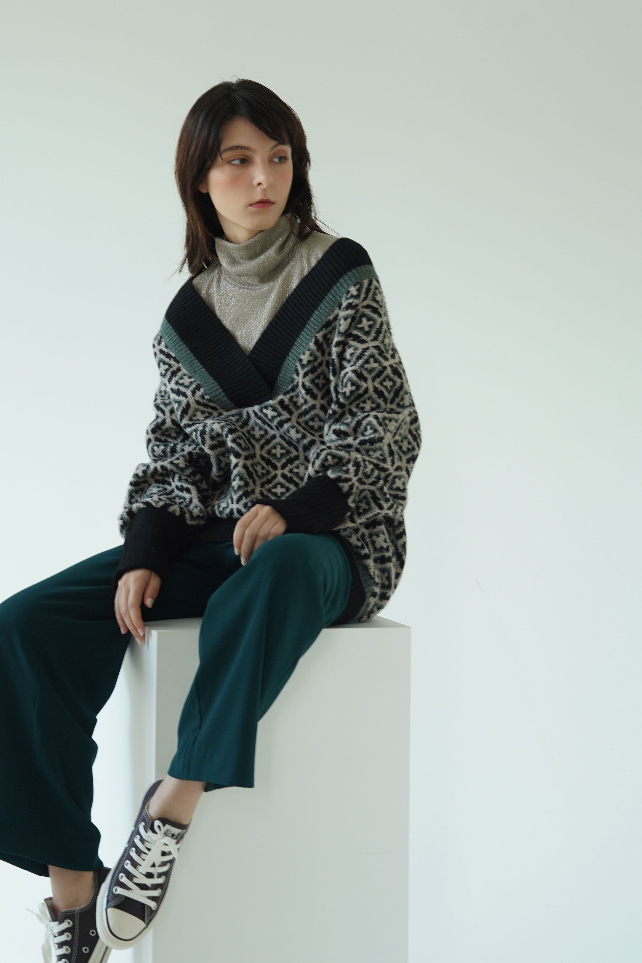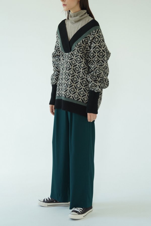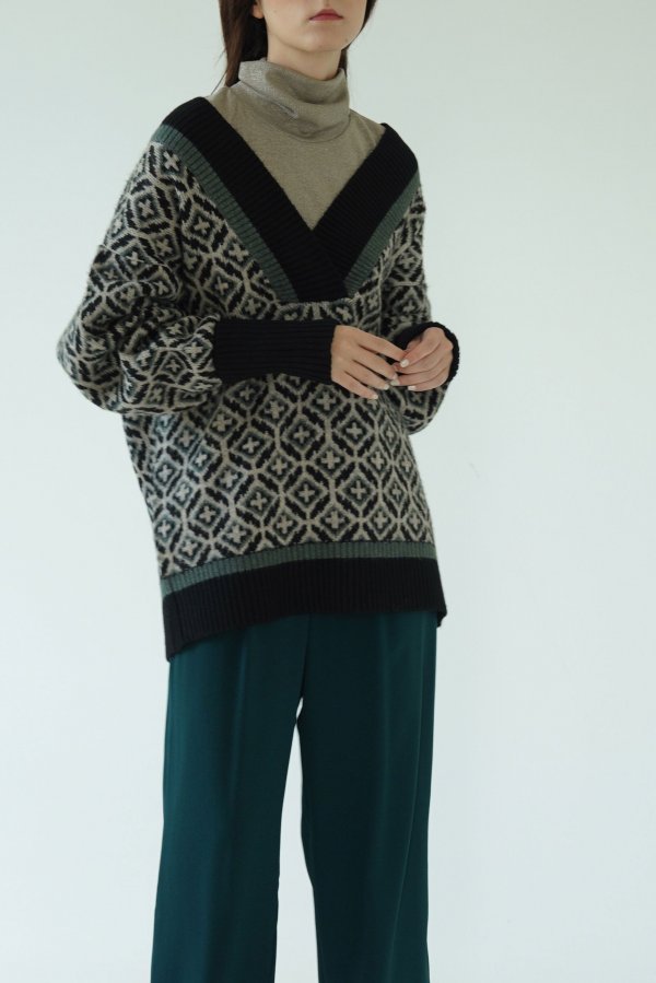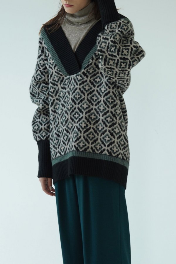 ジオメトリック柄に配色になったリブがユニークなニットセーター。