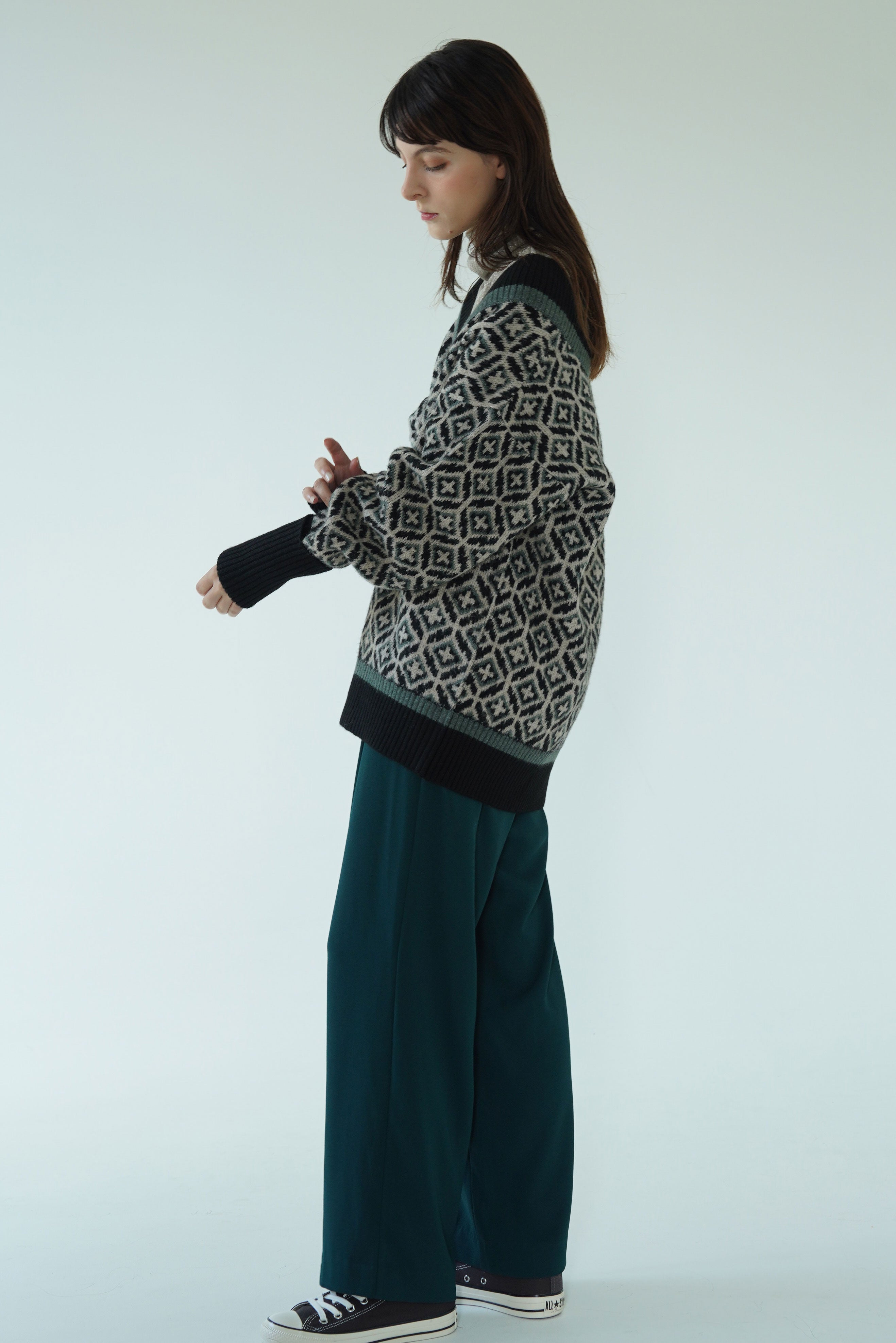 インナーにはタートルネックを合わせたり、ネックの詰まったカットソーを合わせても◎
