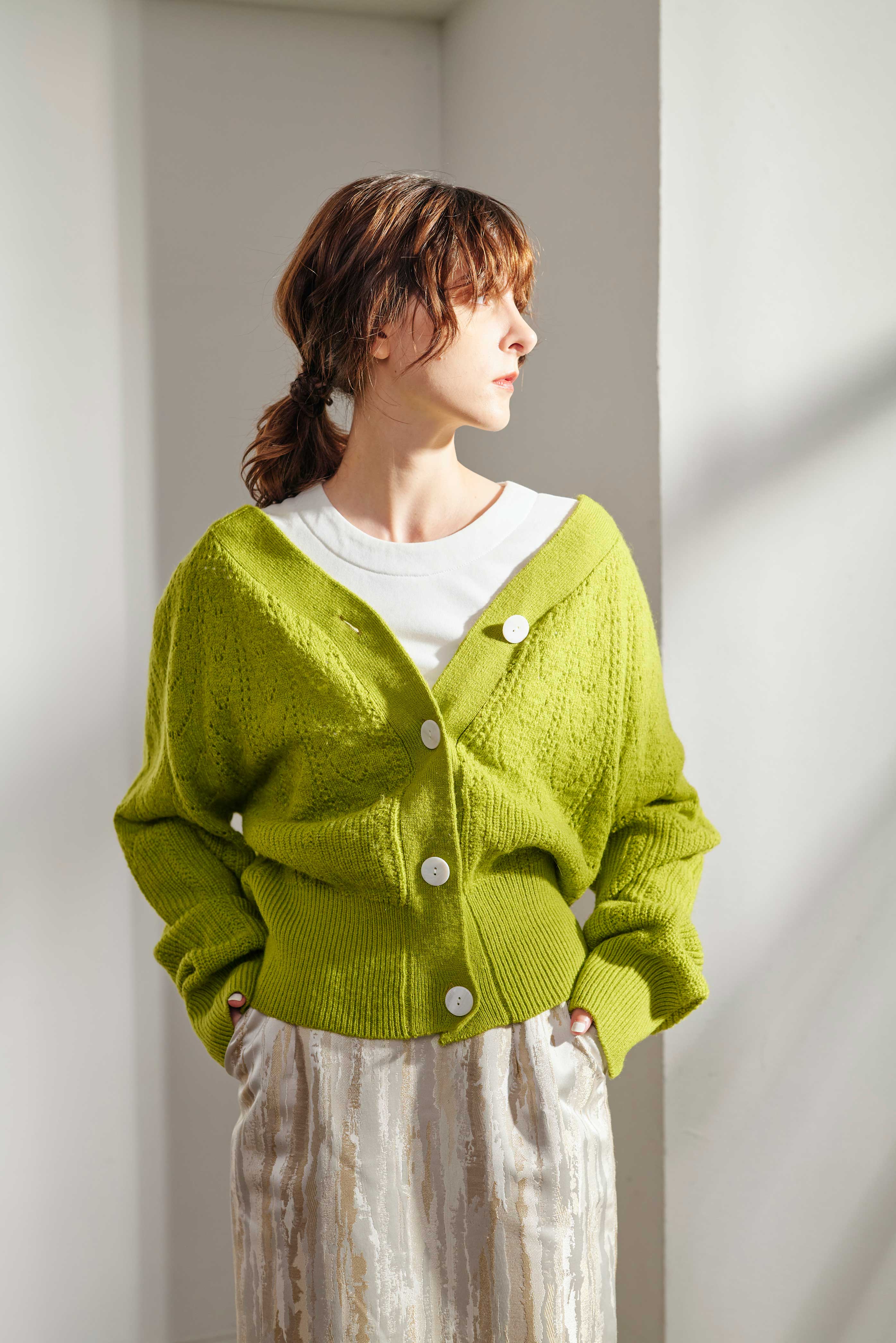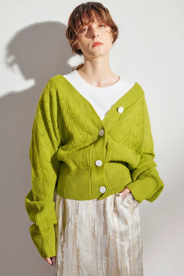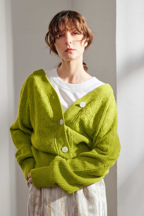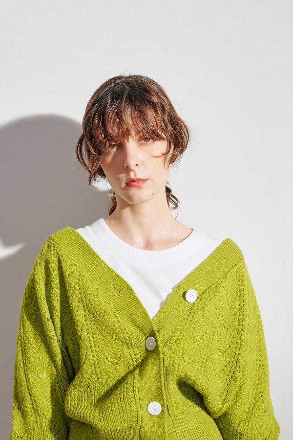 カーディガンとしてもトップスとしても前後どちらも着られる仕様で、首元はTシャツとの重ね着したときにも抜け感がでて、ネックレスが映えるような絶妙なネックラインに仕上げました。