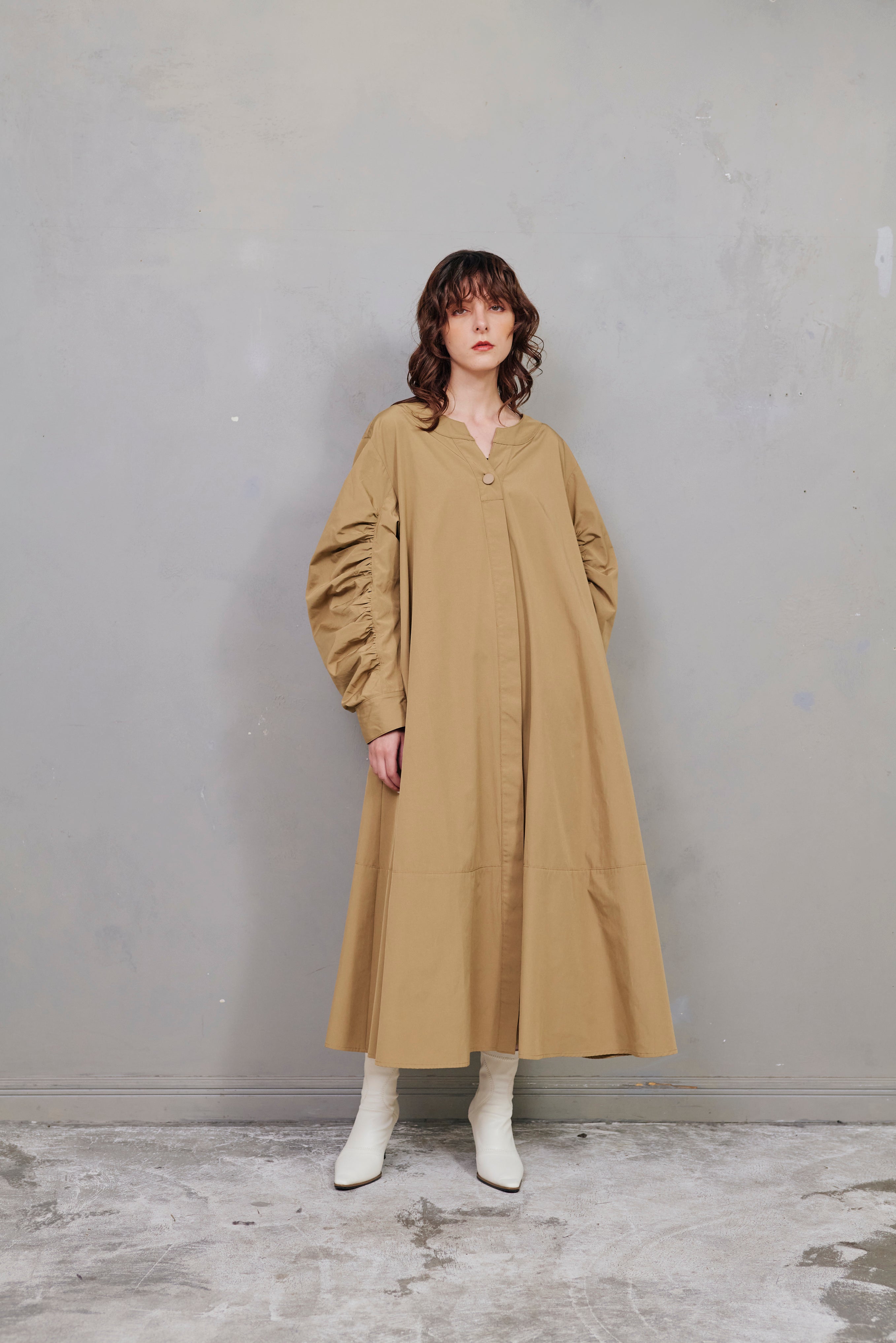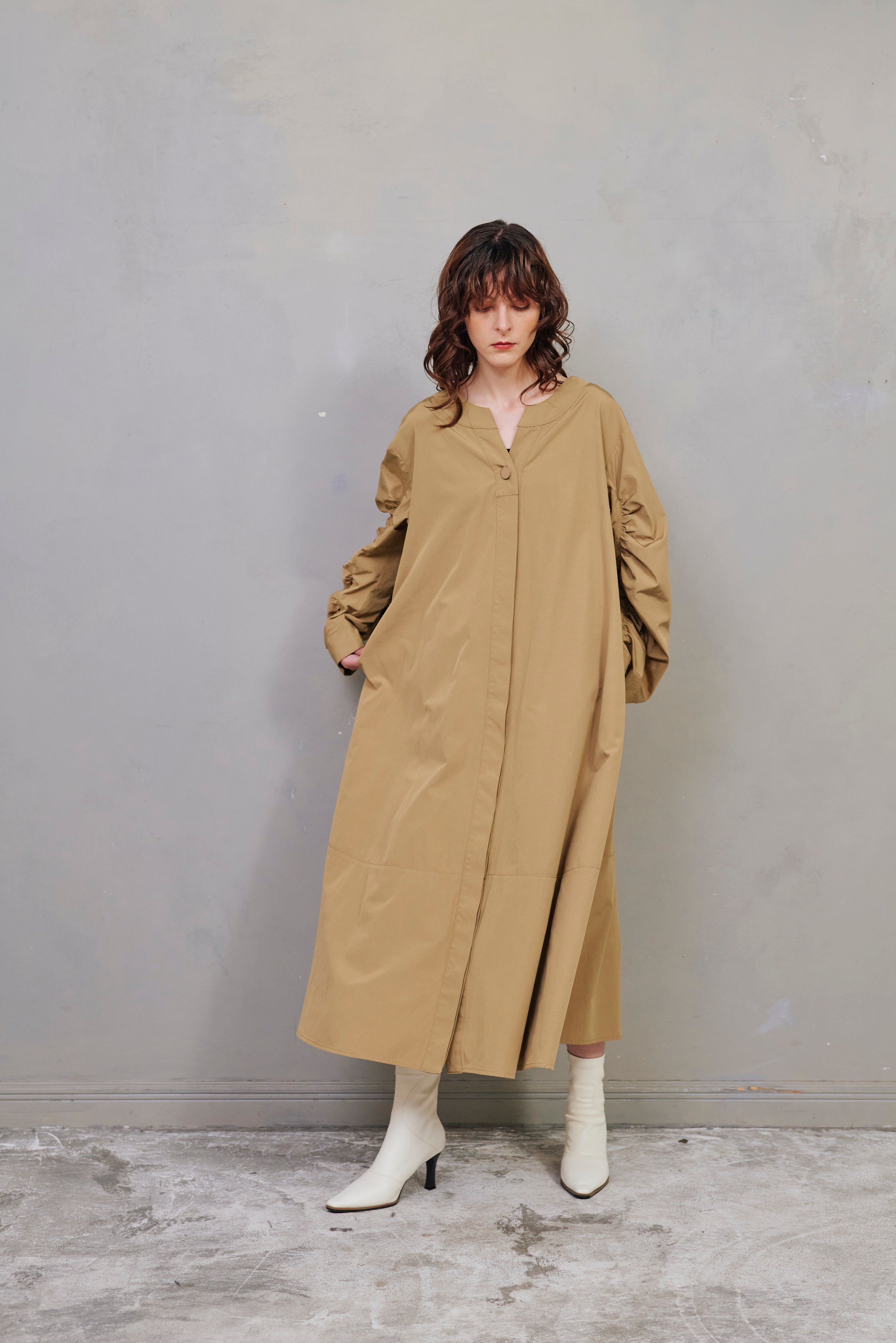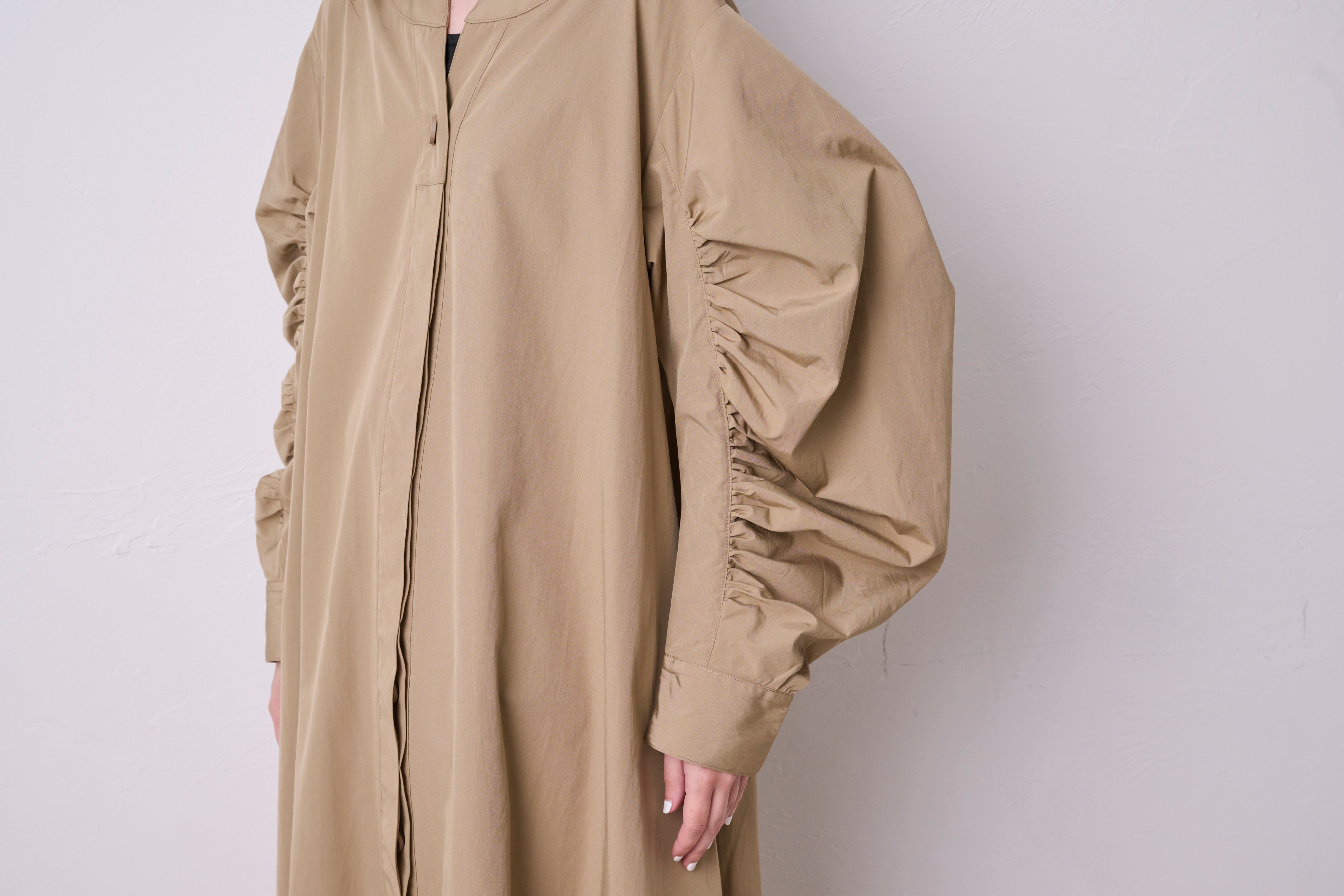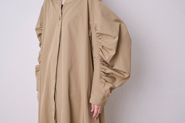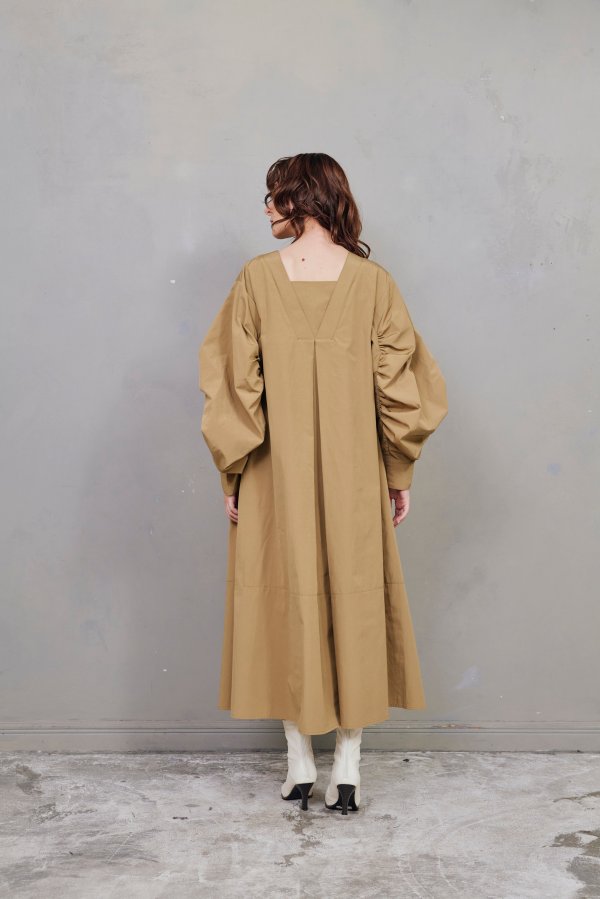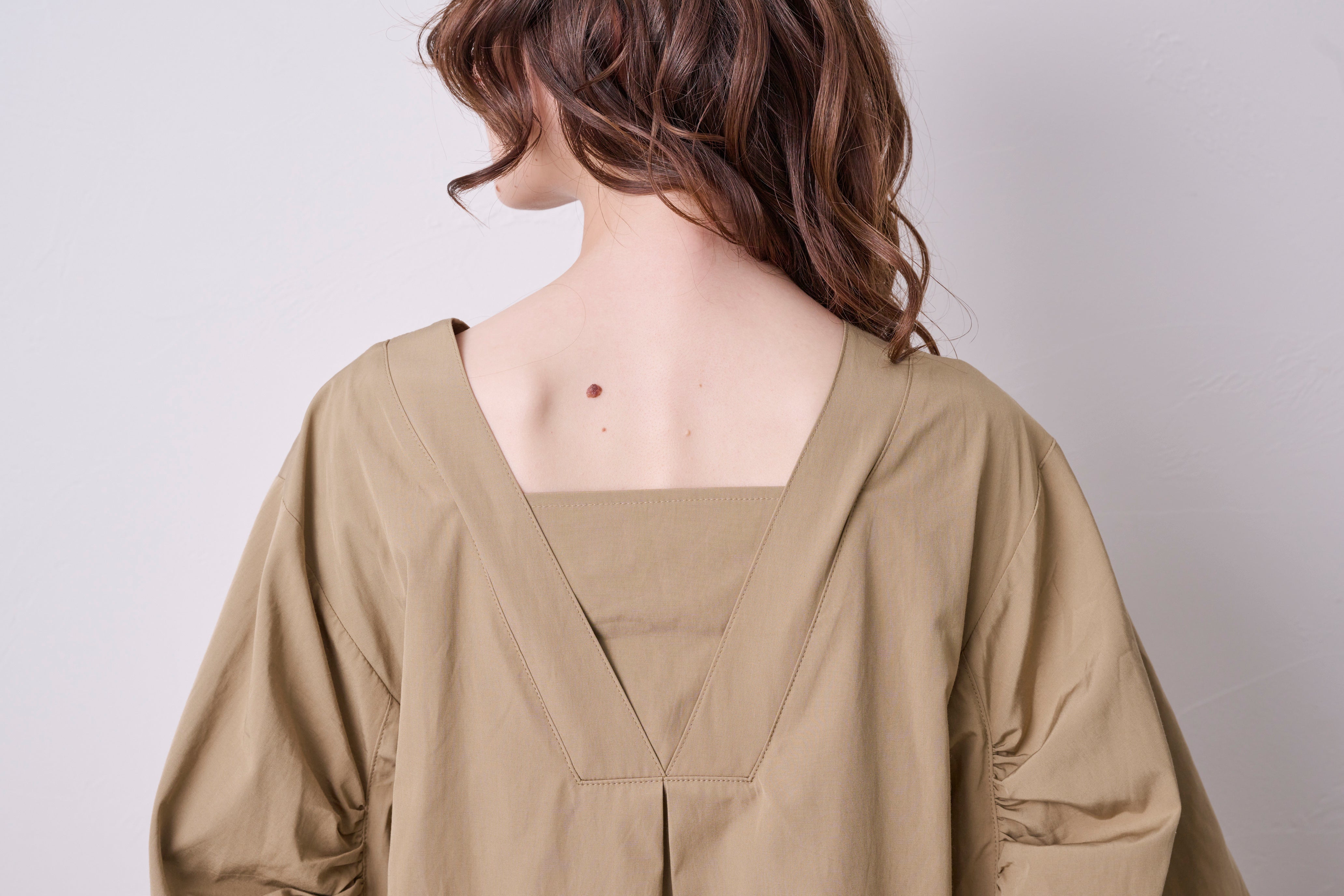 タックとギャザーで立体感を出した袖のバナナスリーブがデザインポイント。