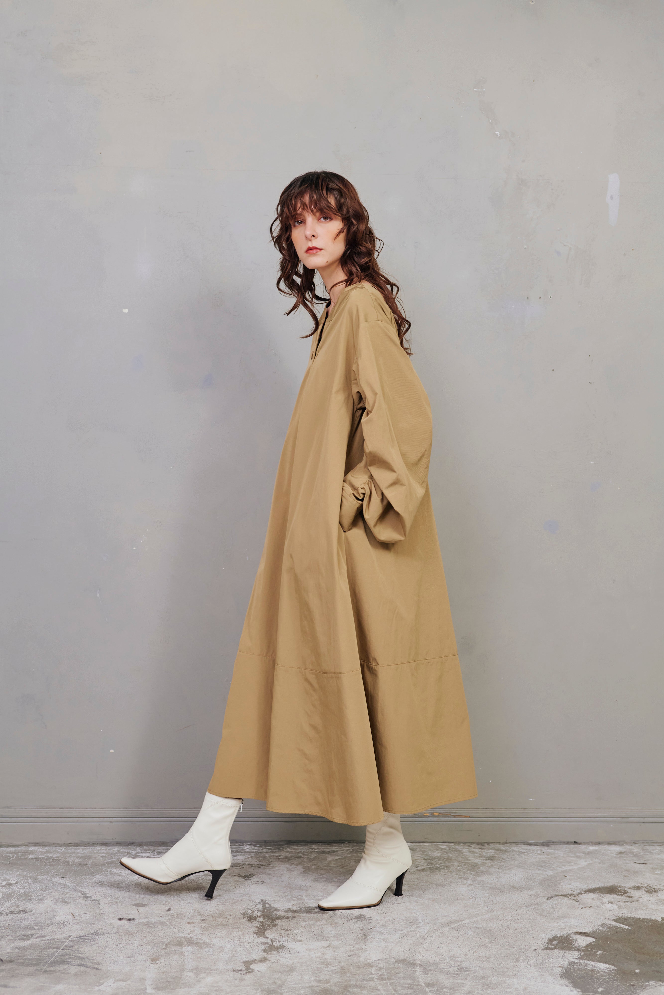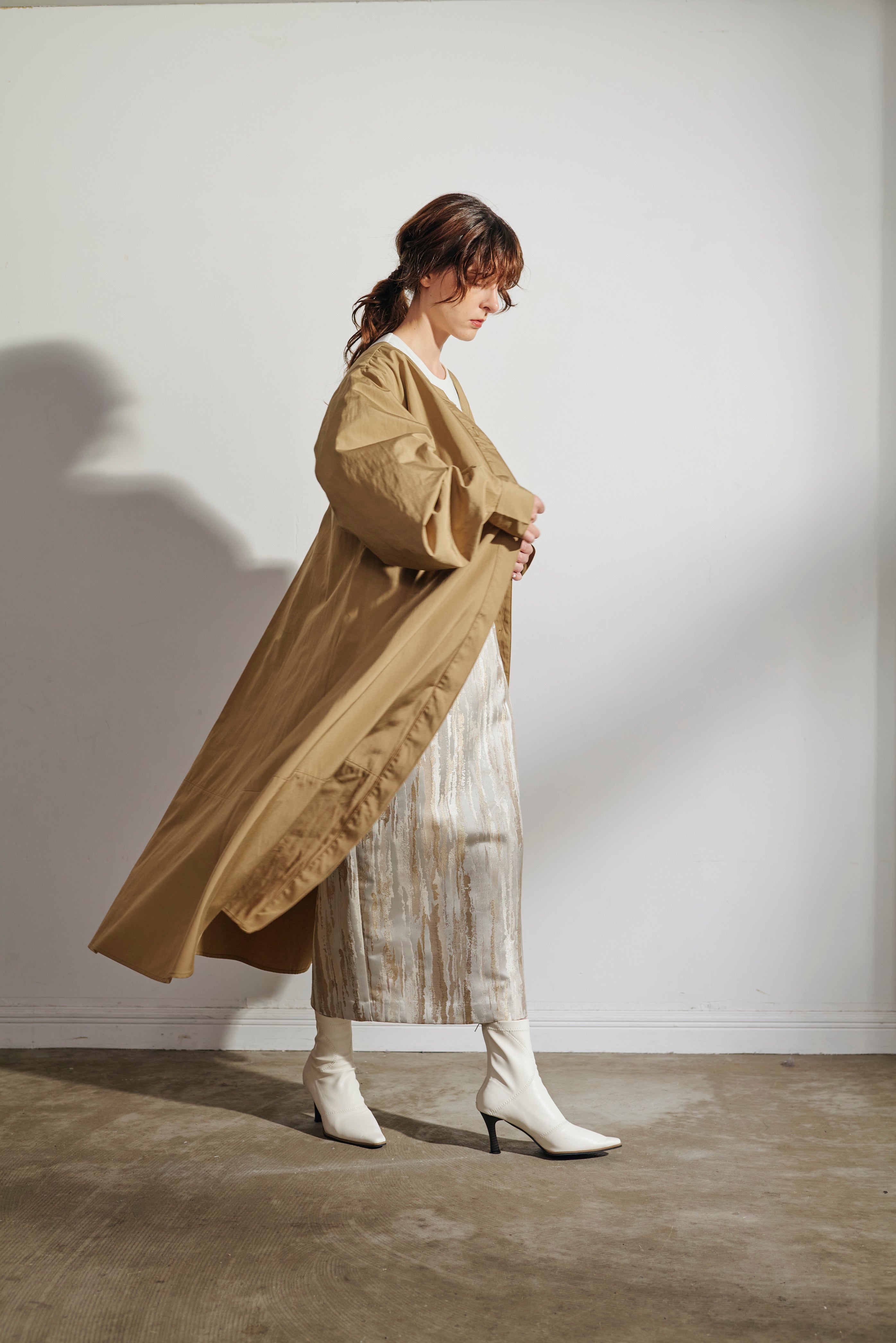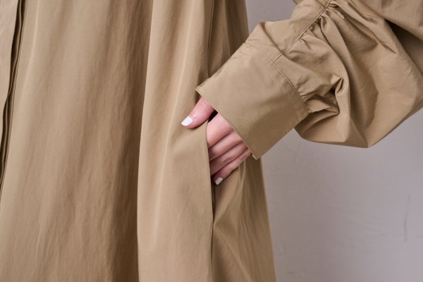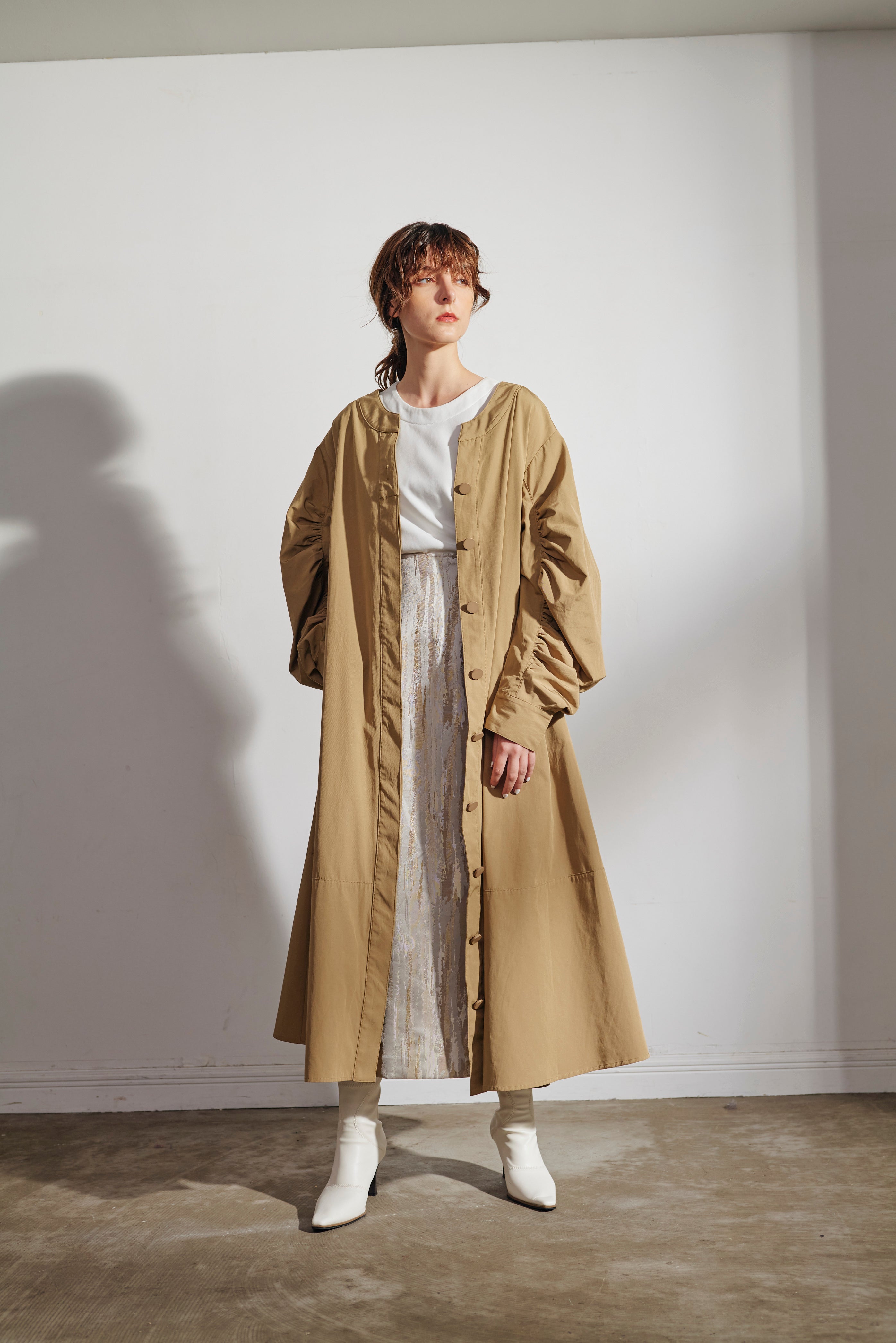 ハリのあるしっかりとした生地で仕立てているので、バックスタイルのぴしっと入ったセンタータックとヘムラインの立体感により羽織りとしても感度の高いスタイリングが完成します。