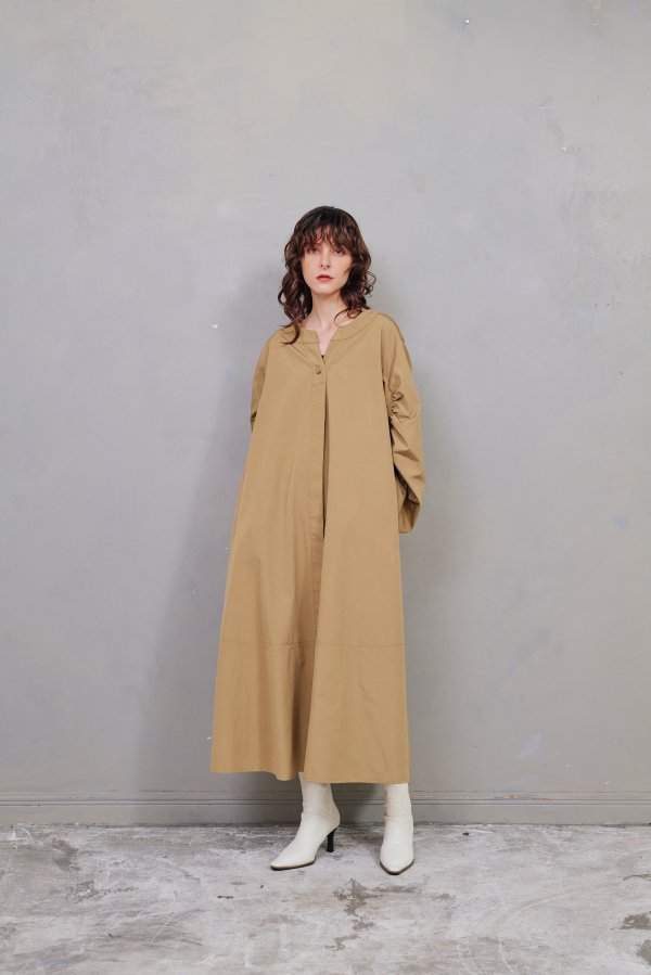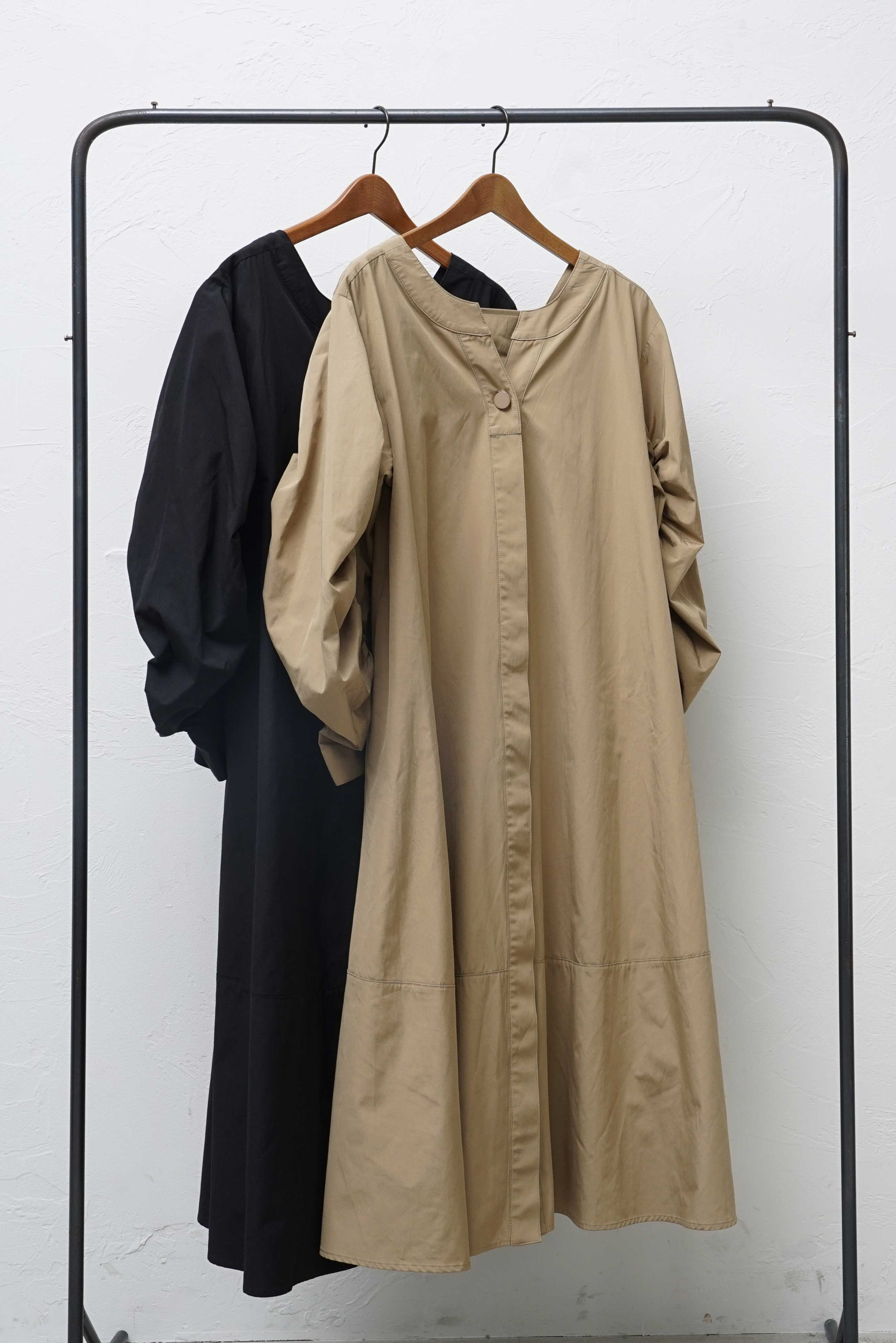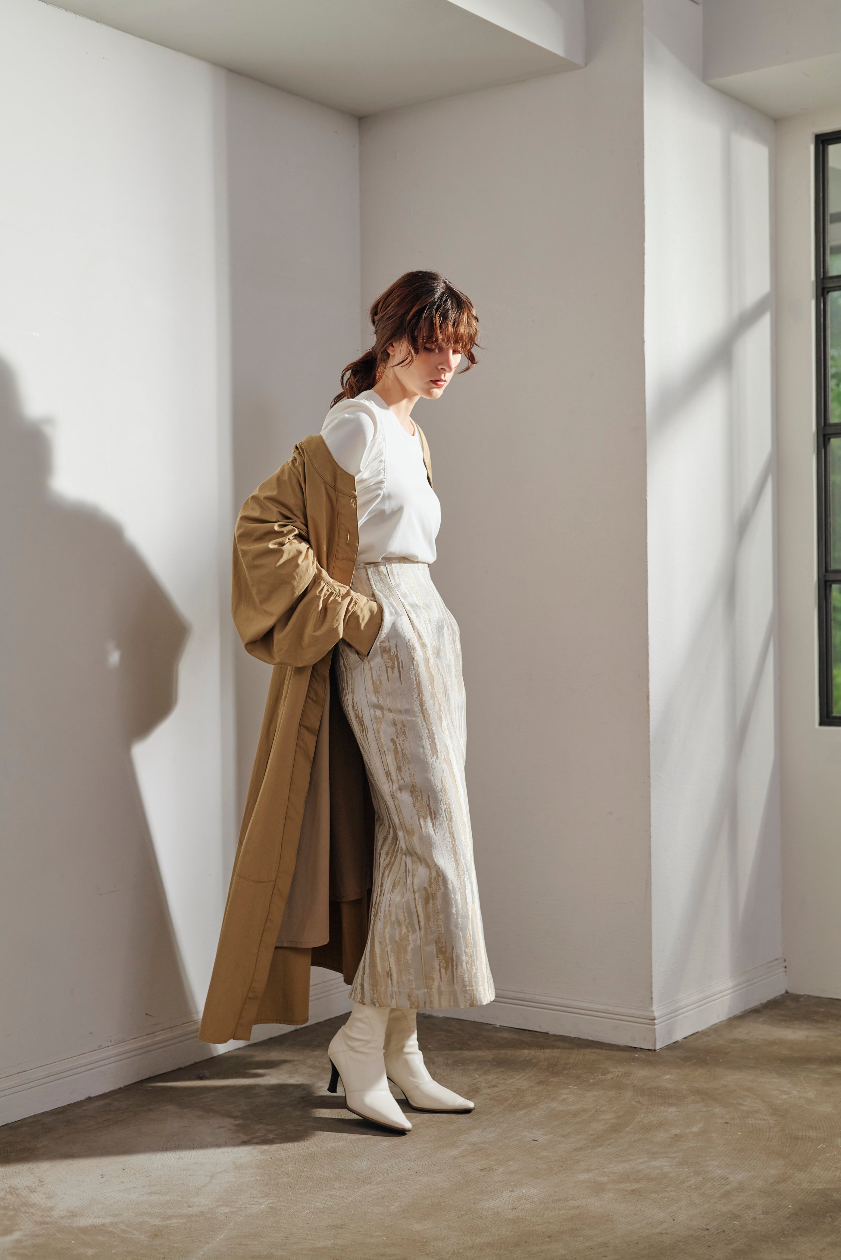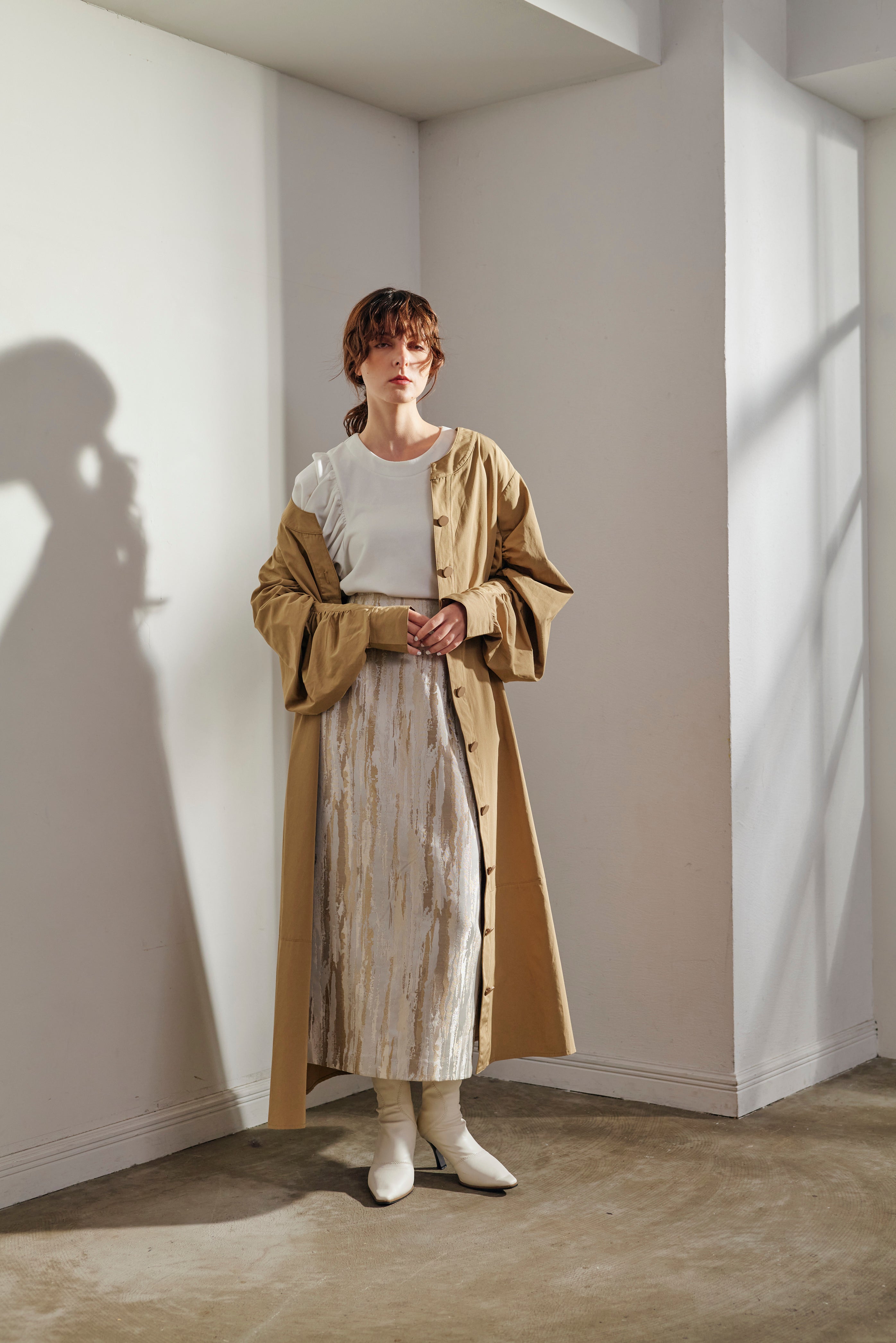 ハリのあるしっかりとした生地で仕立てているので、バックスタイルのぴしっと入ったセンタータックとヘムラインの立体感により羽織りとしても感度の高いスタイリングが完成します。