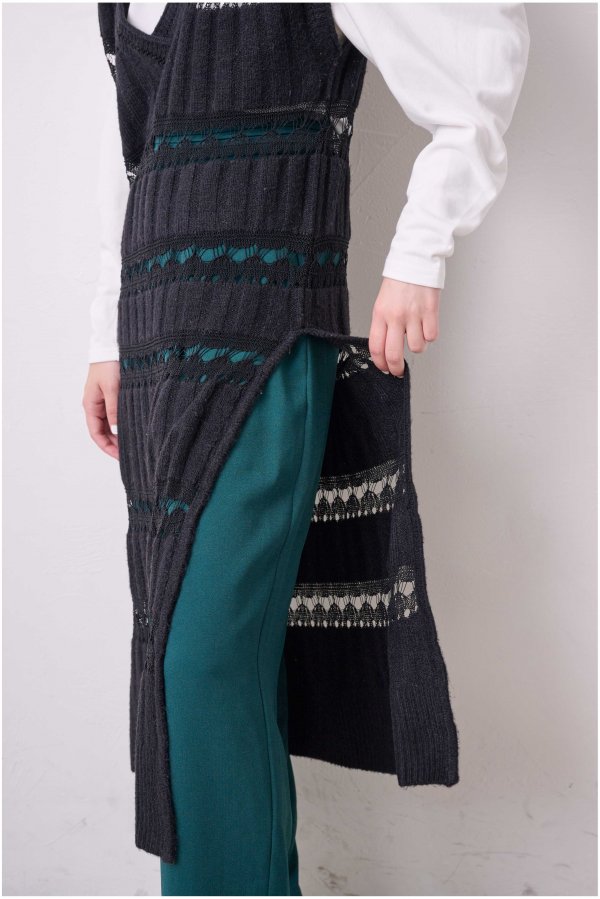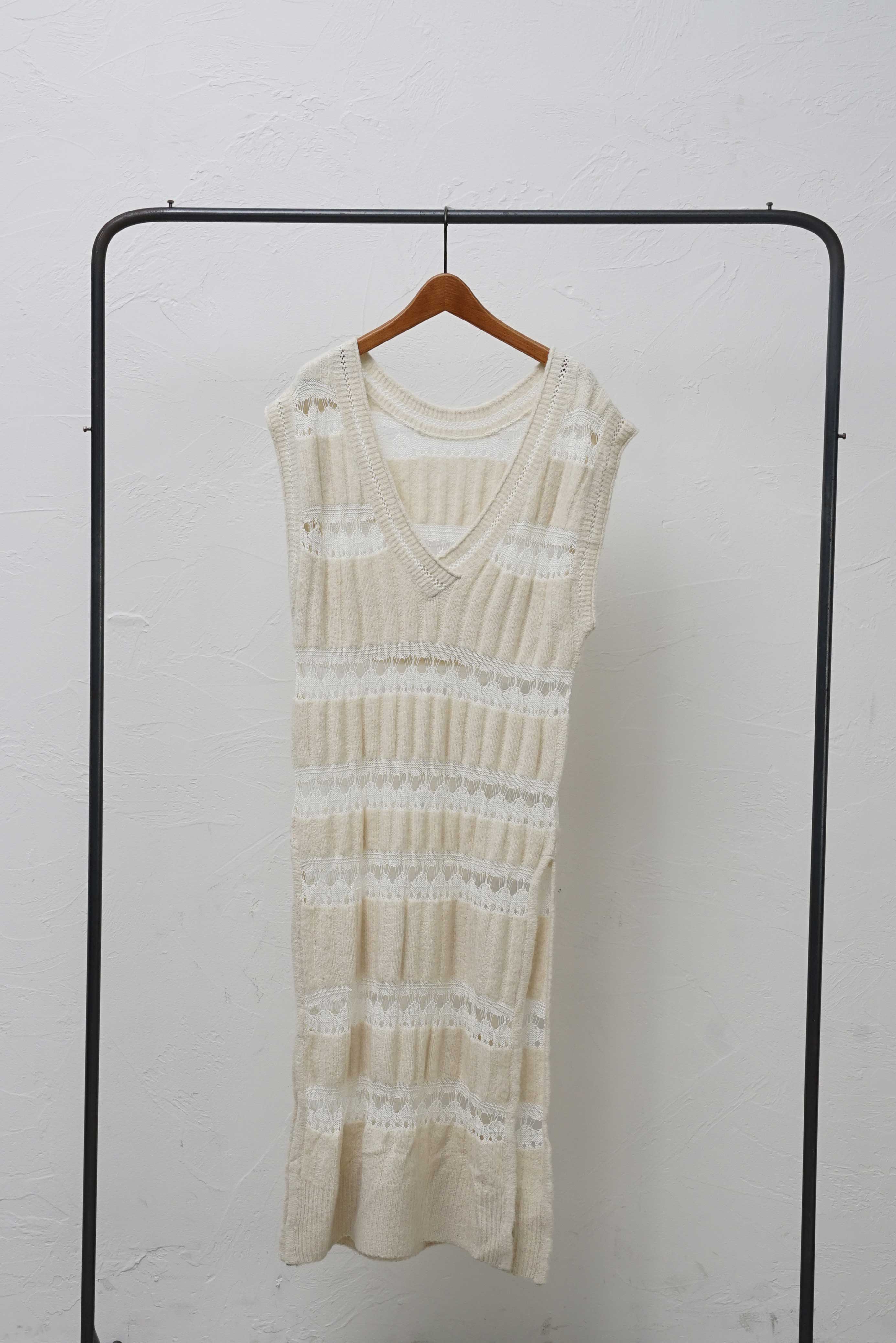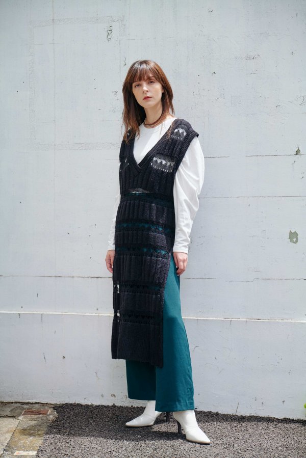 質感の異なる二種類の糸を組み合わせたレース見えの透かし編みがポイントになった異素材ロングニットベスト。
