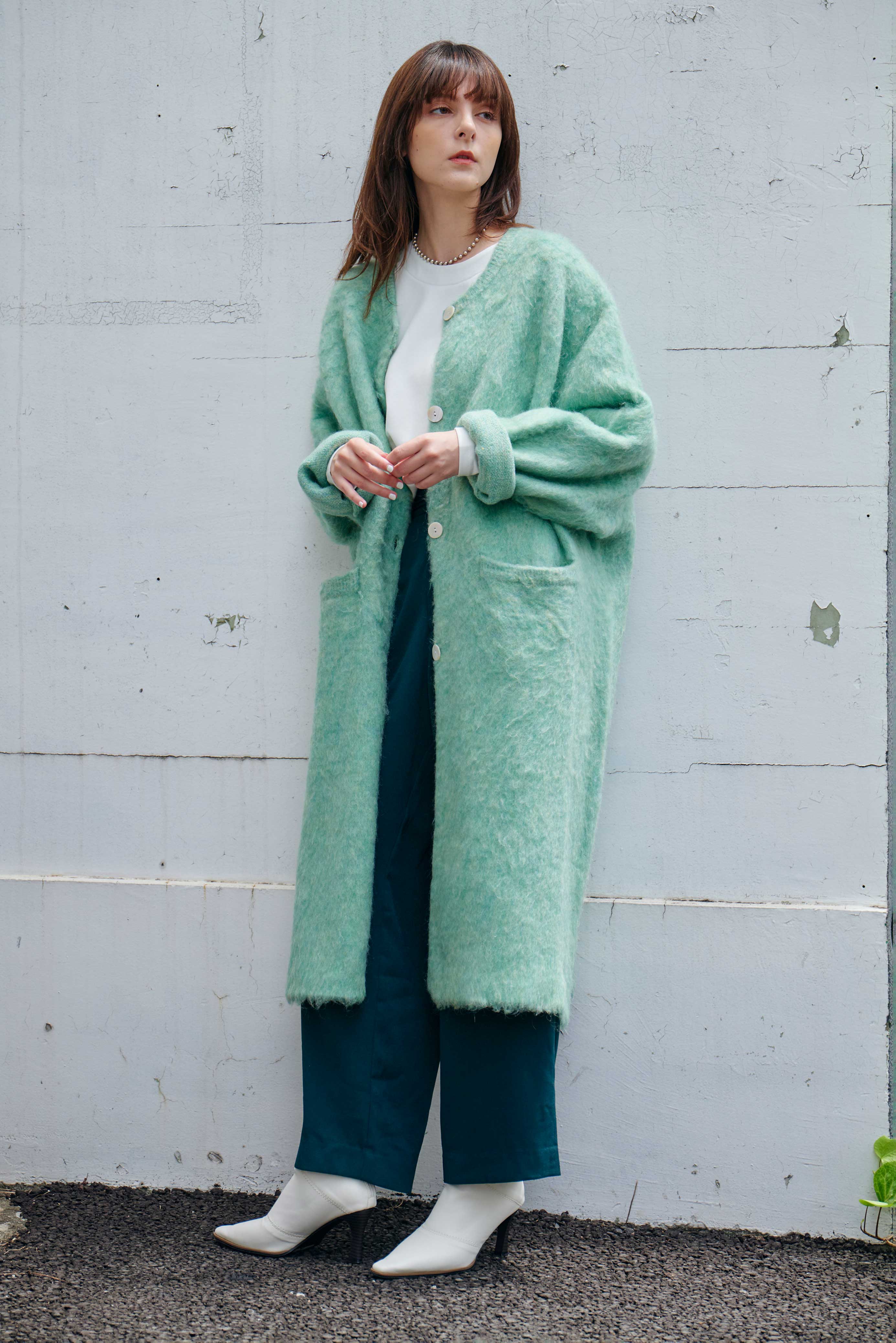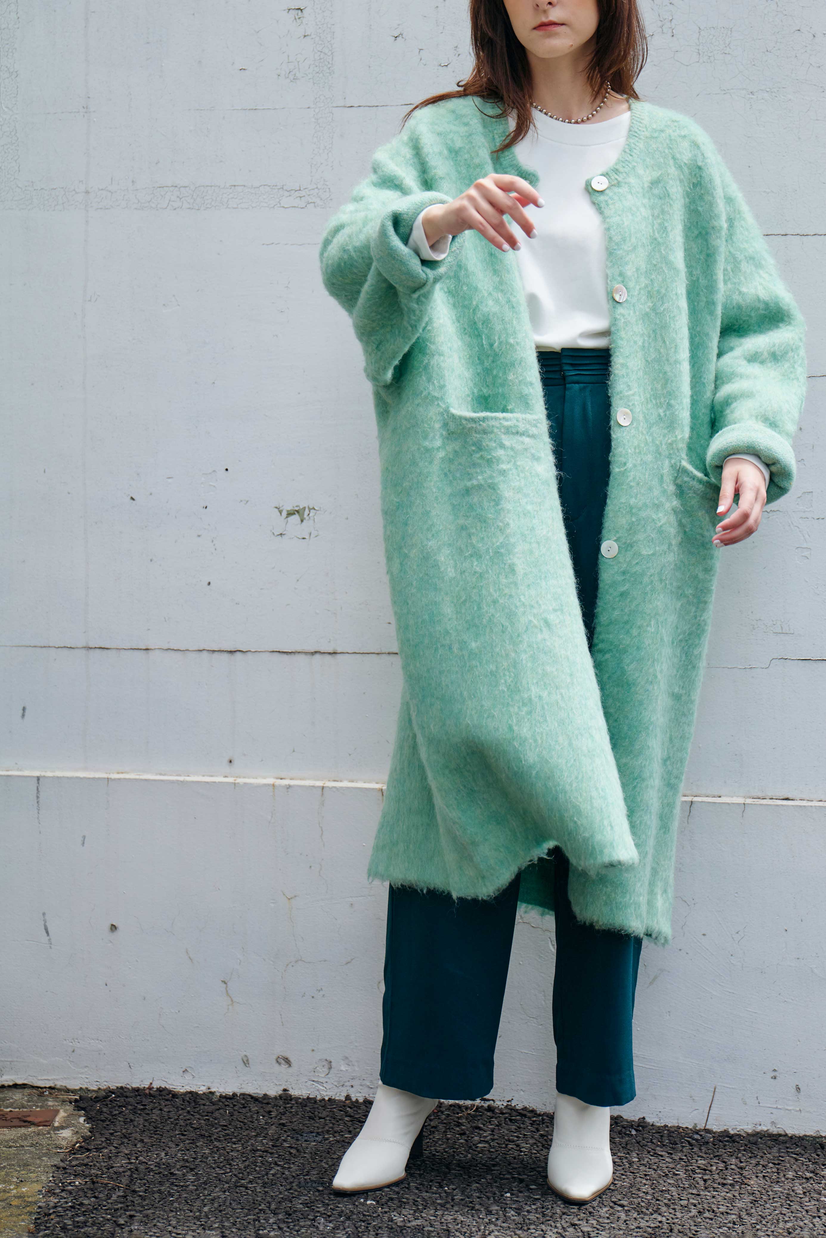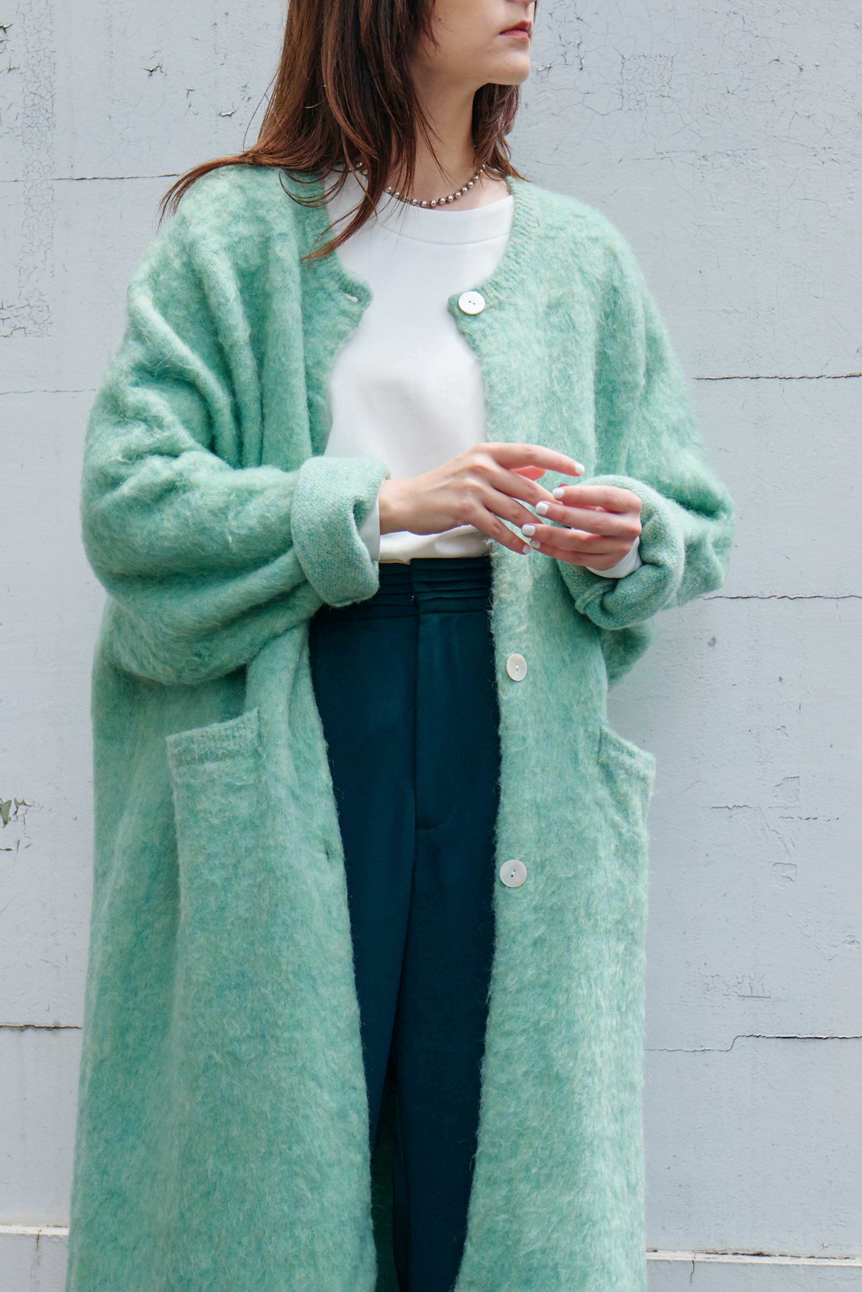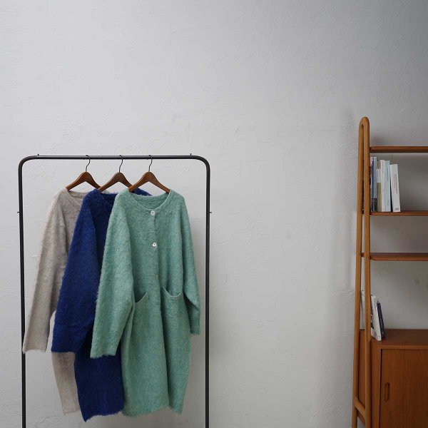 もちっとした質感のモヘアニットのロング羽織りコート。