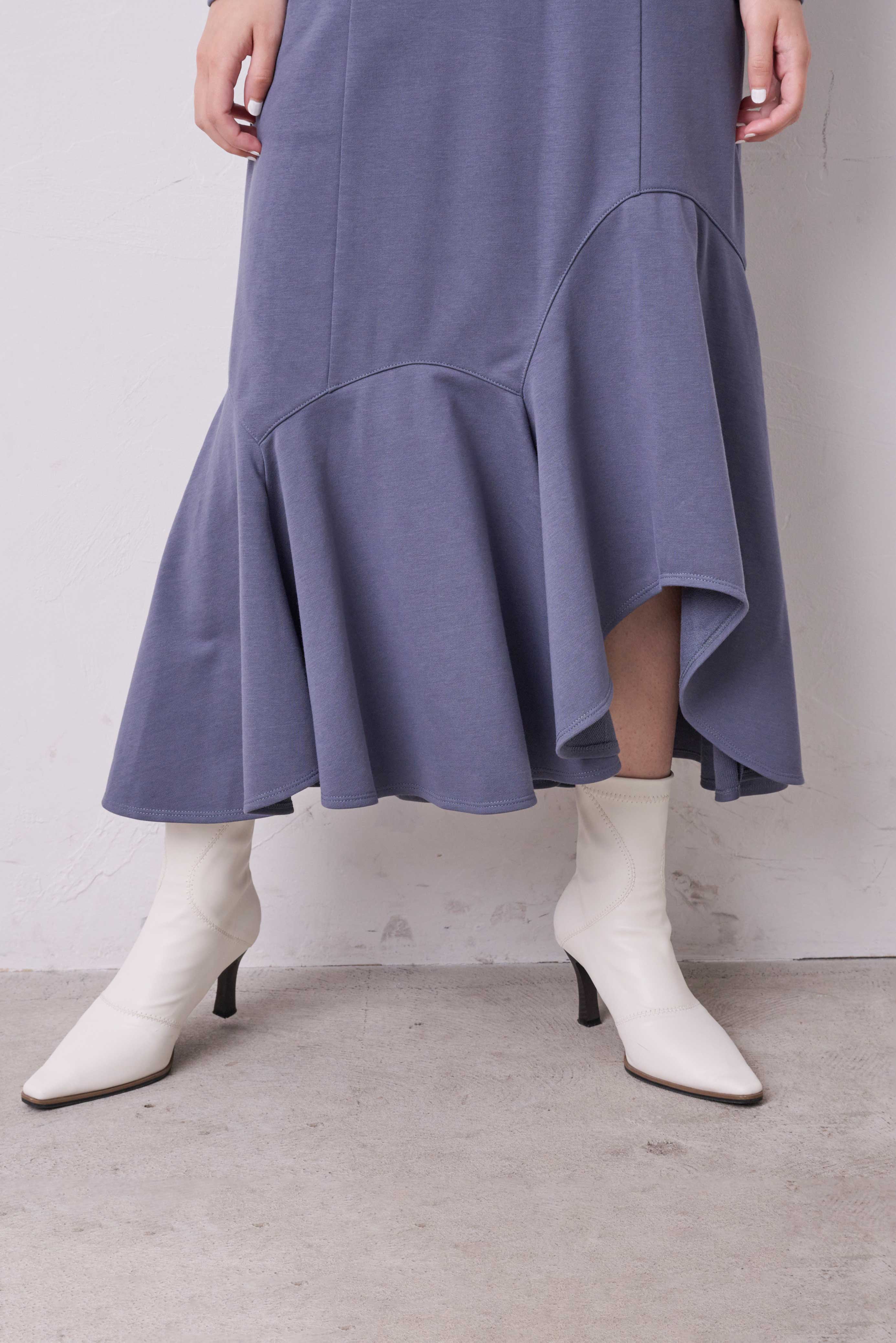 シルエットはマーメイドではあるものの腰回りにフィットするようなものではなく、本来の体のシルエットを拾わない程度の身幅に設定し、裾のドレープ分量を多くすることで緩急つけてボリューム感のあるシルエットに。