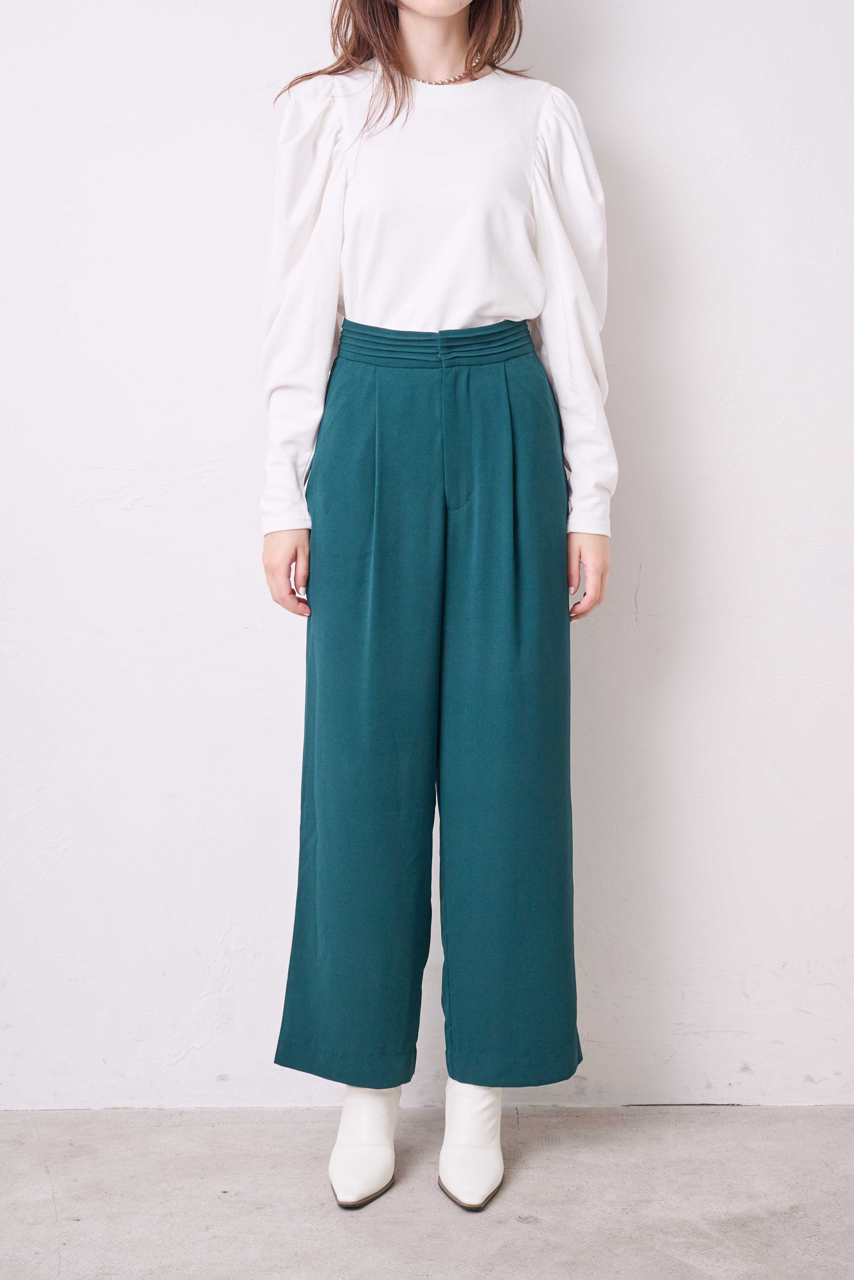 幅広くとったカマーベルトのようなウエストのデザインがトップスをインしたときのポイントになり、ナチュラルなスタイルアップがかないます。
