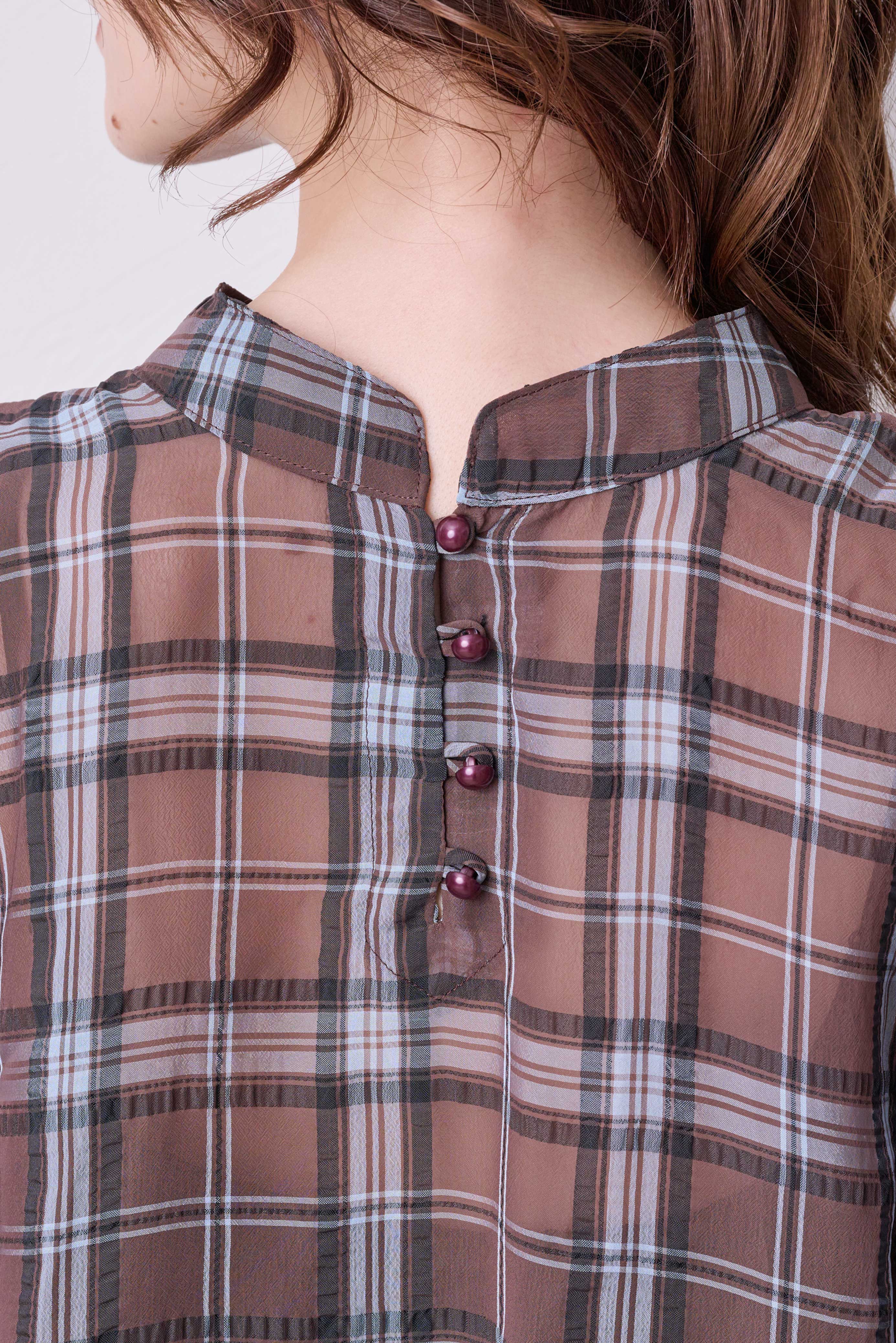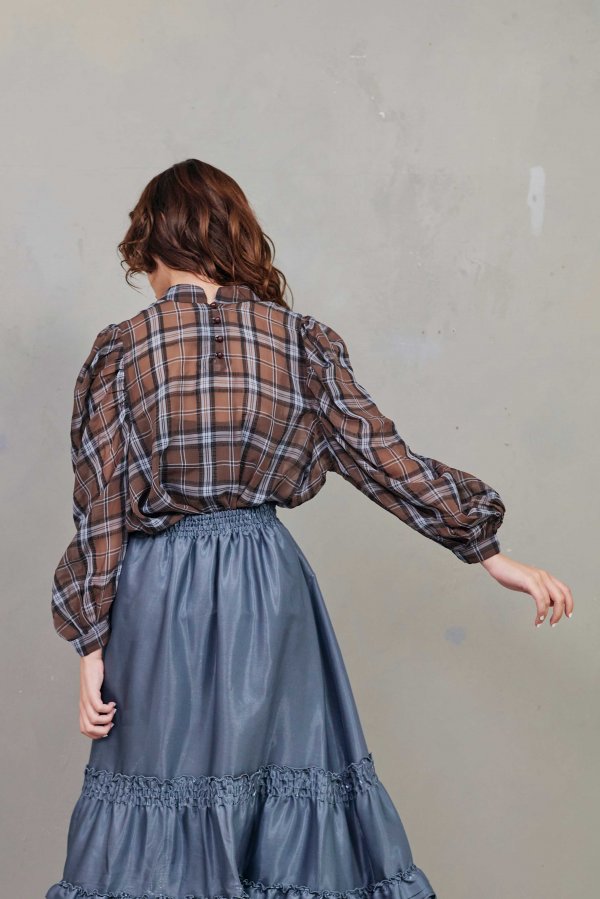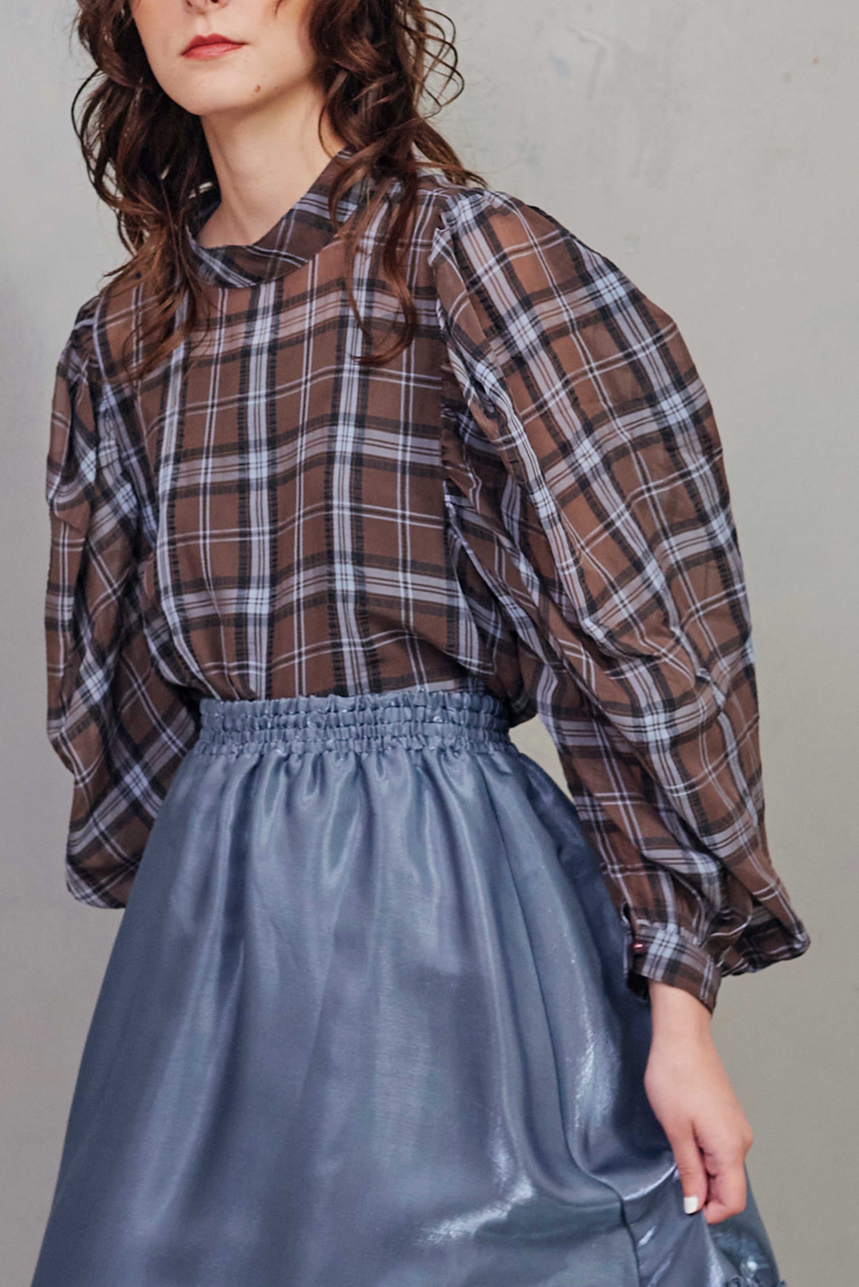 内側にぐっと入った肩線が華奢な肩幅を演出してくれるクラシカルな印象のチェックブラウス。