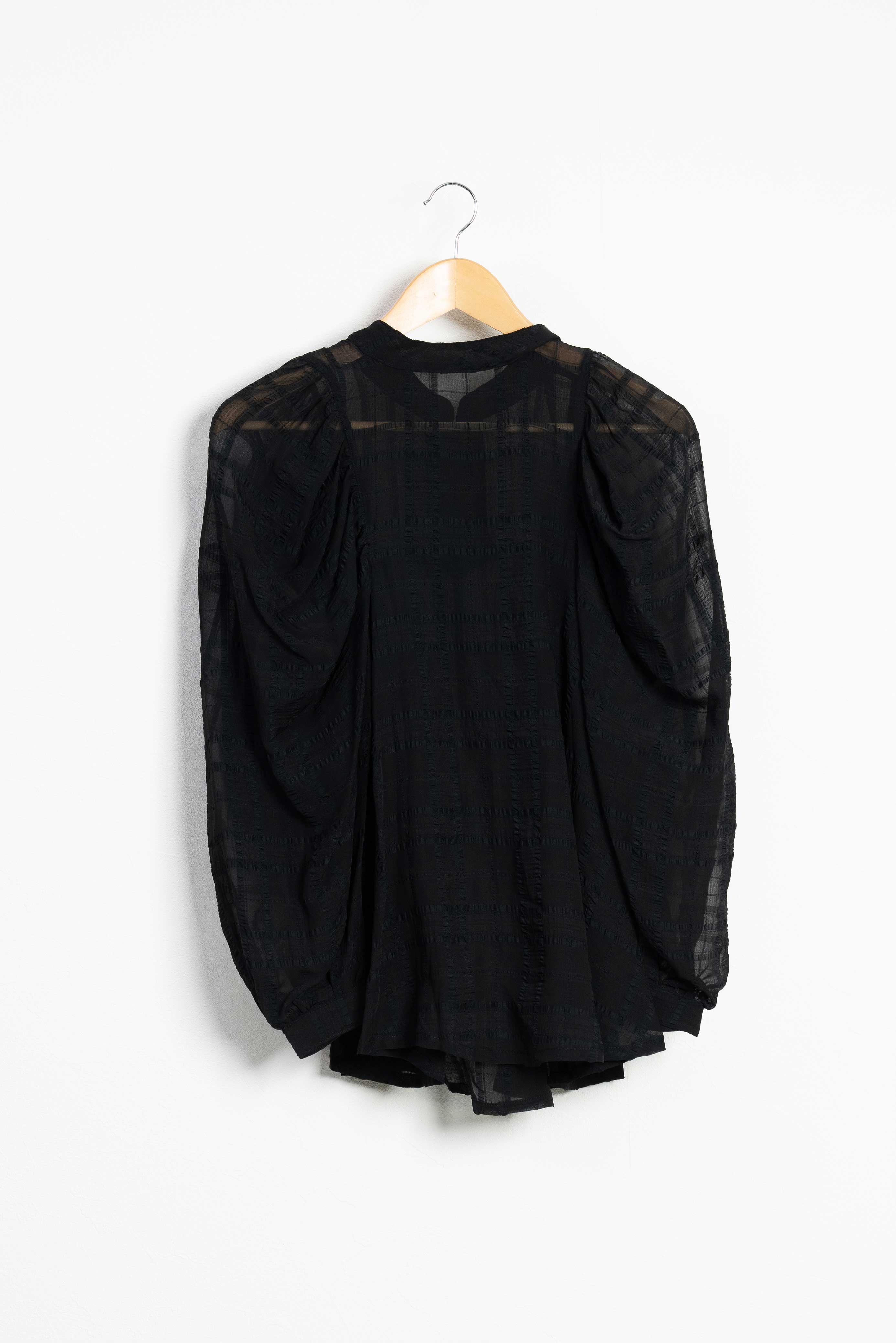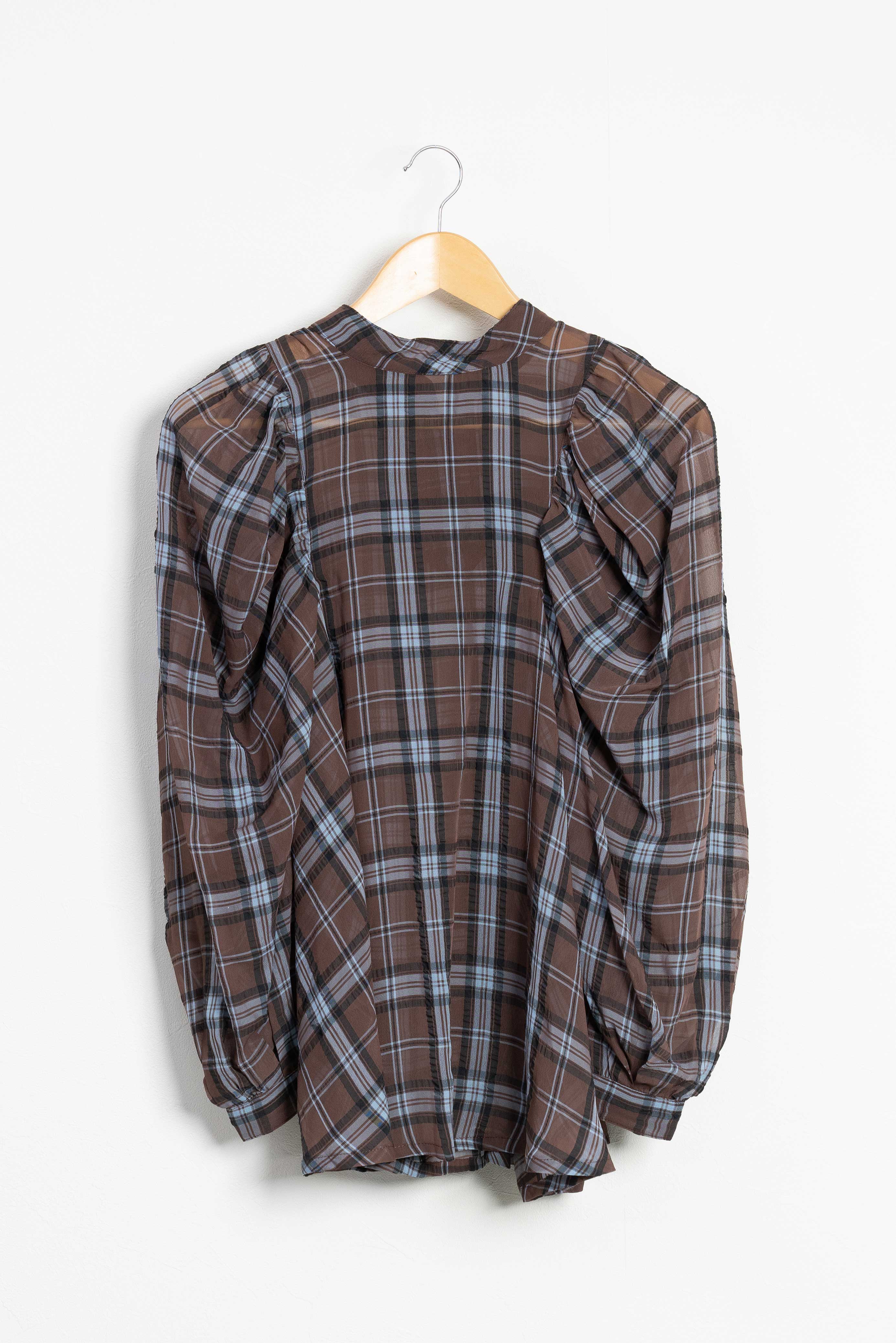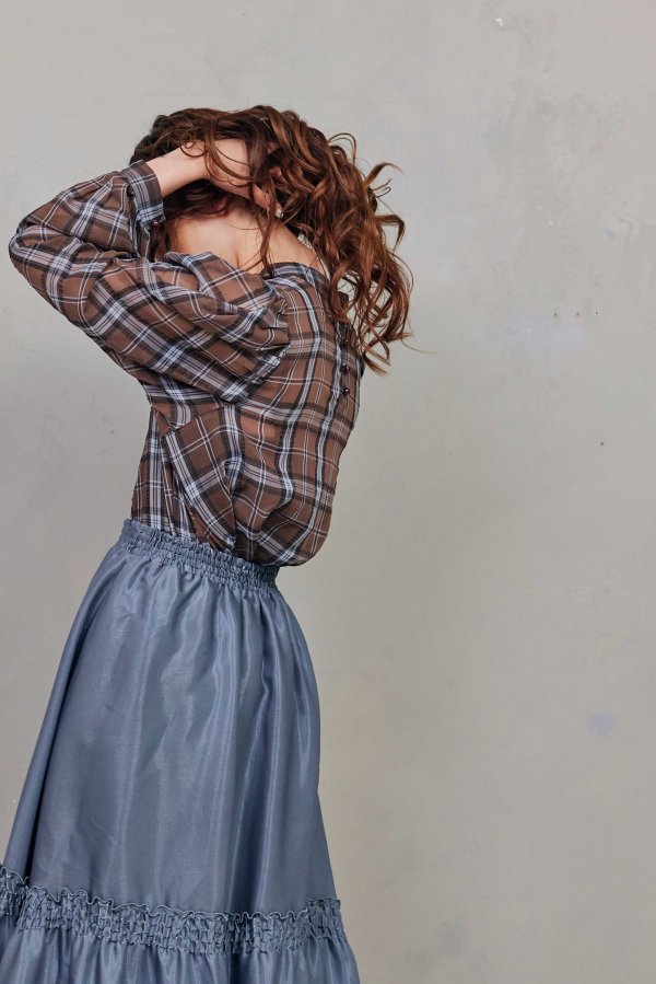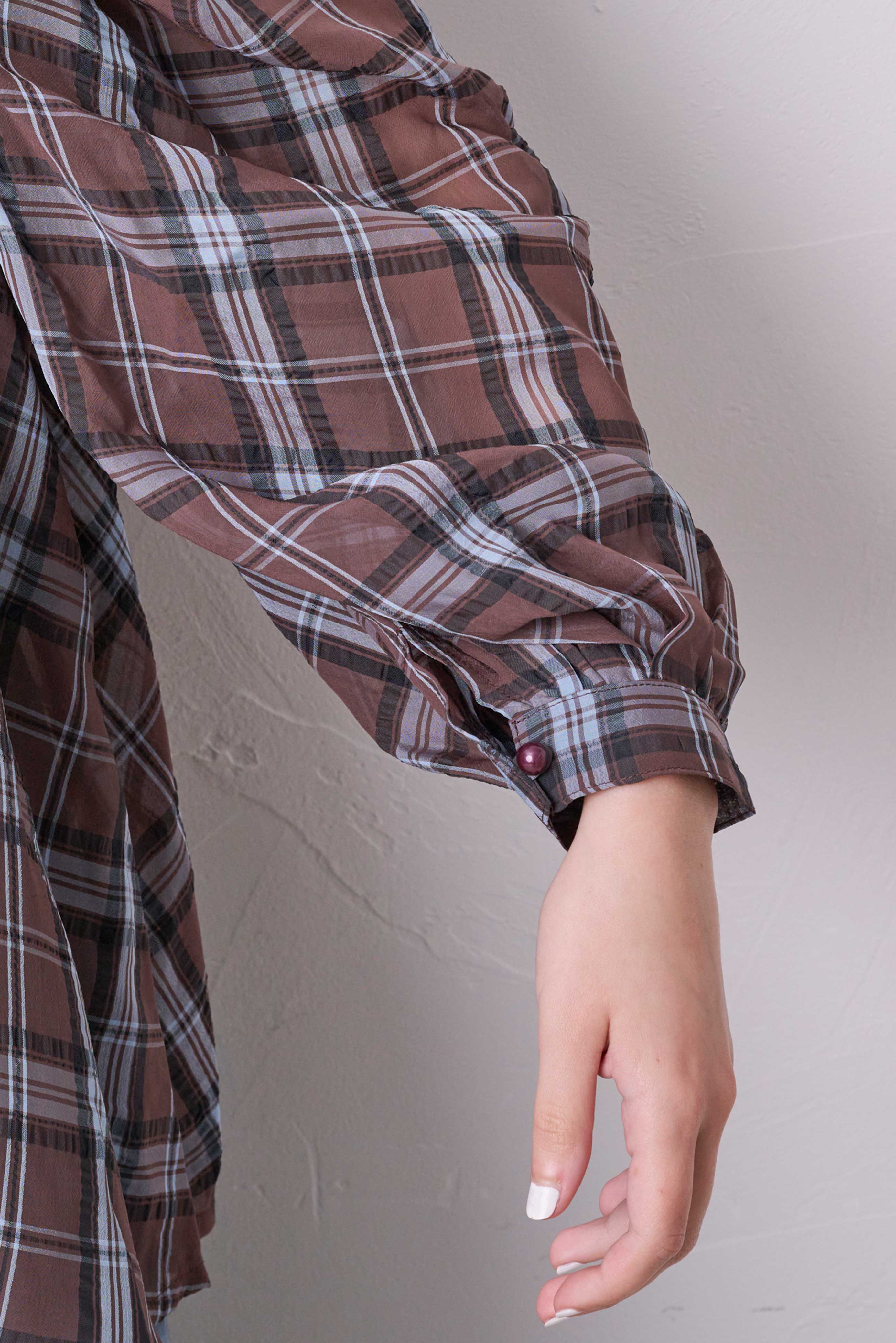 内側にぐっと入った肩線が華奢な肩幅を演出してくれるクラシカルな印象のチェックブラウス。