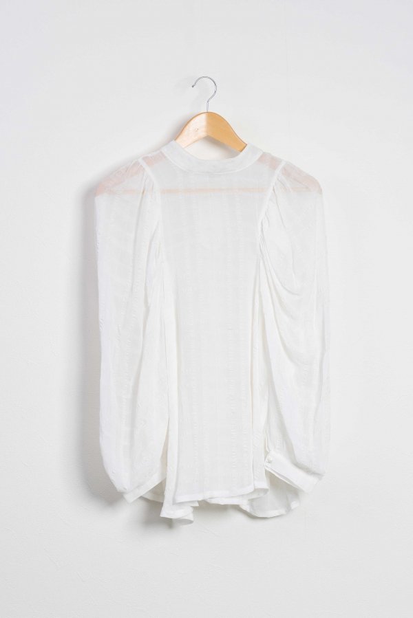 袖は立体的にぽわんとふくらむようにタックを入れており、やわらかなボリュームがあるフォルムなので、身幅はちっちゃくコンパクトに見えるようにアームホールの切り替えにしていますが実は身幅はゆったりめです。
